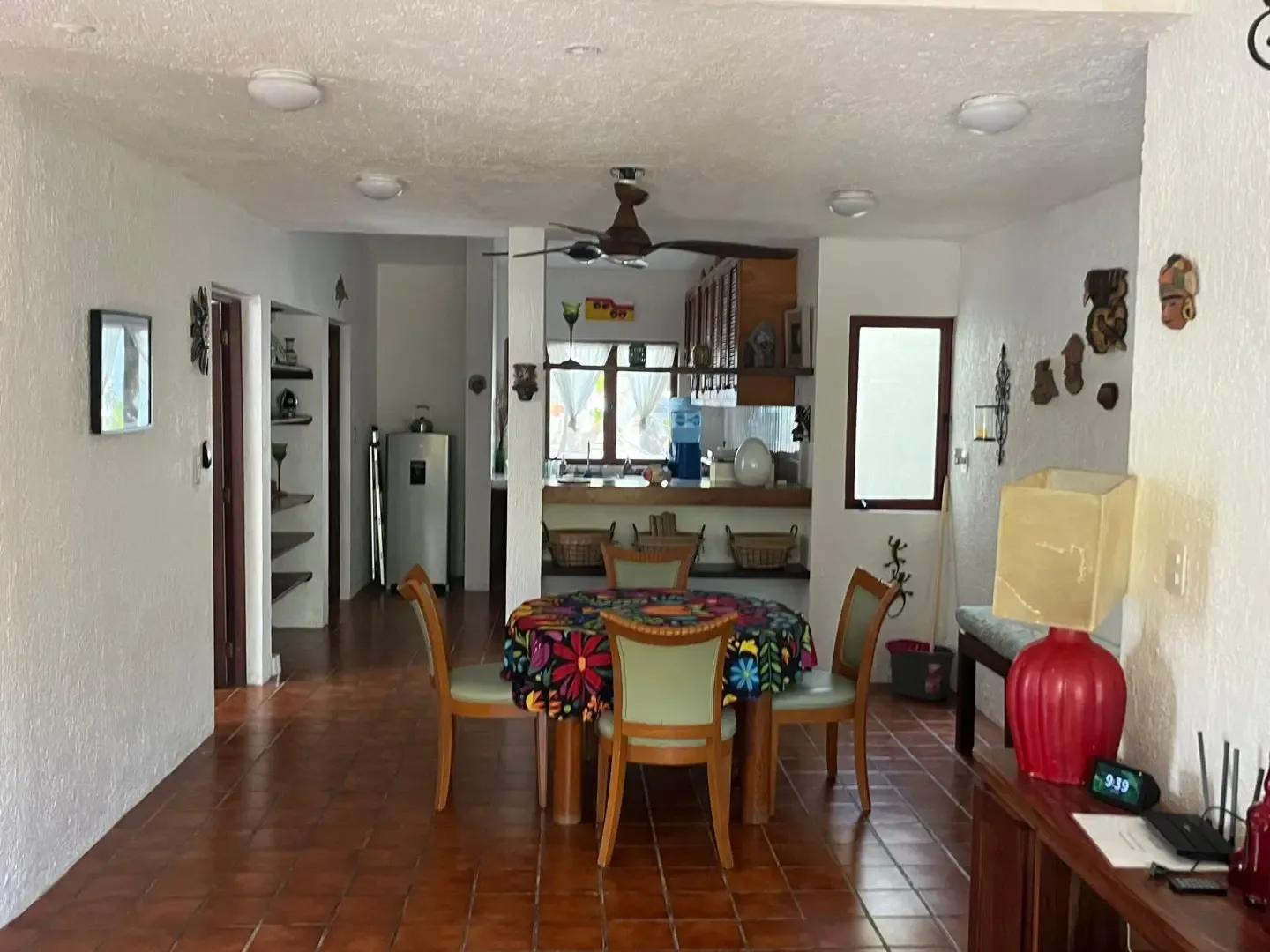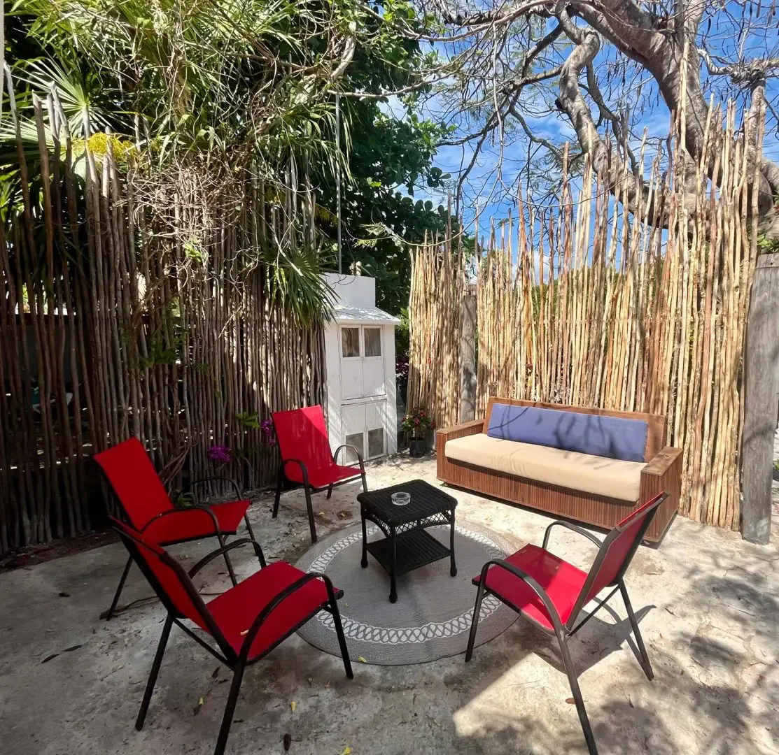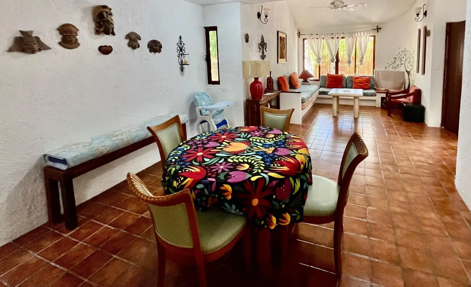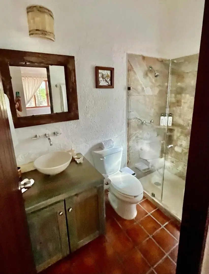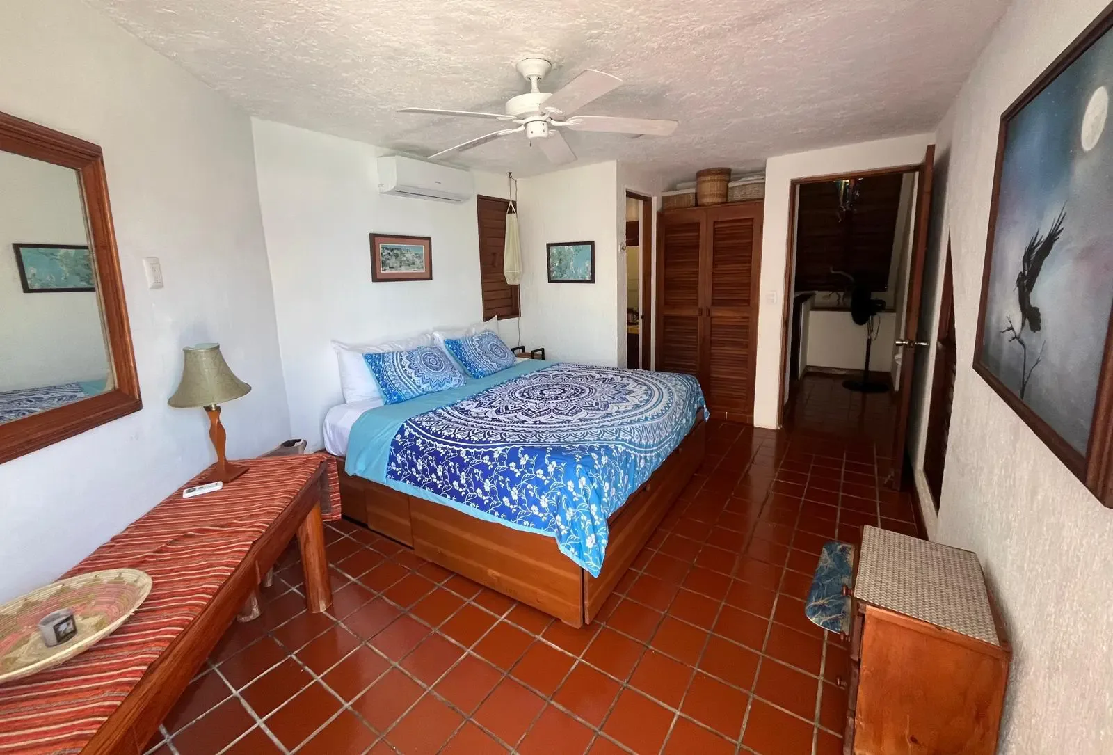 The main house includes three bedrooms, while a separate guest casita adds two more, providing accommodation for up to 11 adults and 2 children. The main house features a master bedroom with a king bed and a trundle, a guest room with a king bed and a trundle, and a third room with a double and a single bed. The guesthouse contains one bedroom with a king-size bed and another with two twin beds that can be converted into a king.