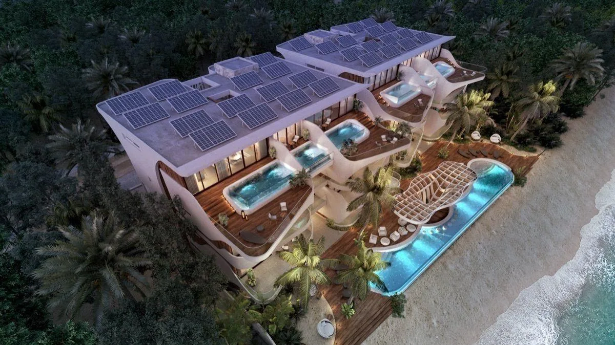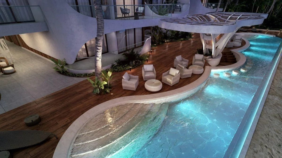 This condominium development is located on the beachfront of Tankah Bay, northeast of Tulum and near Mayan ruins. The complex is surrounded by white sand beaches and clear turquoise Caribbean waters. The area offers proximity to the ruins of Tulum and Coba, as well as numerous cenotes scattered throughout the jungle. The location is approximately a 45-minute drive from Playa del Carmen and 90 minutes from the airport.