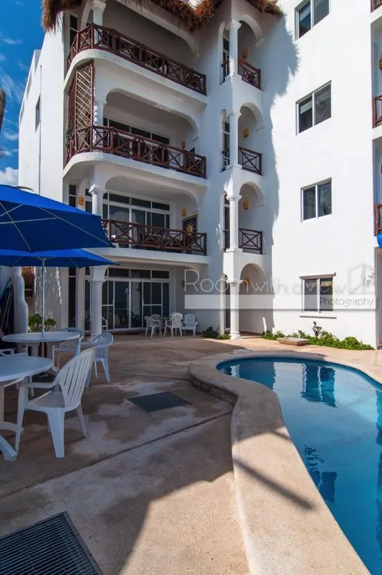 The Playa Caribe complex offers resort-style amenities including a community pool, daily maid service, high-speed internet, pool towels, and dedicated parking for each unit. The building has a reverse osmosis water system providing clean drinking water from the tap. An on-site rental management handles bookings and guest services.