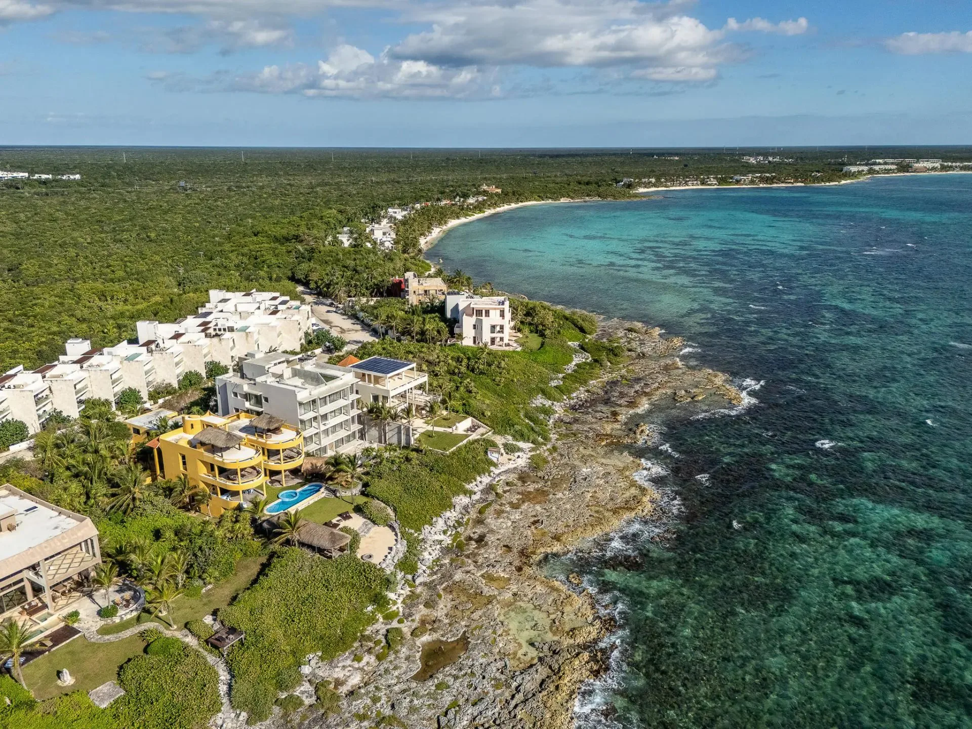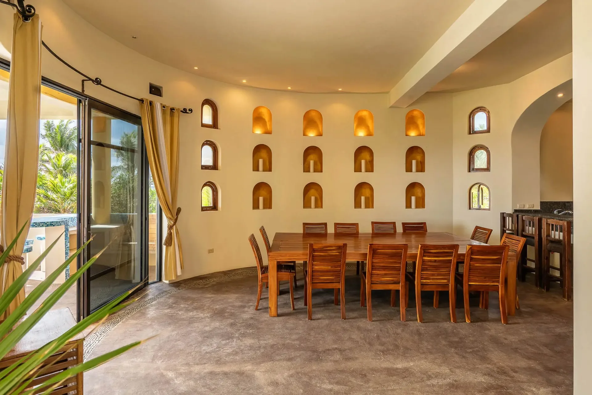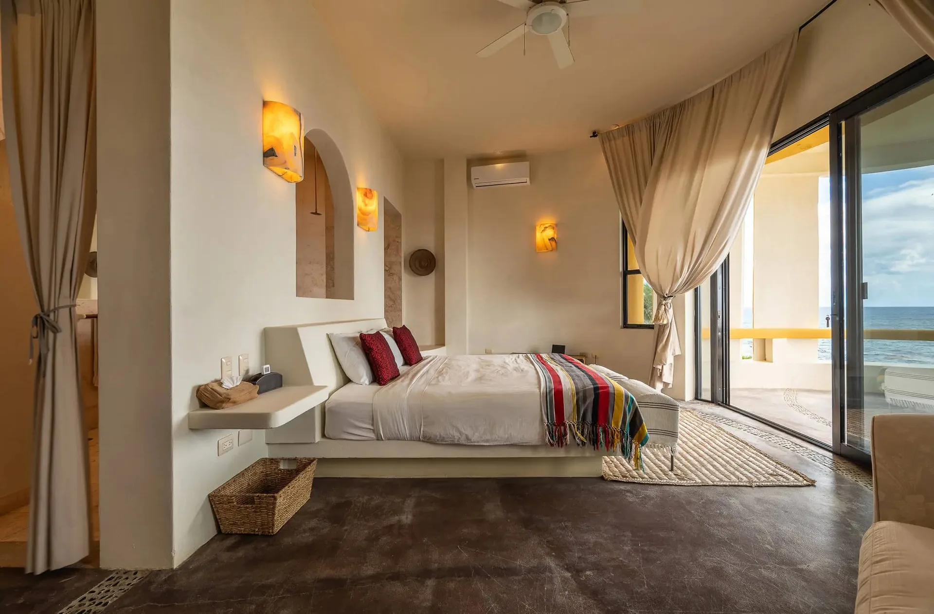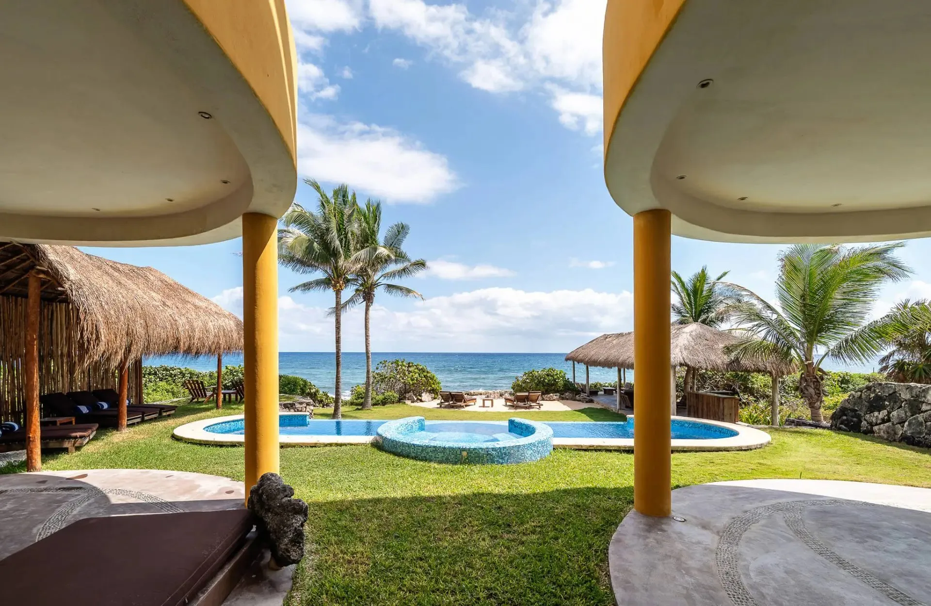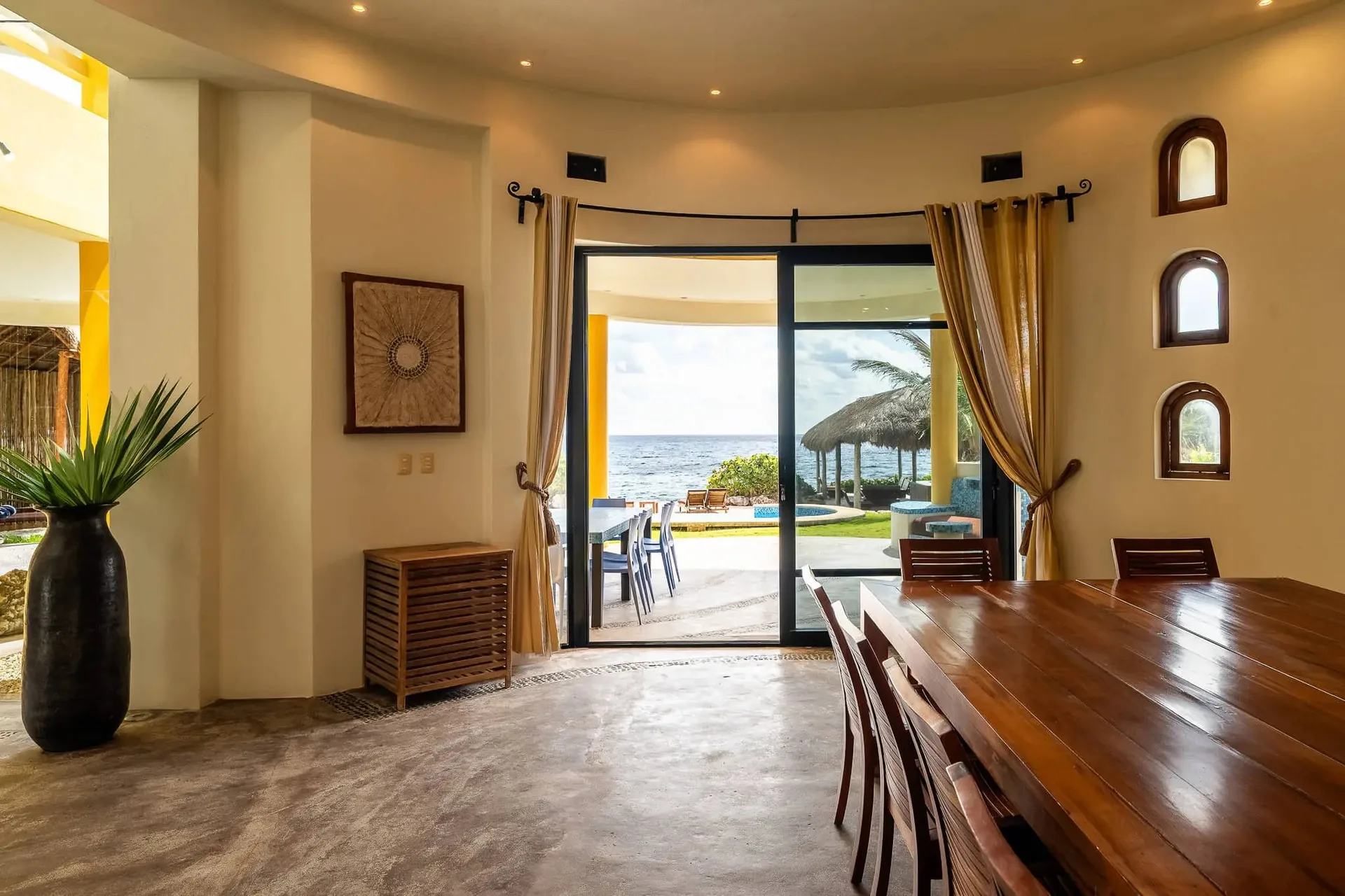 This luxury oceanfront villa near Akumal features 9 spacious ensuite bedrooms, with the flexibility for a 10th, and a private garden. The interiors have a colonial palace-like design with spa-inspired baths, premium finishes, winding staircases, and soft, warm lighting.