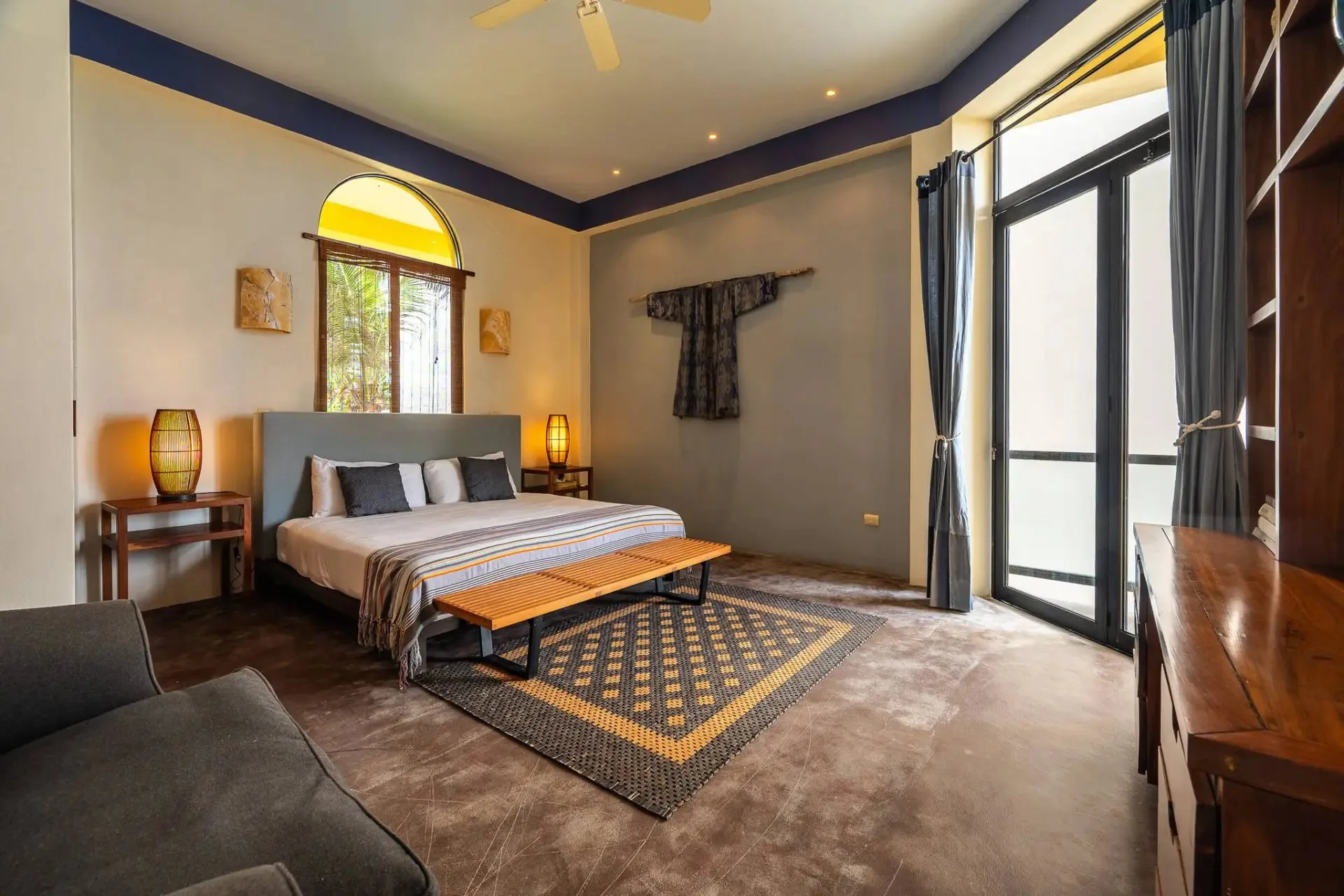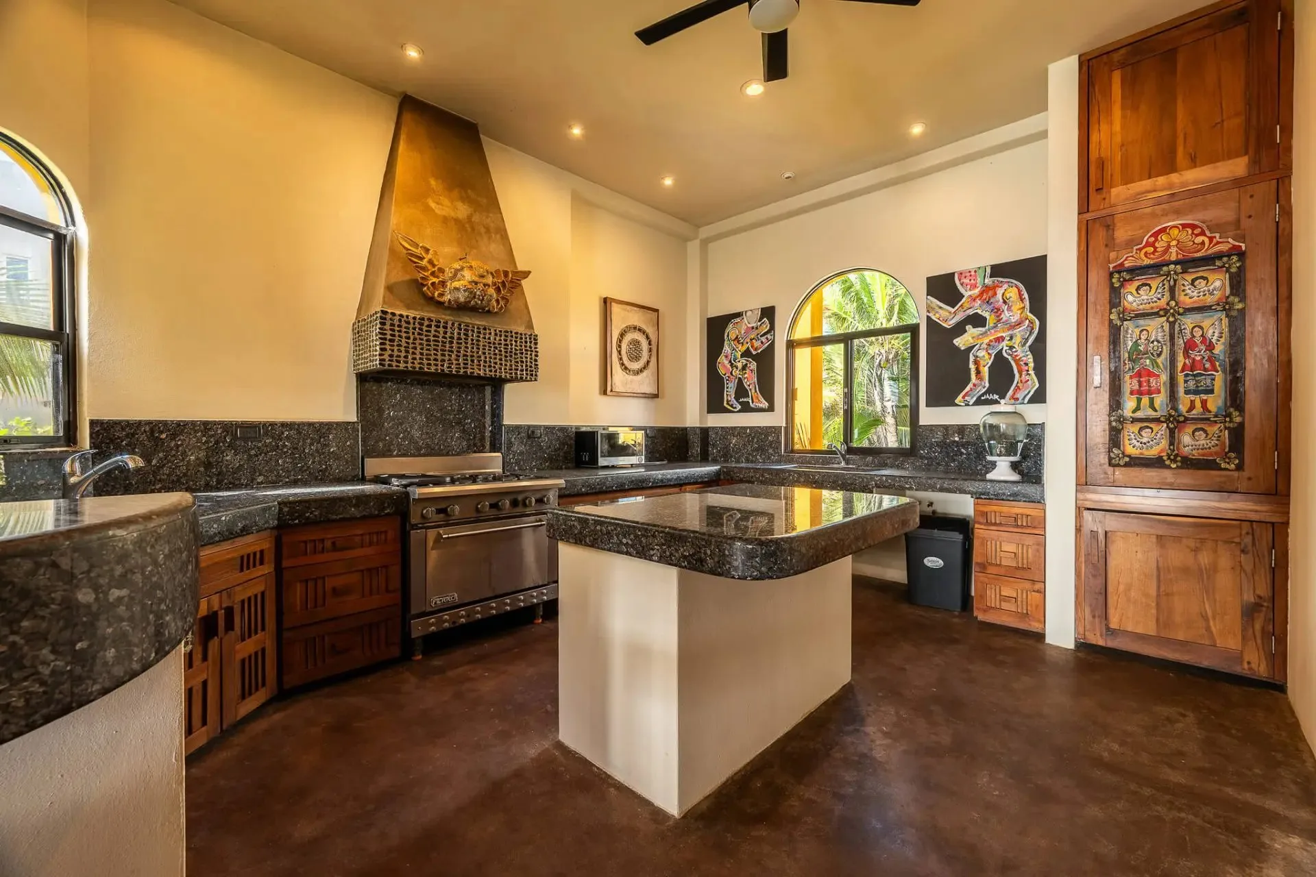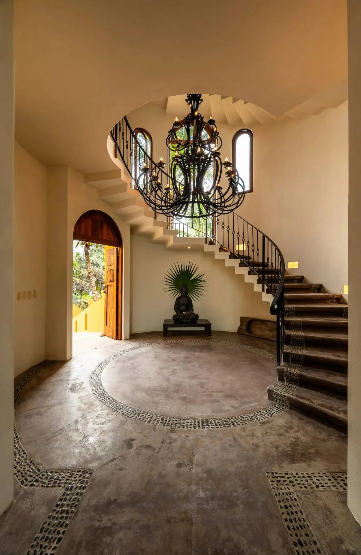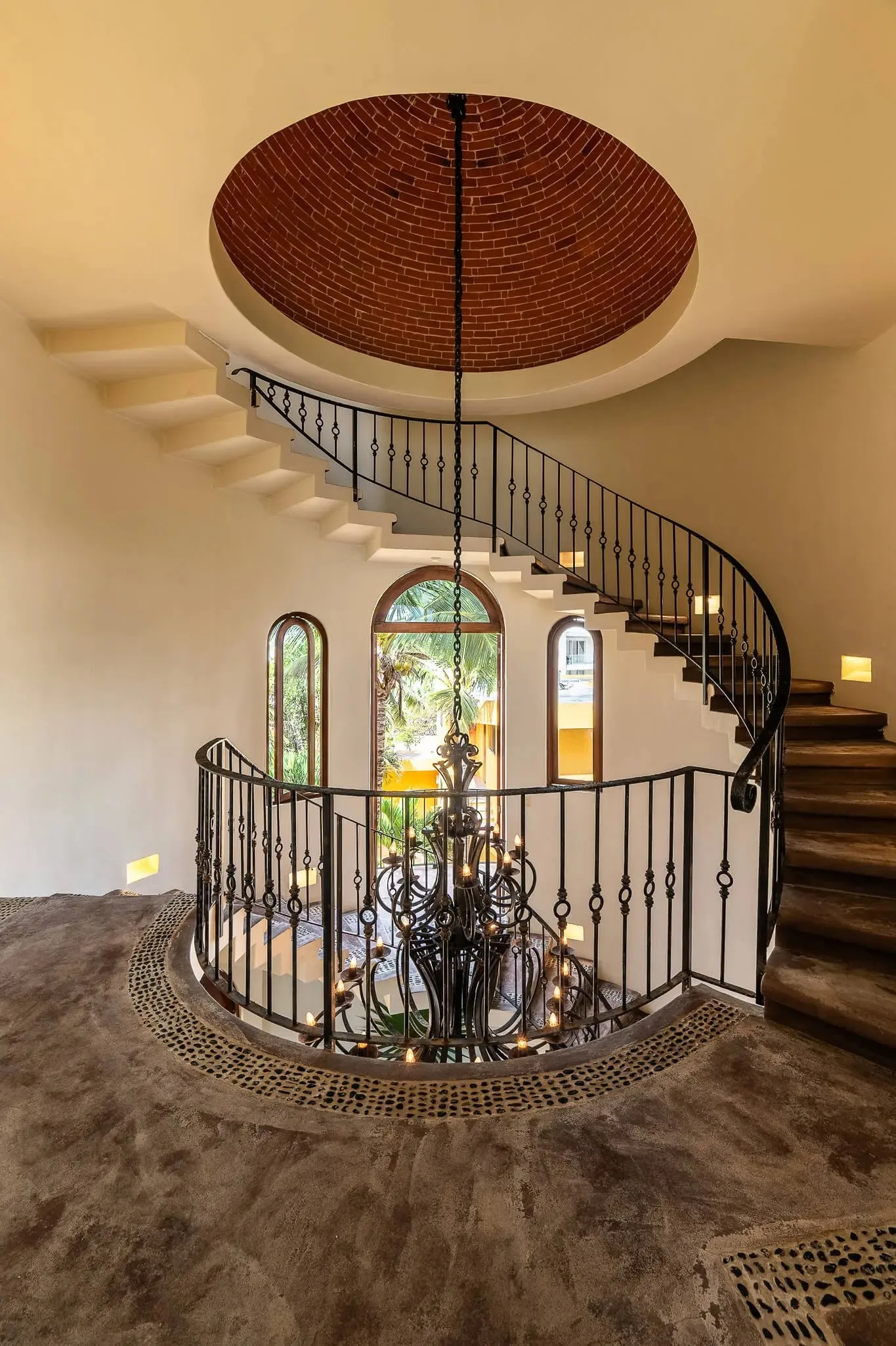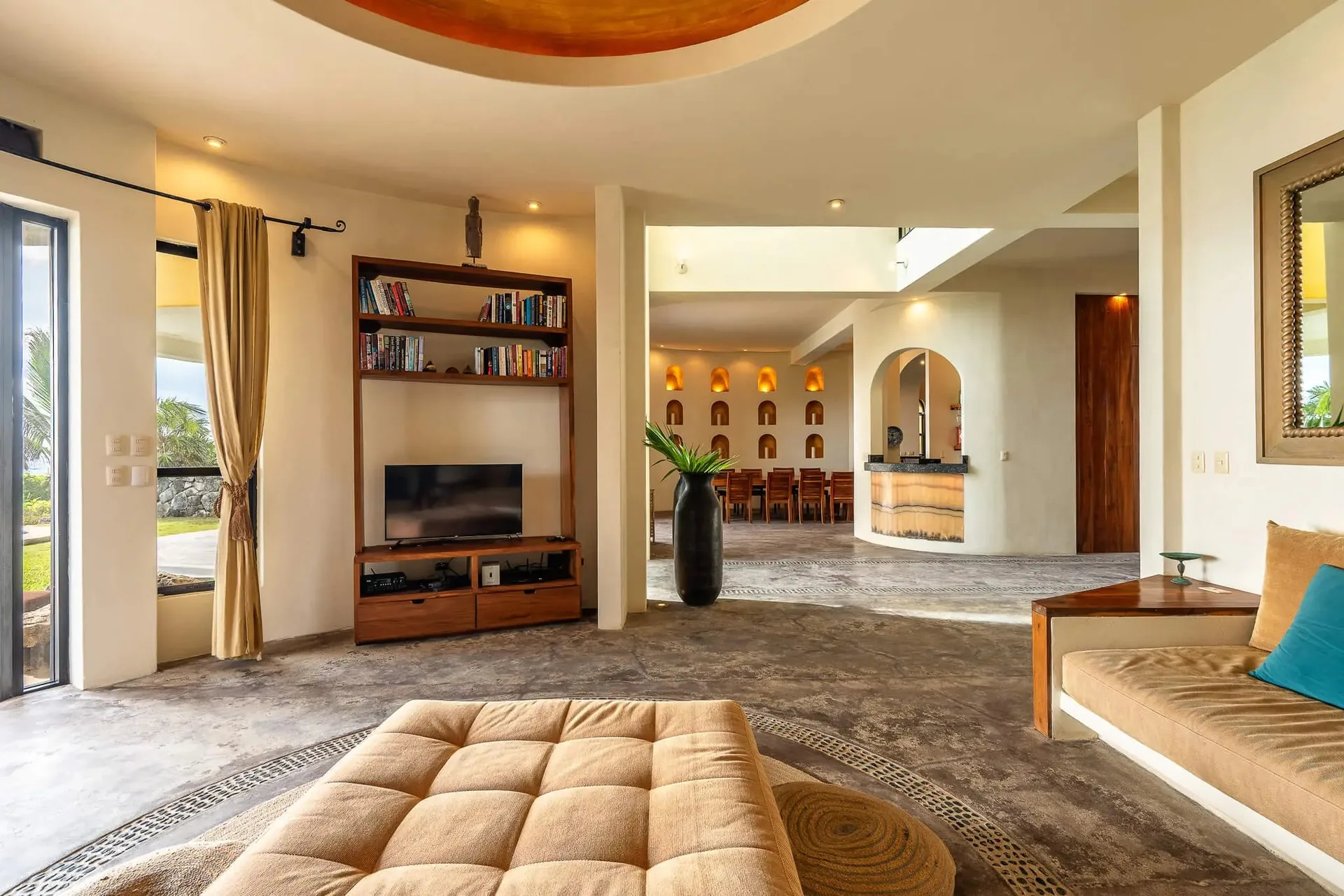 This luxury oceanfront villa near Akumal features 9 spacious ensuite bedrooms, with the flexibility for a 10th, and a private garden. The interiors have a colonial palace-like design with spa-inspired baths, premium finishes, winding staircases, and soft, warm lighting.