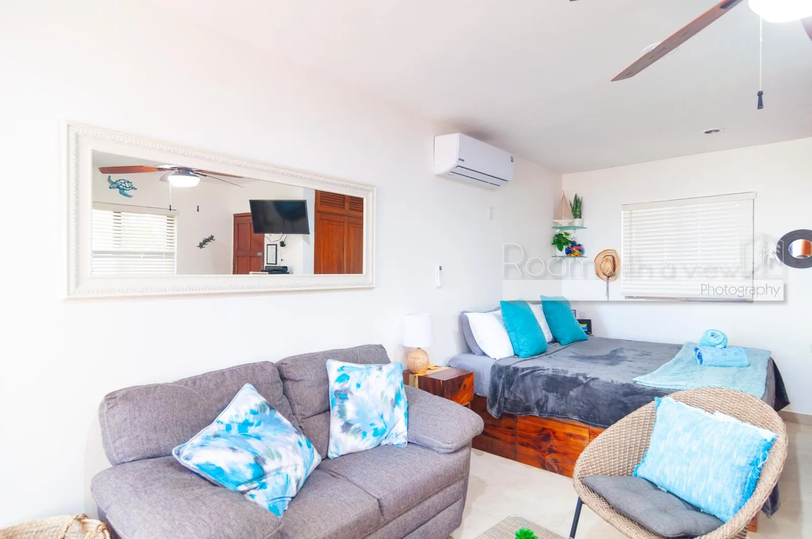The casita features a terrace with tropical surroundings and bright interiors with air conditioning and ceiling fans. It is fully furnished and turnkey-ready, with storm shutters for added safety. The professionally maintained beachfront complex offers beach access with shaded palapa areas and unassigned parking.