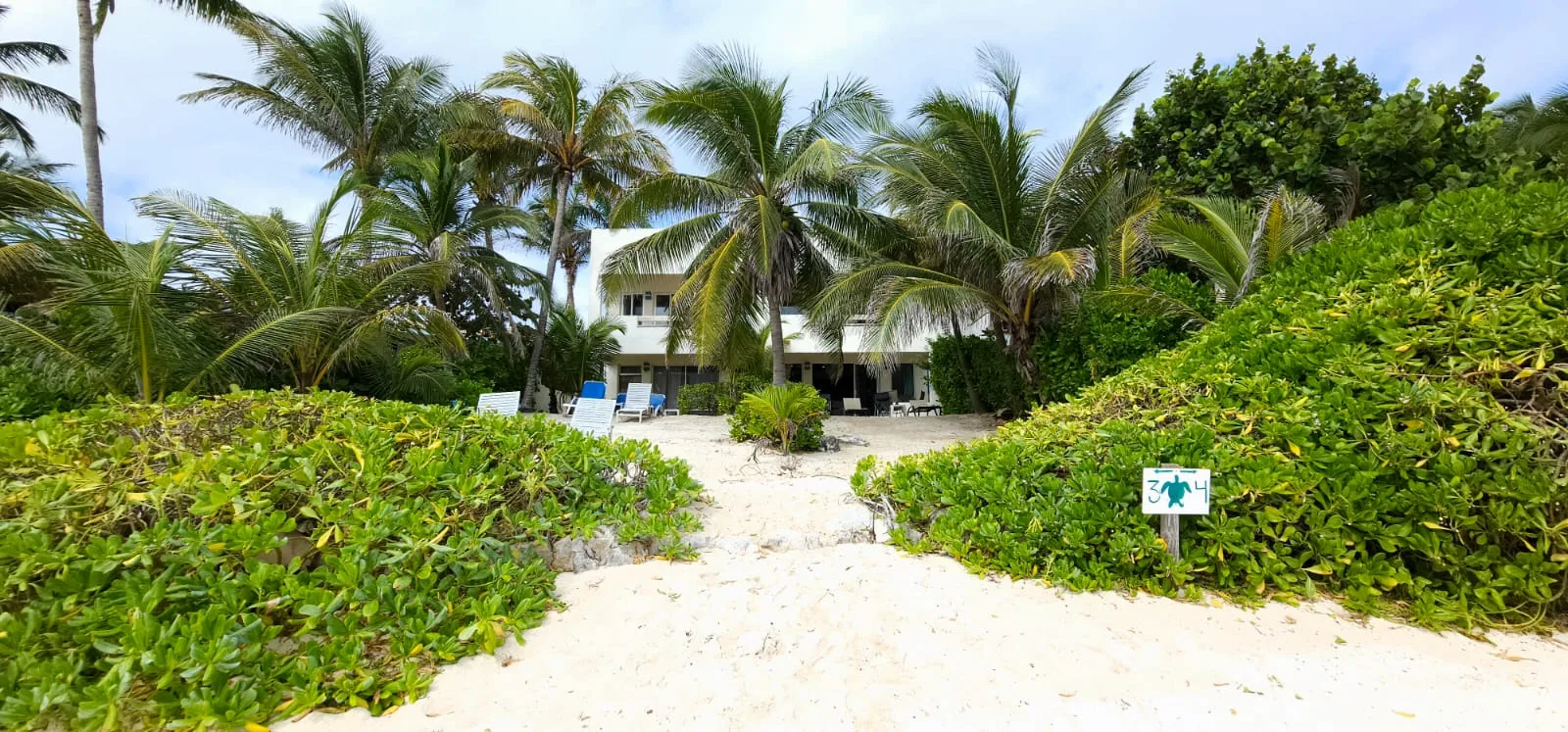 The front yard invites relaxation while enjoying the stunning ocean view, with soft white sand stretching to the horizon. A unique feature is the rooftop area, which offers a panoramic view of the bay.