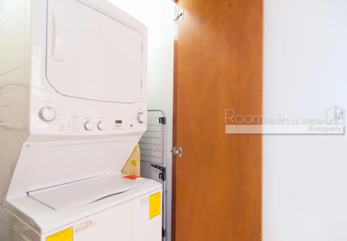 The residence features a spacious open-concept layout with a fully equipped kitchen, high-end appliances, and a bright, airy living area that opens onto a balcony with a swimming pool view. The unit is fully furnished and ready for occupancy, complete with air conditioning, a washer and dryer, and energy-efficient hurricane-resistant window film.