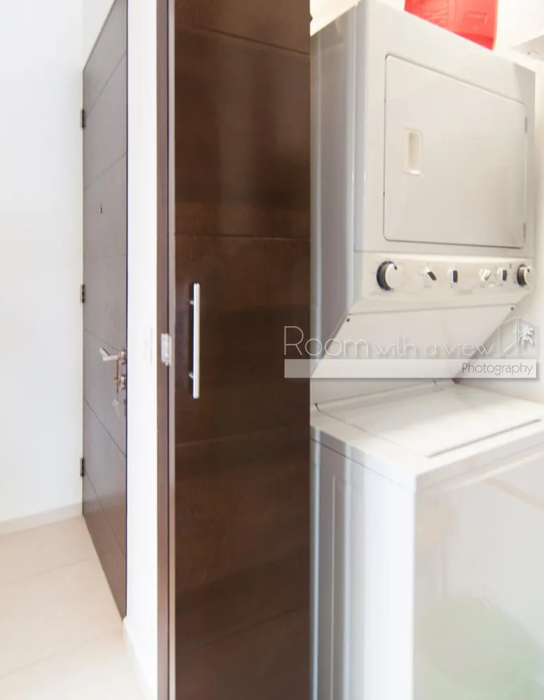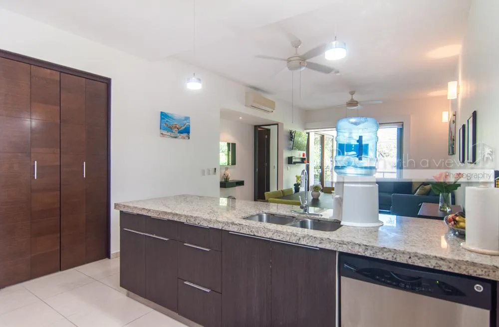 This bright and airy 2-bedroom, 2-bath condo at TAO Residential in Akumal features an open-concept design. The kitchen includes premium appliances, and there is a spacious living and dining area along with a laundry room. Large sliding glass doors in the living room and primary bedroom open onto a covered balcony with jungle views. The condo is fully equipped and move-in ready, offering ample storage, tile floors, and high-end finishes.