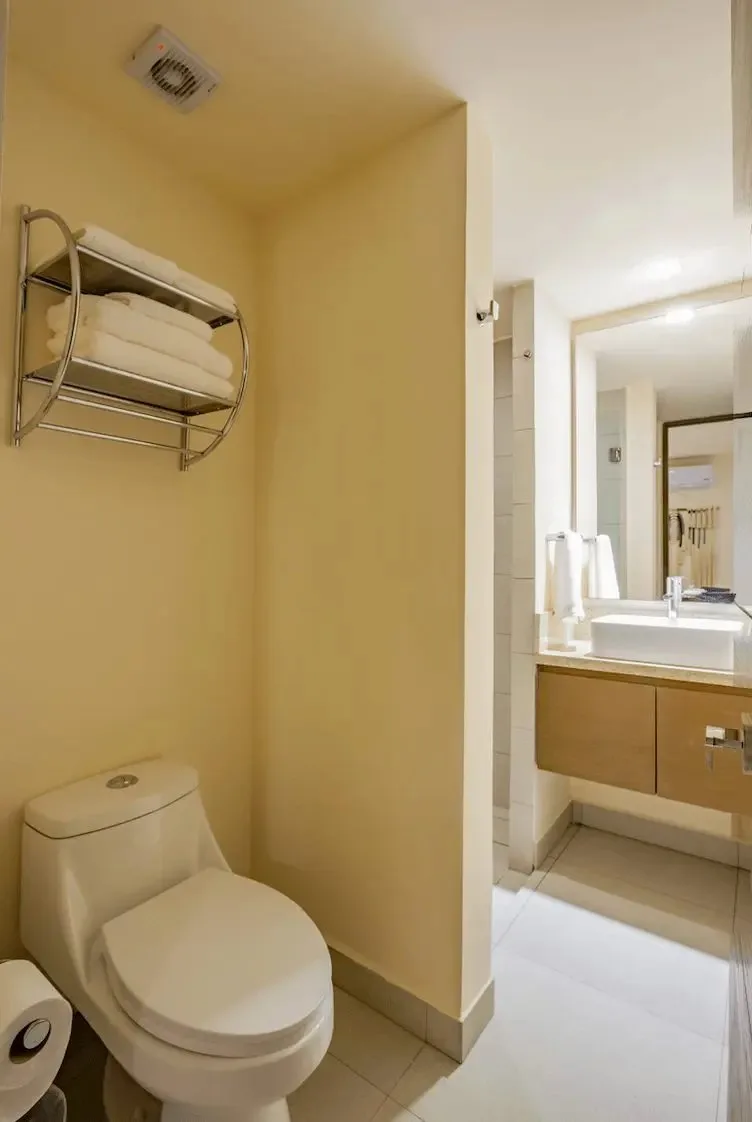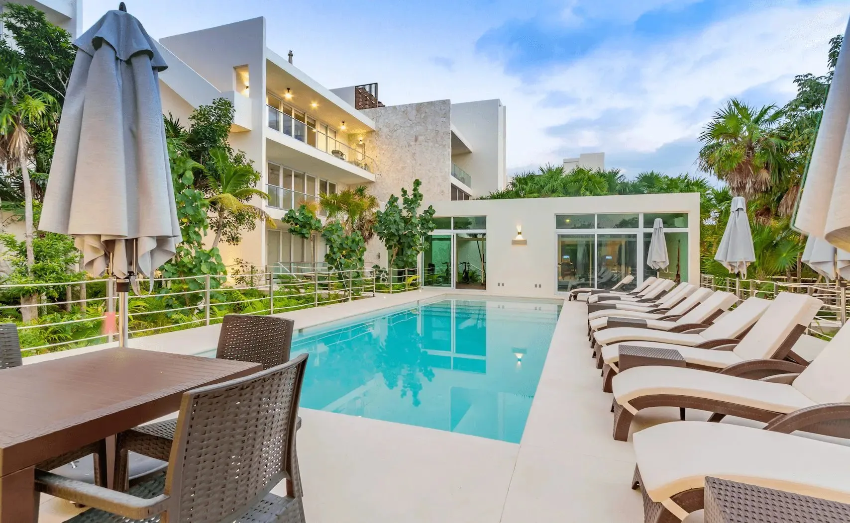 Each building has a rooftop pool with an ocean view. Community amenities include 10 pools, a beach club, access to the beach, BBQ areas, a gym, and a yoga area.