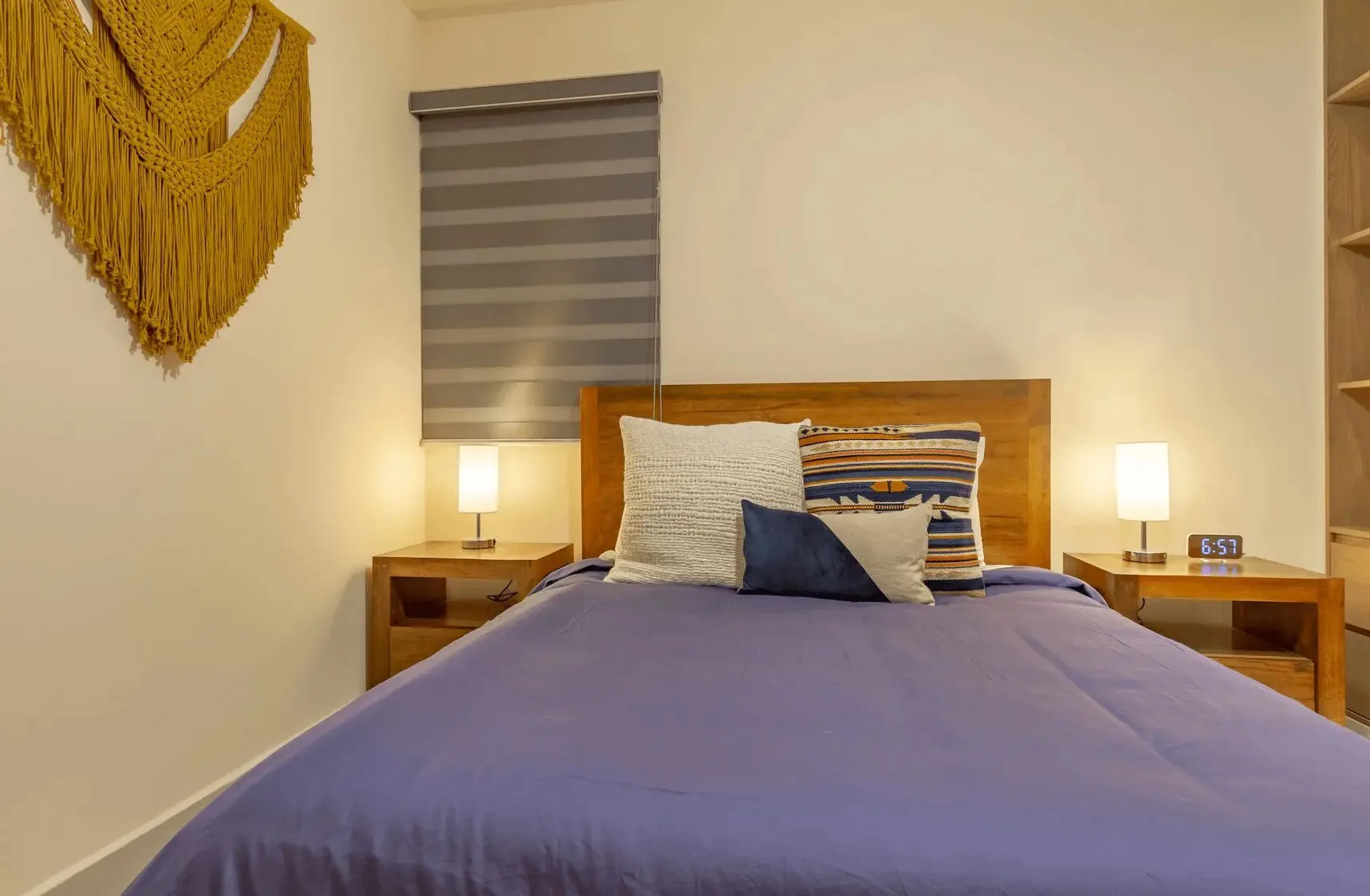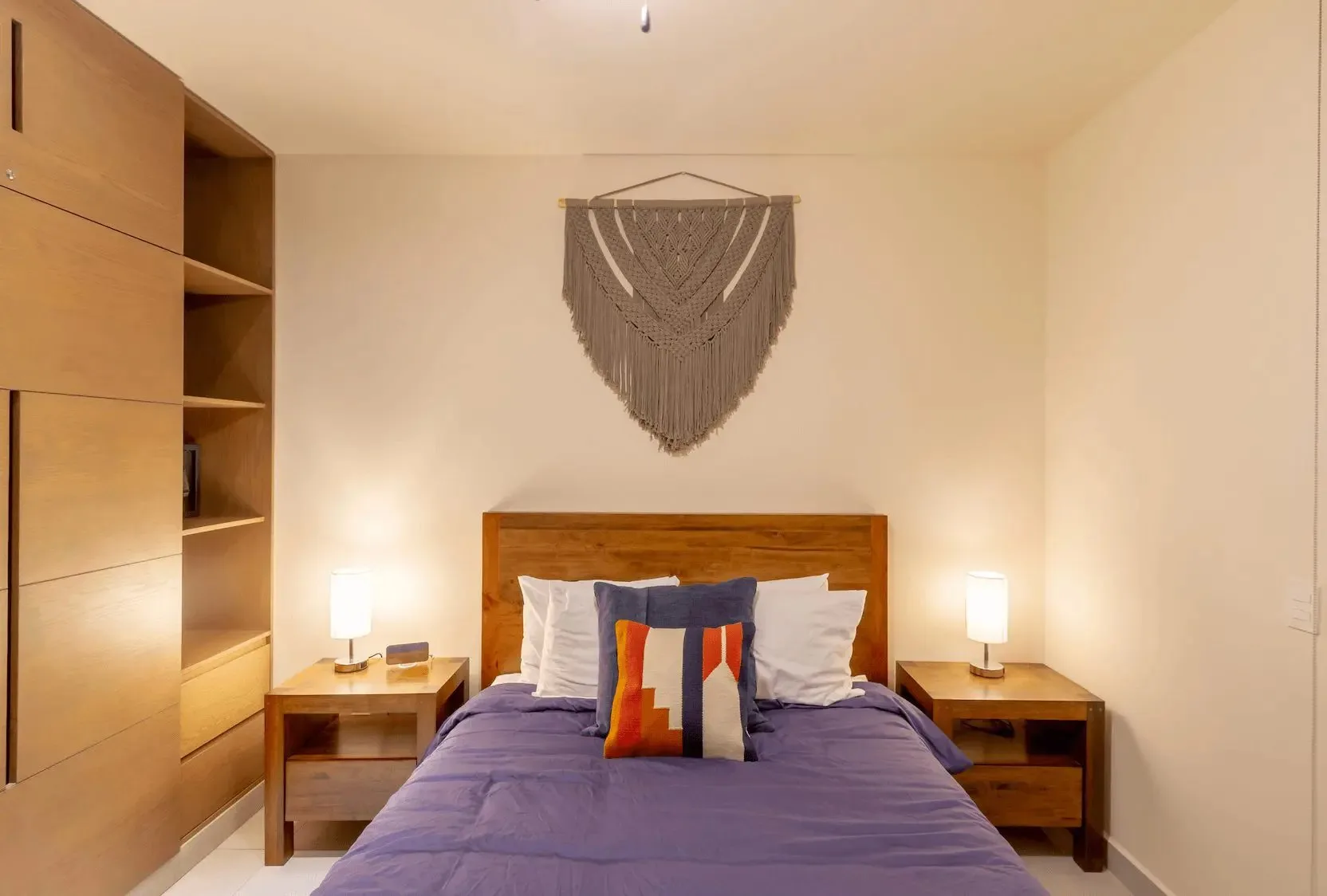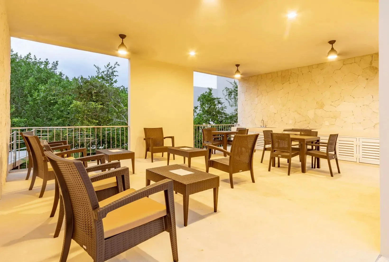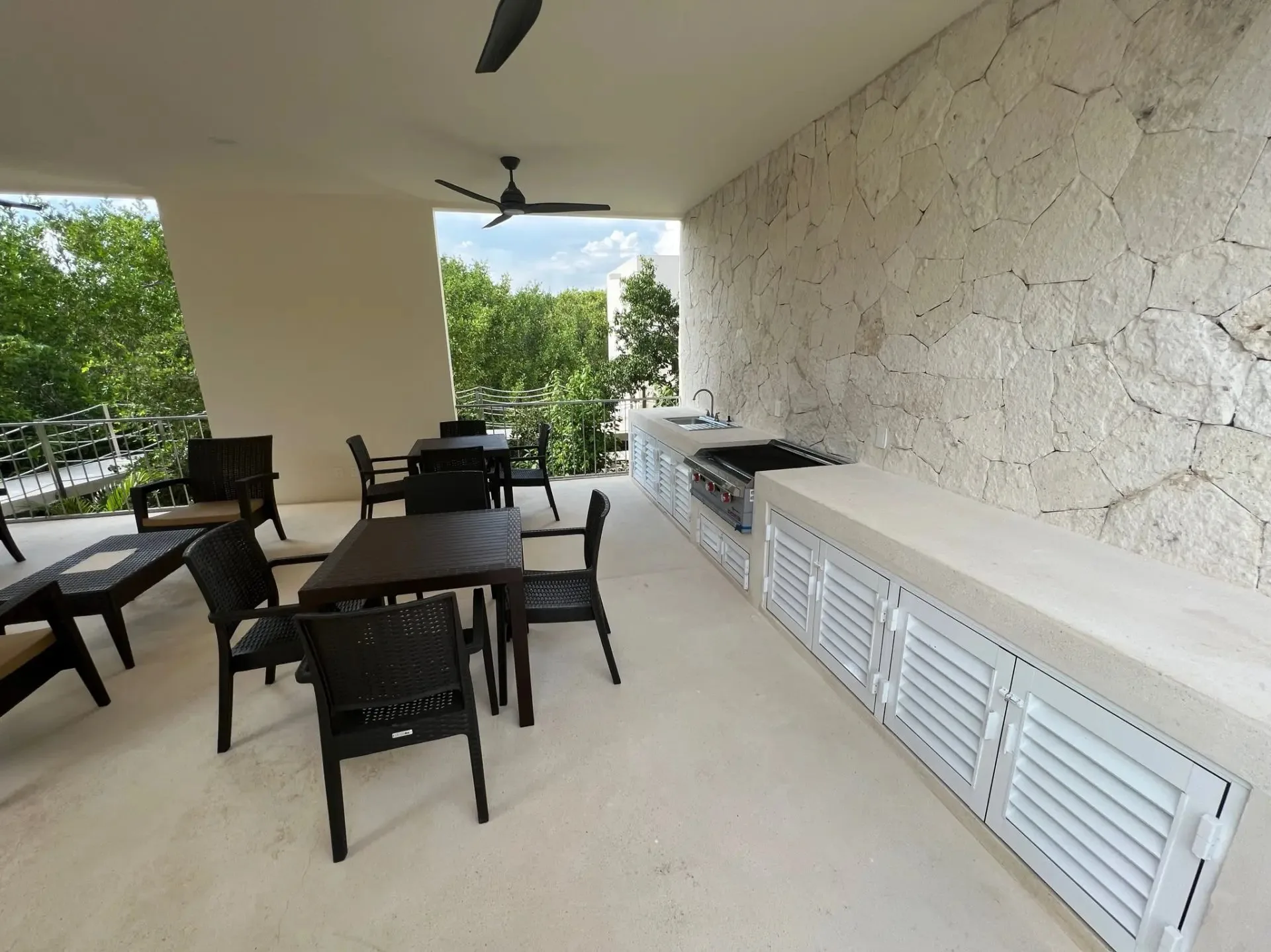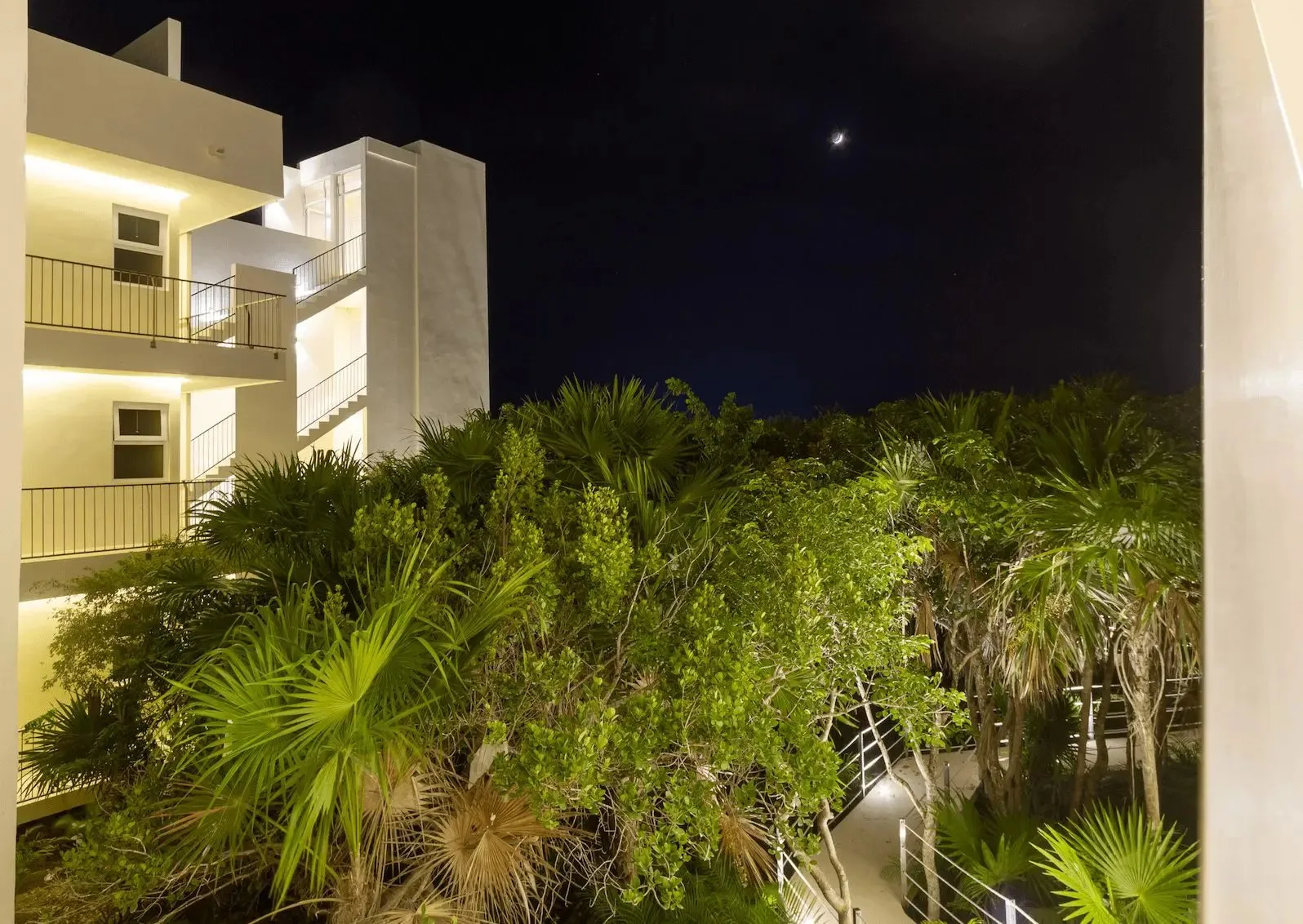 This 2-bedroom, 2-bathroom condo is located at Santamar in Punta Sur, Akumal, just a row back from the sea. It is set within lush greenery, combining jungle serenity with proximity to the Caribbean shoreline.