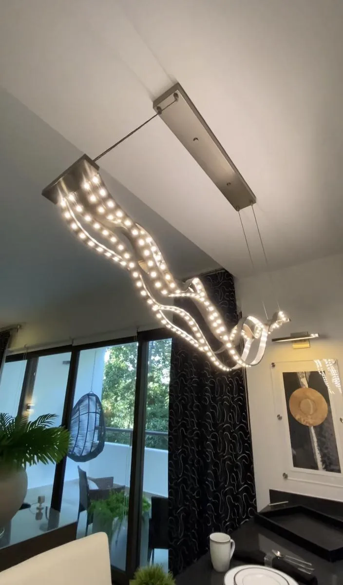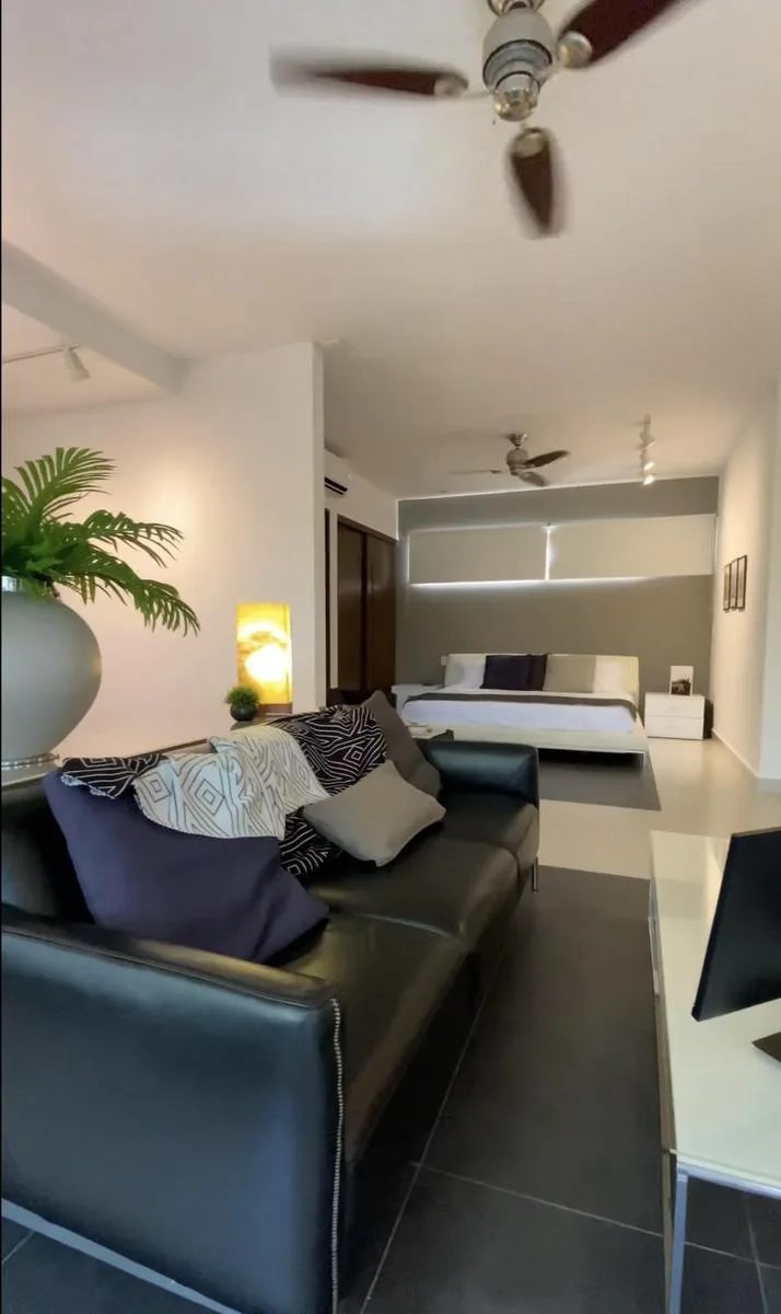 The unit is equipped with high-end furniture imported from Italy and the USA, including a leather sofa and a California King latex bed. Premium lighting and finishes are featured throughout. The property includes a full kitchen with appliances, a washer and dryer, and a 65-inch Sony television. An optional privacy curtain can be installed between the living area and the bedroom.