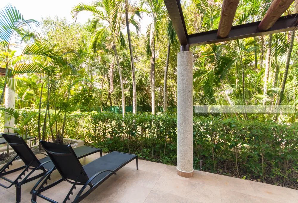 This garden-level condo is situated within a gated resort community on a 717-acre residential property featuring a golf course. The location is in the Riviera Maya region, approximately midway between Playa del Carmen and Tulum, and a short distance from the Caribbean coast.