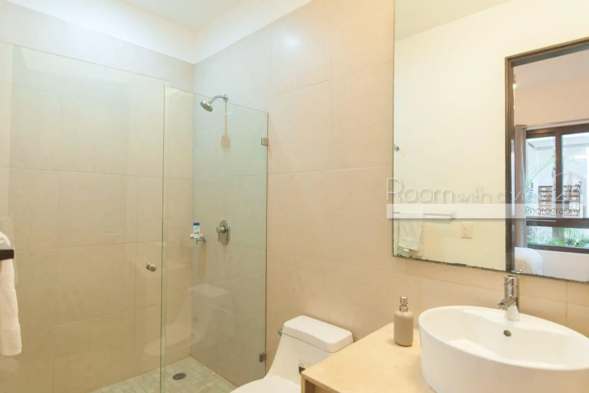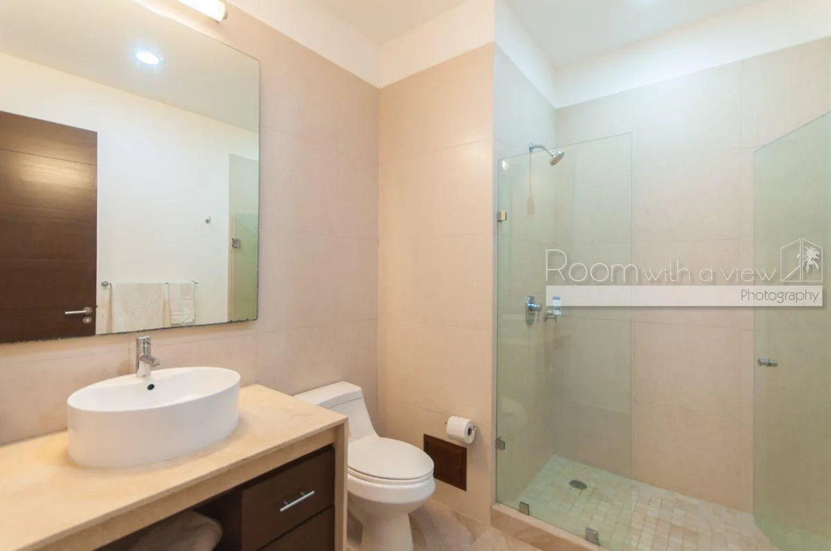 This 2-bedroom, 2-bathroom condo features a spacious open floor plan that receives ample natural light. It includes a fully equipped kitchen with premium appliances, separate living and dining areas, and a laundry room with a washer and dryer. The living area opens onto a large private terrace with views of the community pool and gardens. Both bedrooms have built-in closets and en suite bathrooms. The condo features tile floors and high-quality finishes and is offered fully furnished, with ceiling fans and air conditioning.