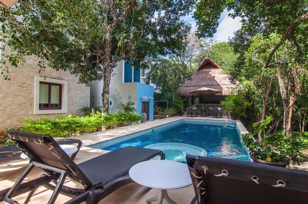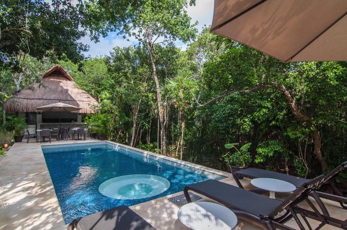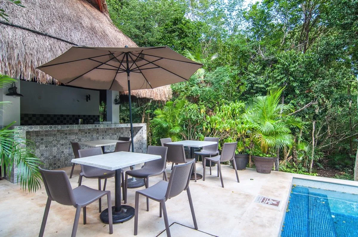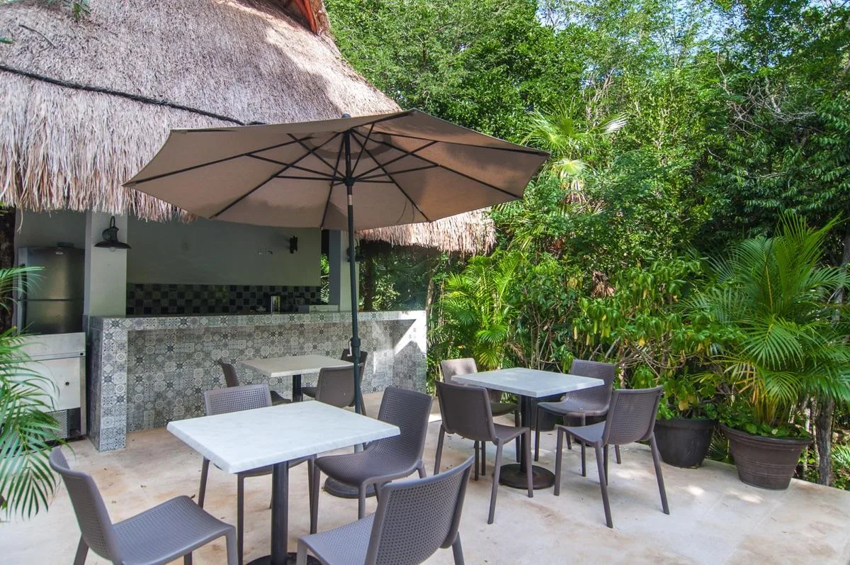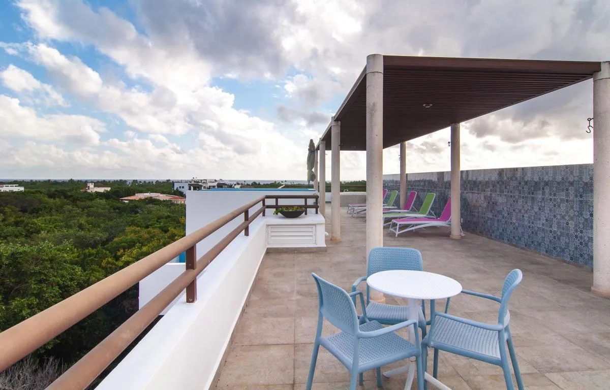 The condominium building provides a beautiful communal pool area with a sundeck and a shaded palapa on the ground level. It also features a large rooftop terrace with a jacuzzi, a sunbathing area, and panoramic jungle views.