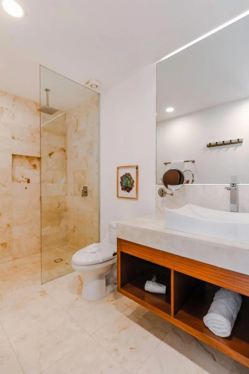 The residence is a Mexican-style apartment filled with natural light. It features one bedroom with a king-size bed, a closet, and a smart TV. There is one bathroom, a spacious kitchen with an island, a living and dining area, and a large terrace.