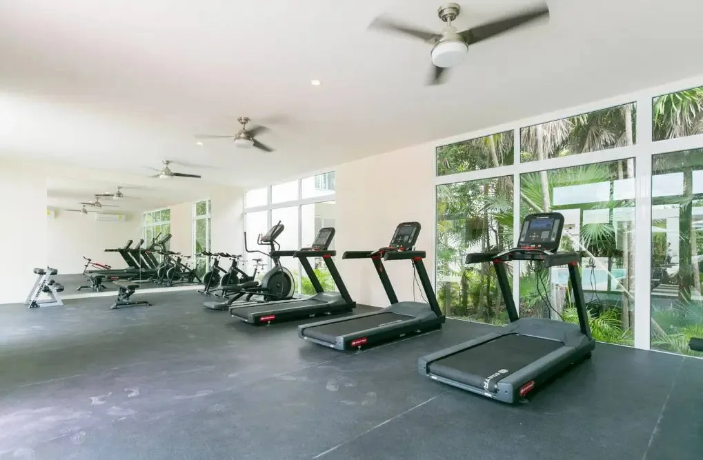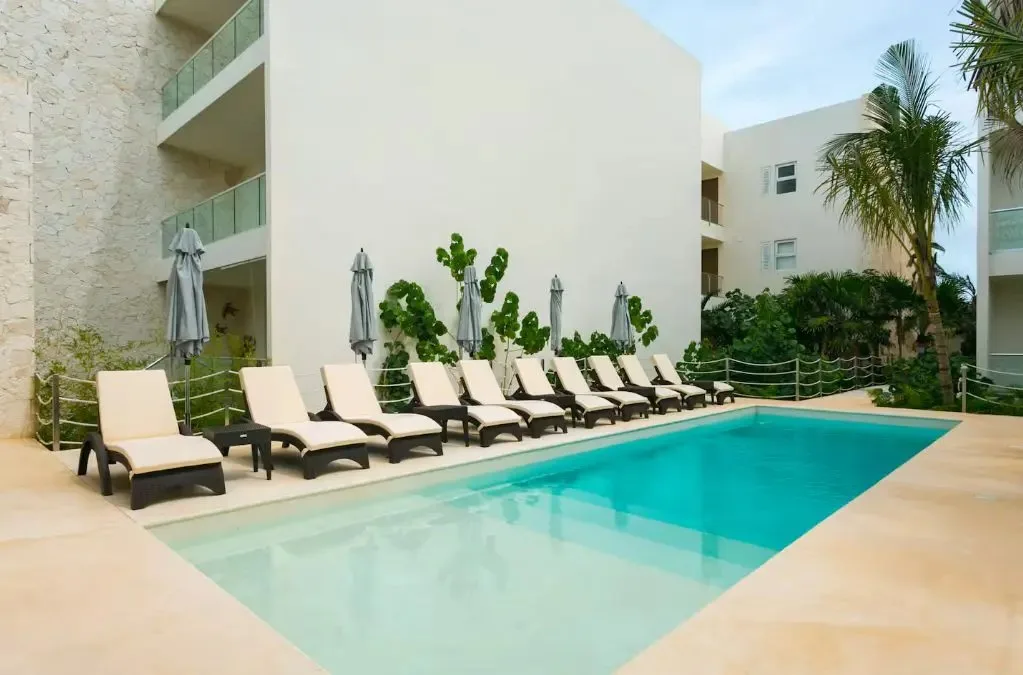 Community amenities include ten rooftop pools, a beach club, access to a secluded beach, BBQ areas, a gym, a yoga area, and 24/7 security.