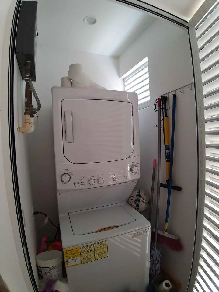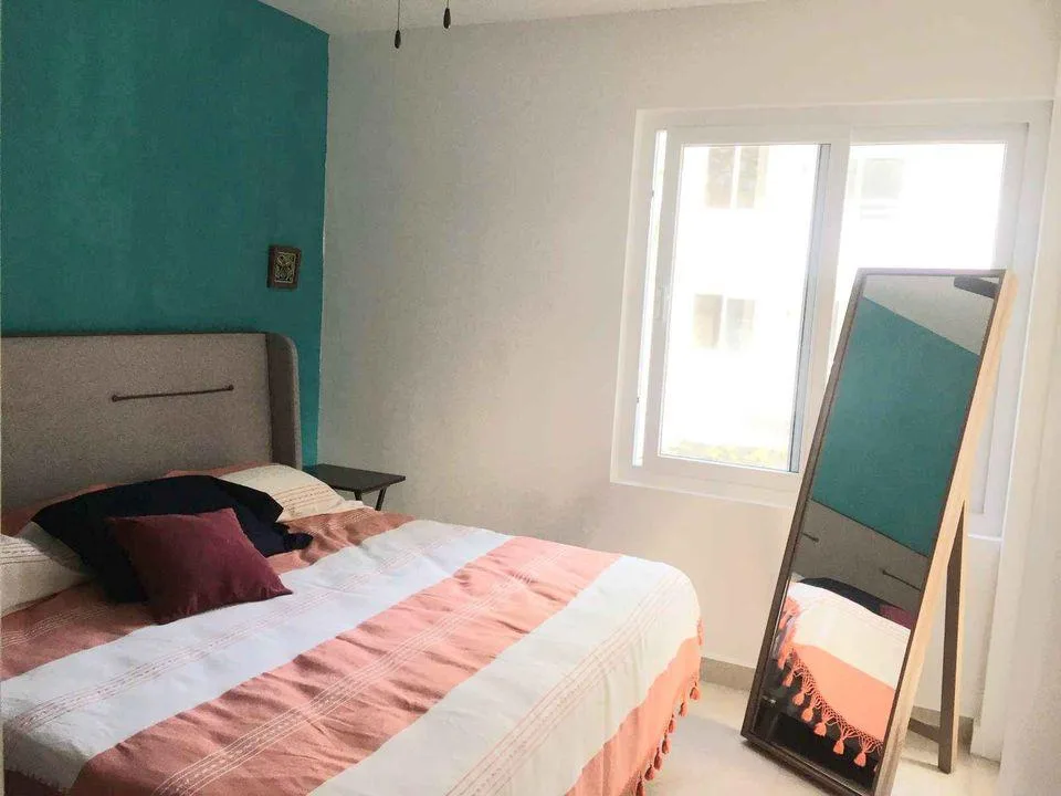 The apartment offers two bedrooms and two full bathrooms within 87 square meters of living space. It features a flexible lock-off design, with one bedroom having a separate, independent entrance. The integrated kitchen includes a quartz countertop bar. The living and dining area is spacious. A private terrace is equipped with mosquito screens. The unit includes air conditioning, ceiling fans, and is fully furnished and equipped. Parking is provided for one vehicle.