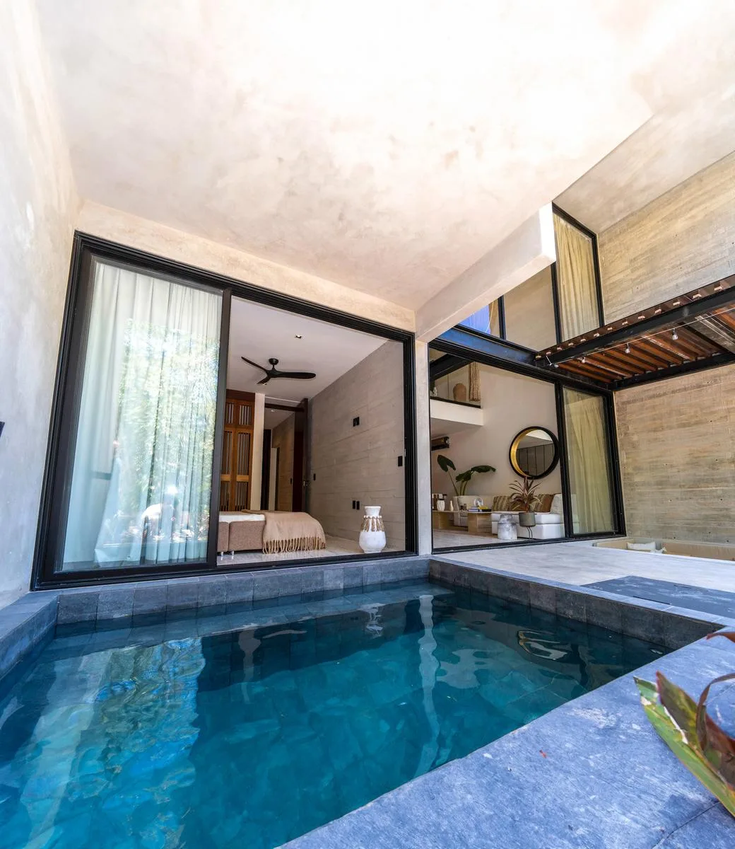 The development offers a comprehensive set of amenities including a gym, a jungle pool surrounded by vegetation, a coworking space, a natural cenote, a yoga area, and a rooftop with sea views.