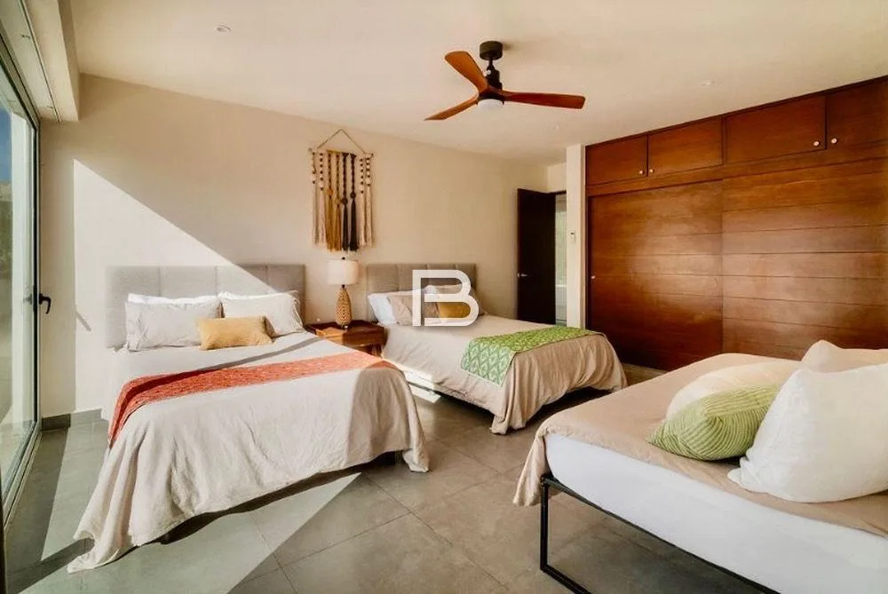The upper floor comprises two large bedrooms, each with capacity for three beds, a full bathroom, and access to a private terrace. This level also includes a TV room and leads to a spacious rooftop offering spectacular views.
