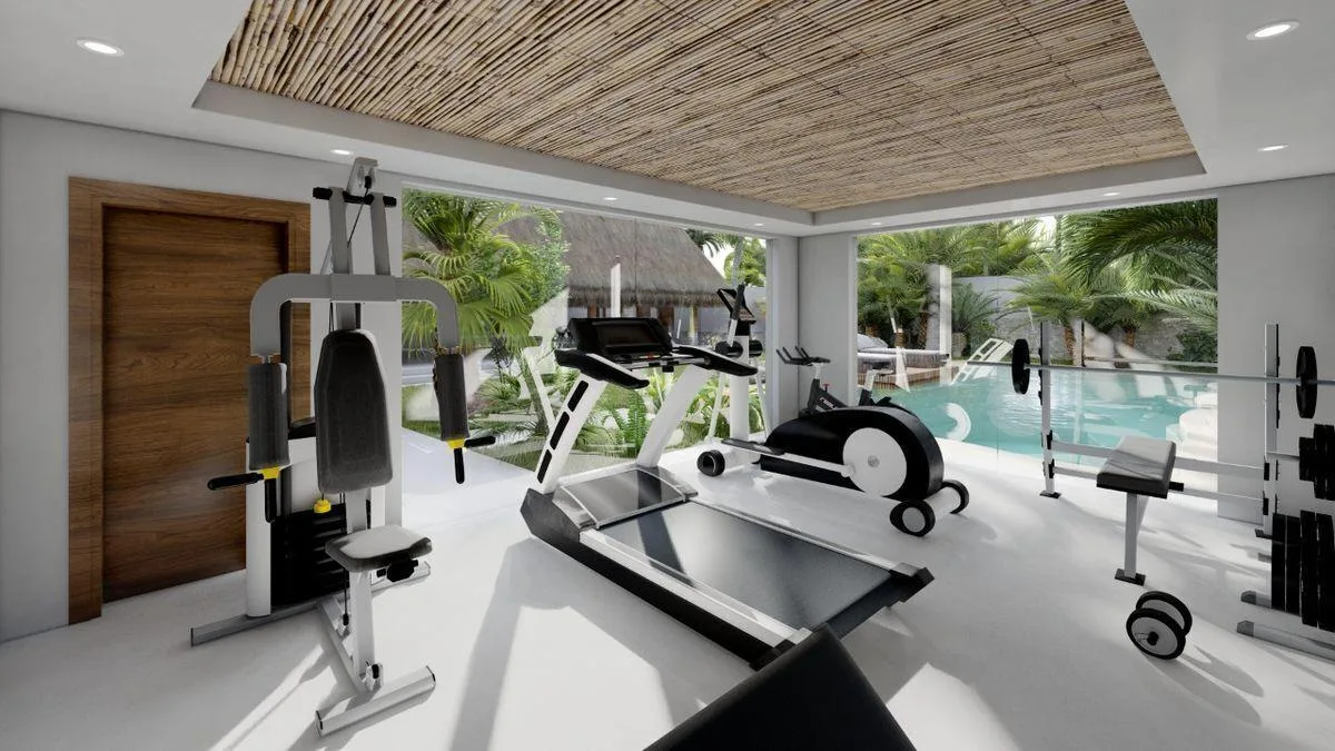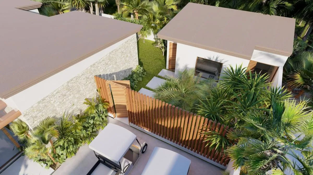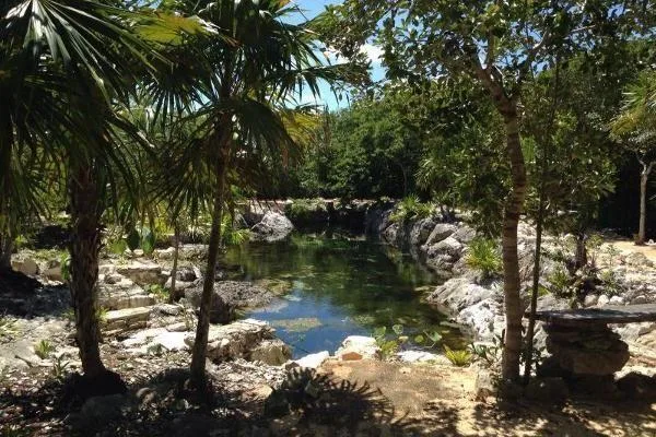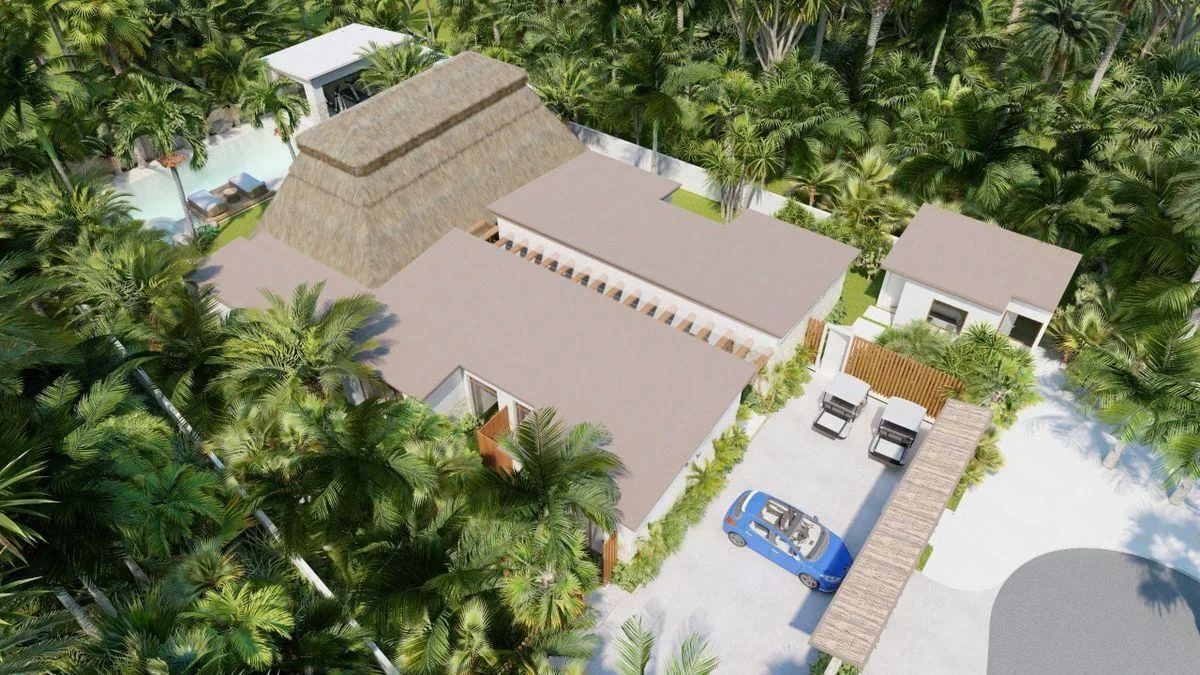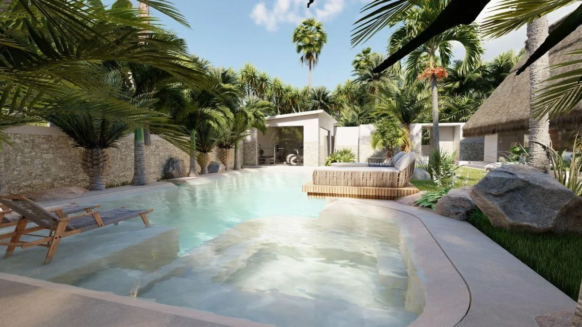 Upstairs, there is a palapa configured as a living area and another designated for massages. The property can accommodate approximately 16 people. The residential community also includes two natural cenotes within its green areas.