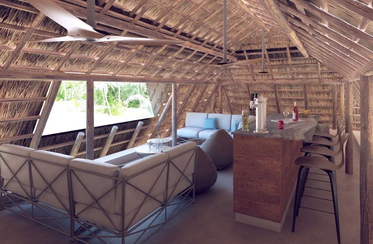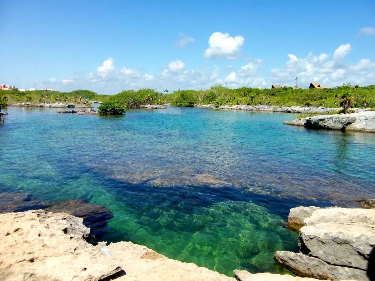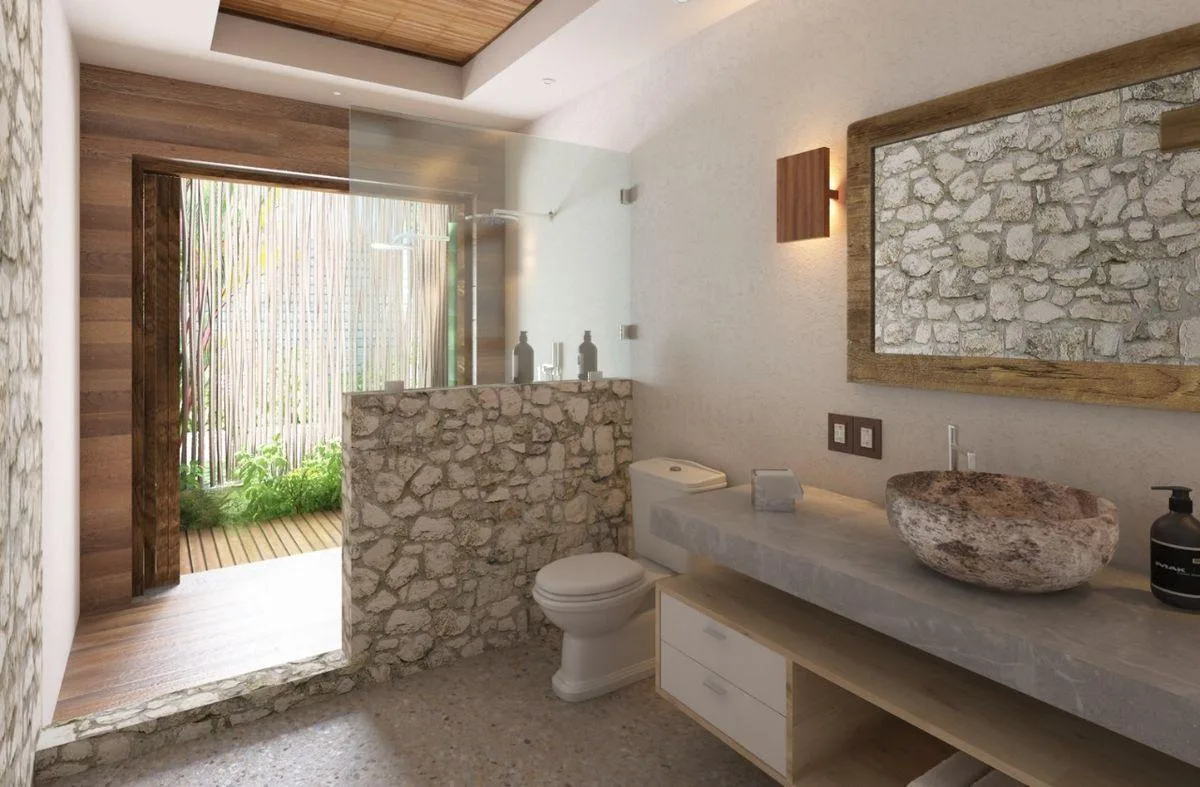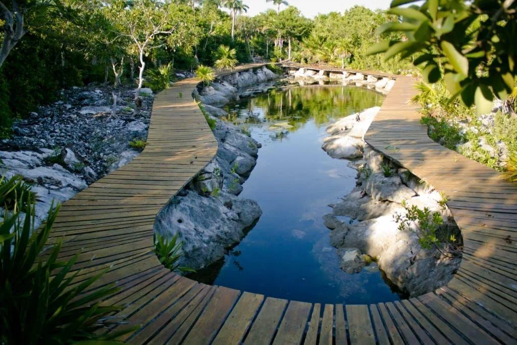 Upstairs, there is a palapa configured as a living area and another designated for massages. The property can accommodate approximately 16 people. The residential community also includes two natural cenotes within its green areas.