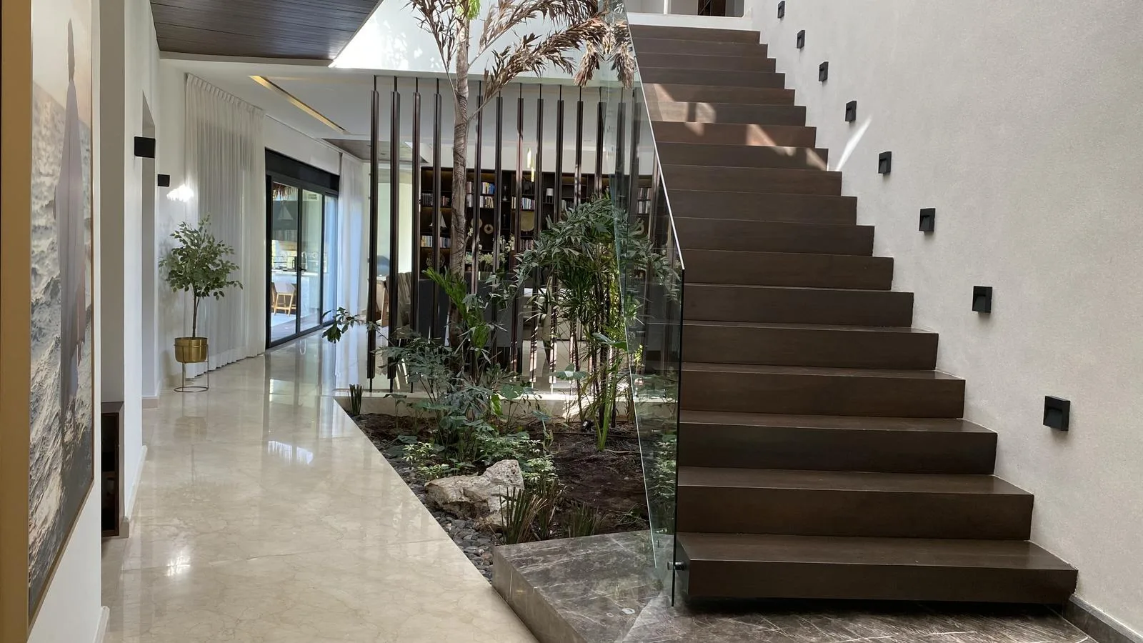 The residence is equipped with solar panels for sustainable and comfortable living. Its location is approximately a six-minute drive from the beach and is near a PGA golf course, a German school, and a Real Madrid football school.