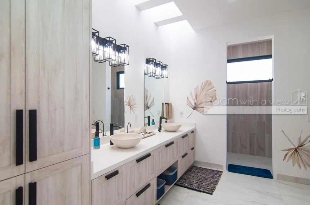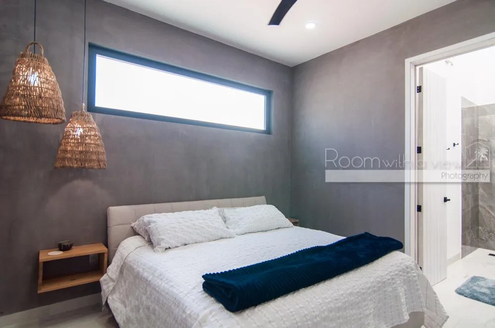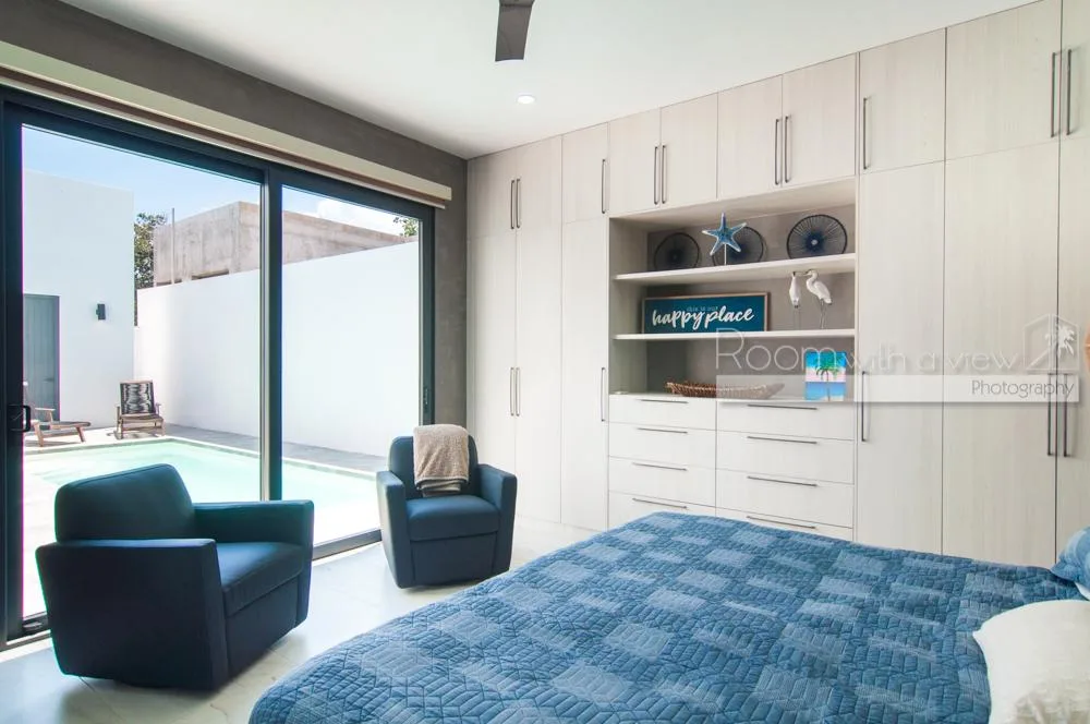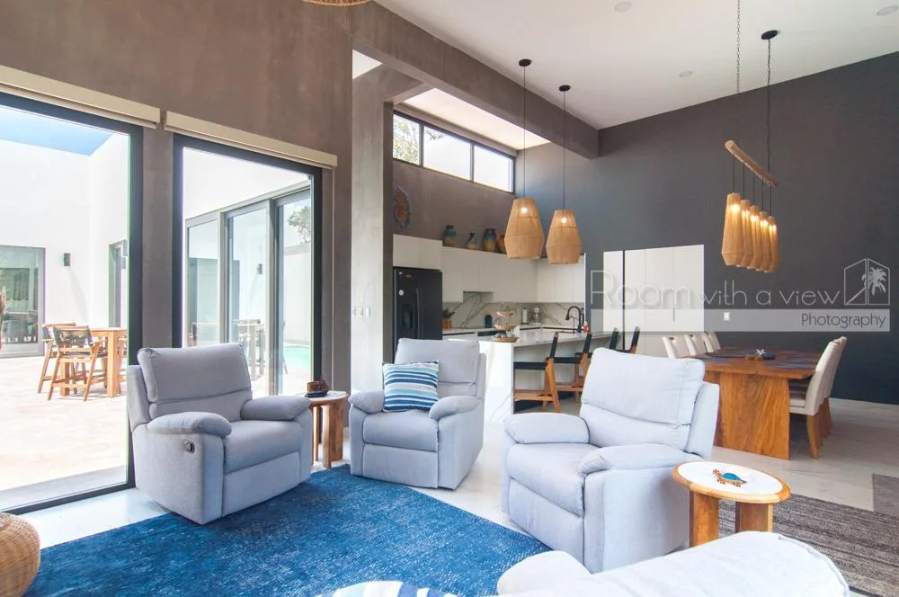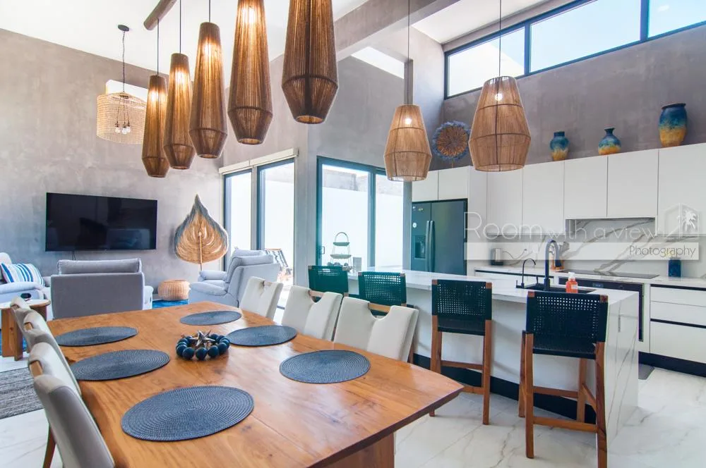 This single-story home features three spacious bedrooms and three and a half bathrooms. Large windows and sliding glass doors fill the interiors with natural light. An open-concept layout includes a bright living space that flows into a fully equipped kitchen with an island, high-end appliances, and ample storage.