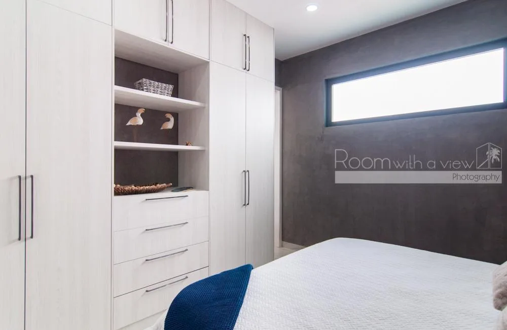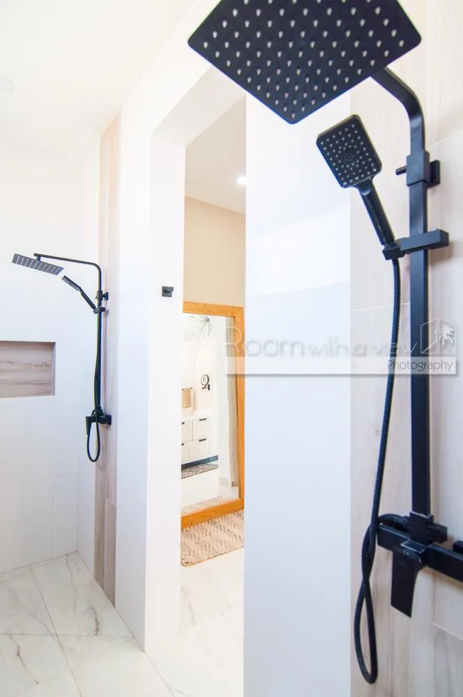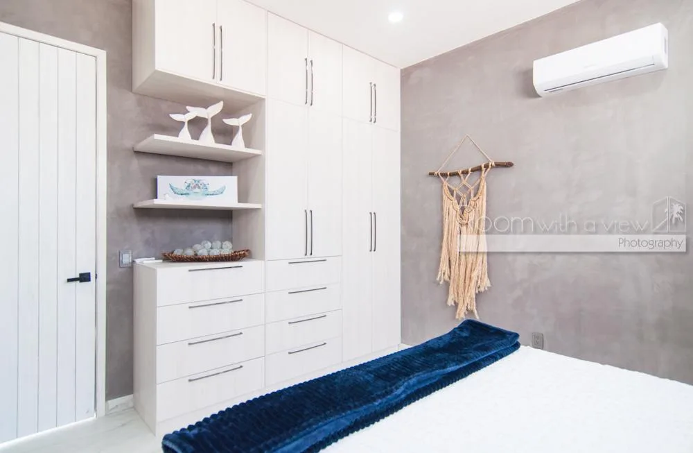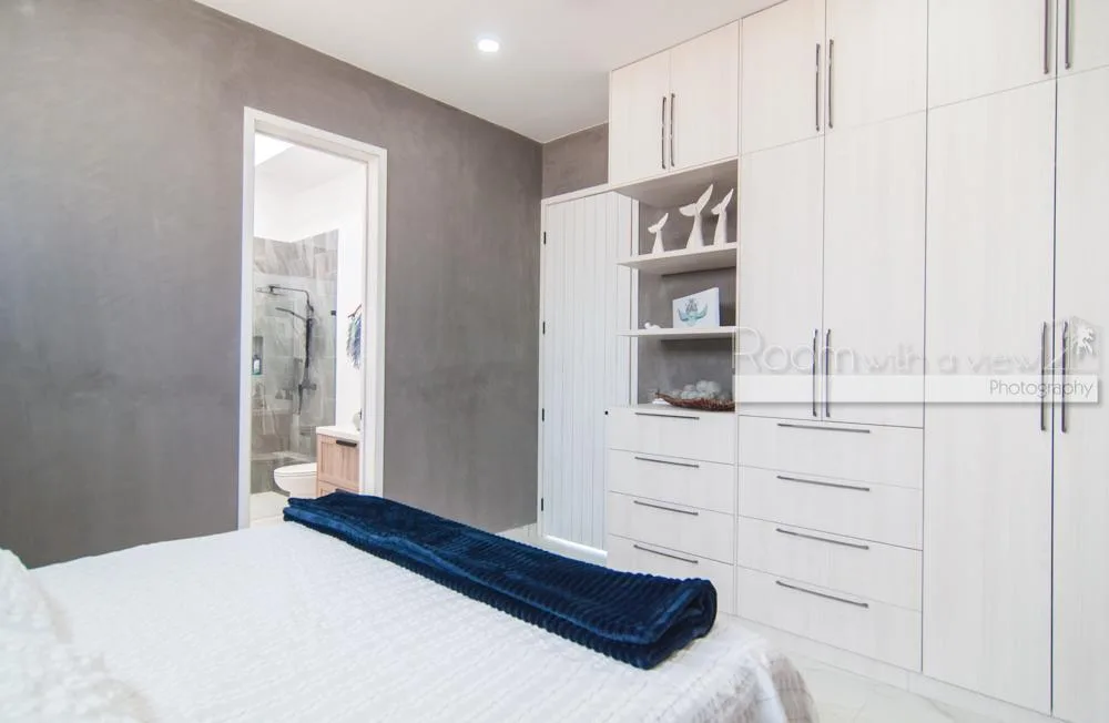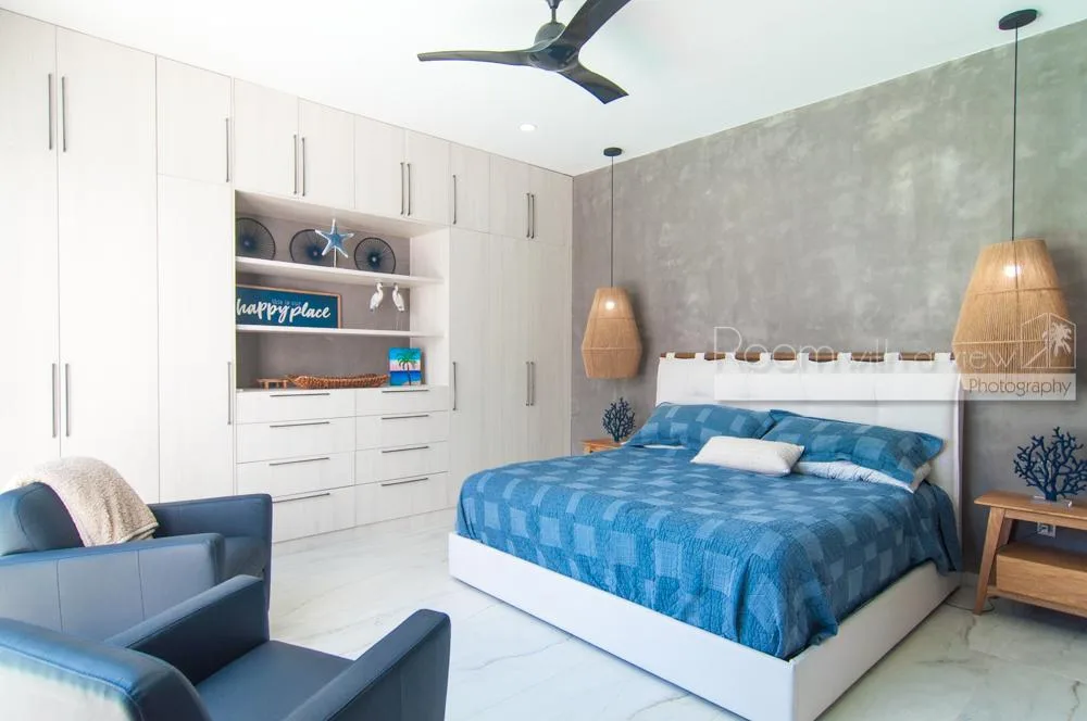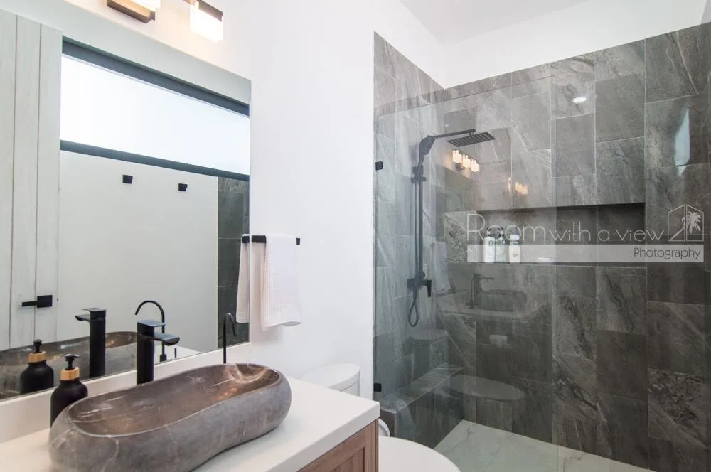 This single-story home features three spacious bedrooms and three and a half bathrooms. Large windows and sliding glass doors fill the interiors with natural light. An open-concept layout includes a bright living space that flows into a fully equipped kitchen with an island, high-end appliances, and ample storage.