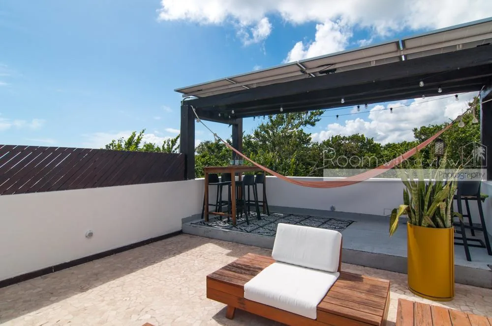 The property includes two balconies and offers jungle views. It is furnished and features a rooftop camera, solar power, and Starlink satellite internet. Green areas and a community pool are available within the community.