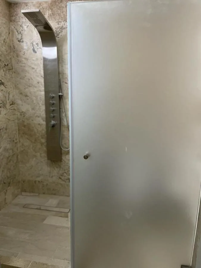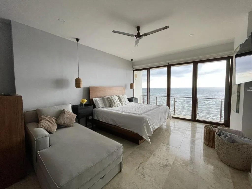 The interior includes a living room with a 5. 6-meter double-height ceiling and natural stone walls. There is an open-concept kitchen with a large island and custom cabinetry. The residence includes three full bathrooms with walk-in closets and showers featuring hydro-massage systems. The primary suite has a direct ocean view.