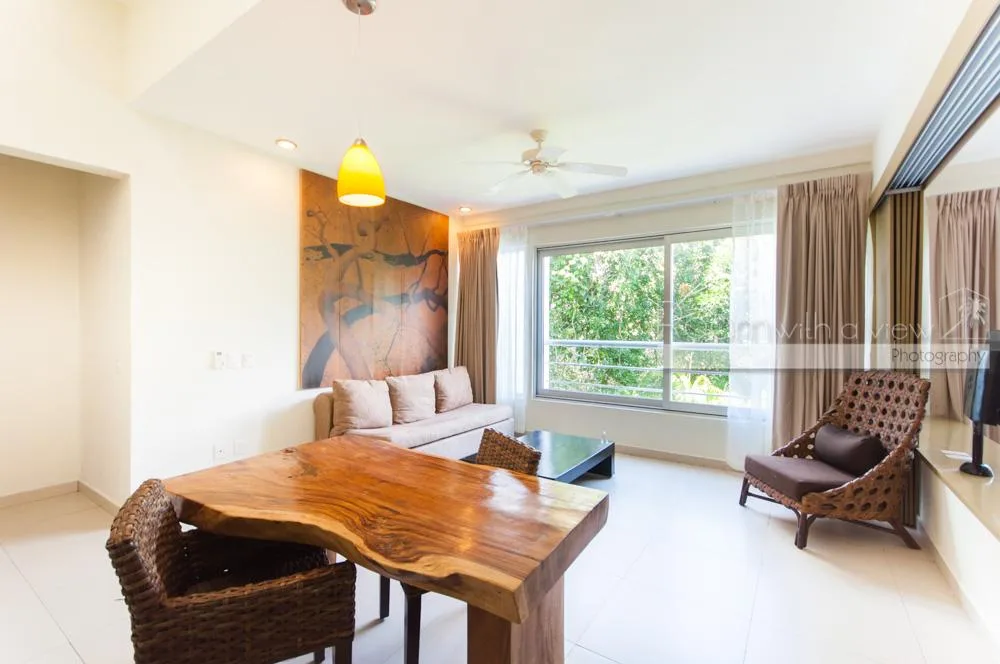 This sun-filled penthouse condominium is located on the top floor of a hotel within the gated Tulum Country Club resort community. The property is situated within a 717-acre residential resort surrounded by golf and is minutes from the Caribbean coast. The complex is located in the Riviera Maya, approximately halfway between Playa del Carmen and Tulum.