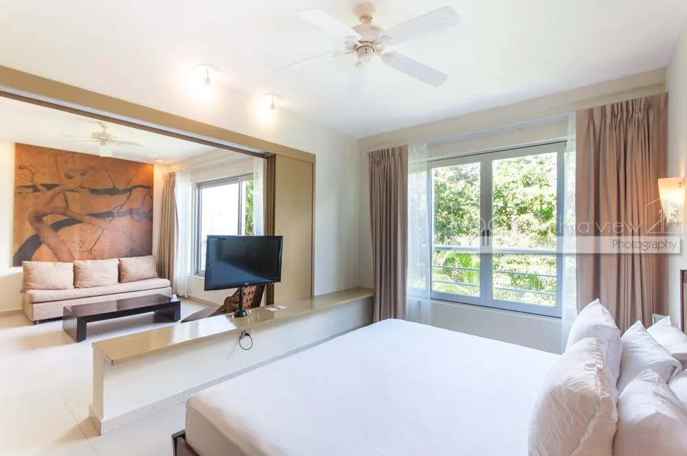 This studio-style unit features one bedroom and one bathroom. It has an open floor plan with a kitchenette and a retractable wall that separates the living and dining area from the bedroom. The condo includes tile floors and high-quality, durable finishes. It is fully furnished and equipped with ceiling fans, air conditioning, and a bedroom closet.