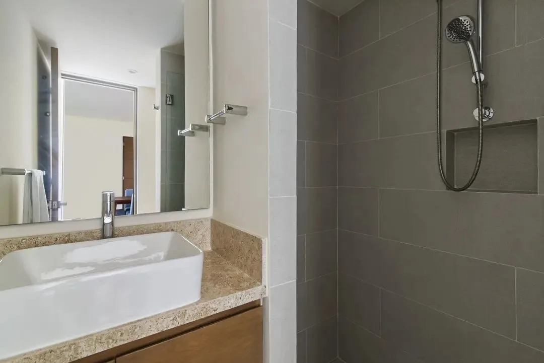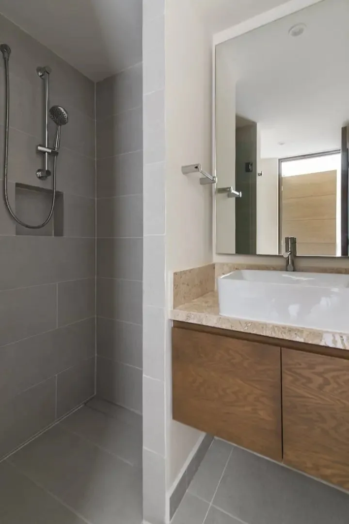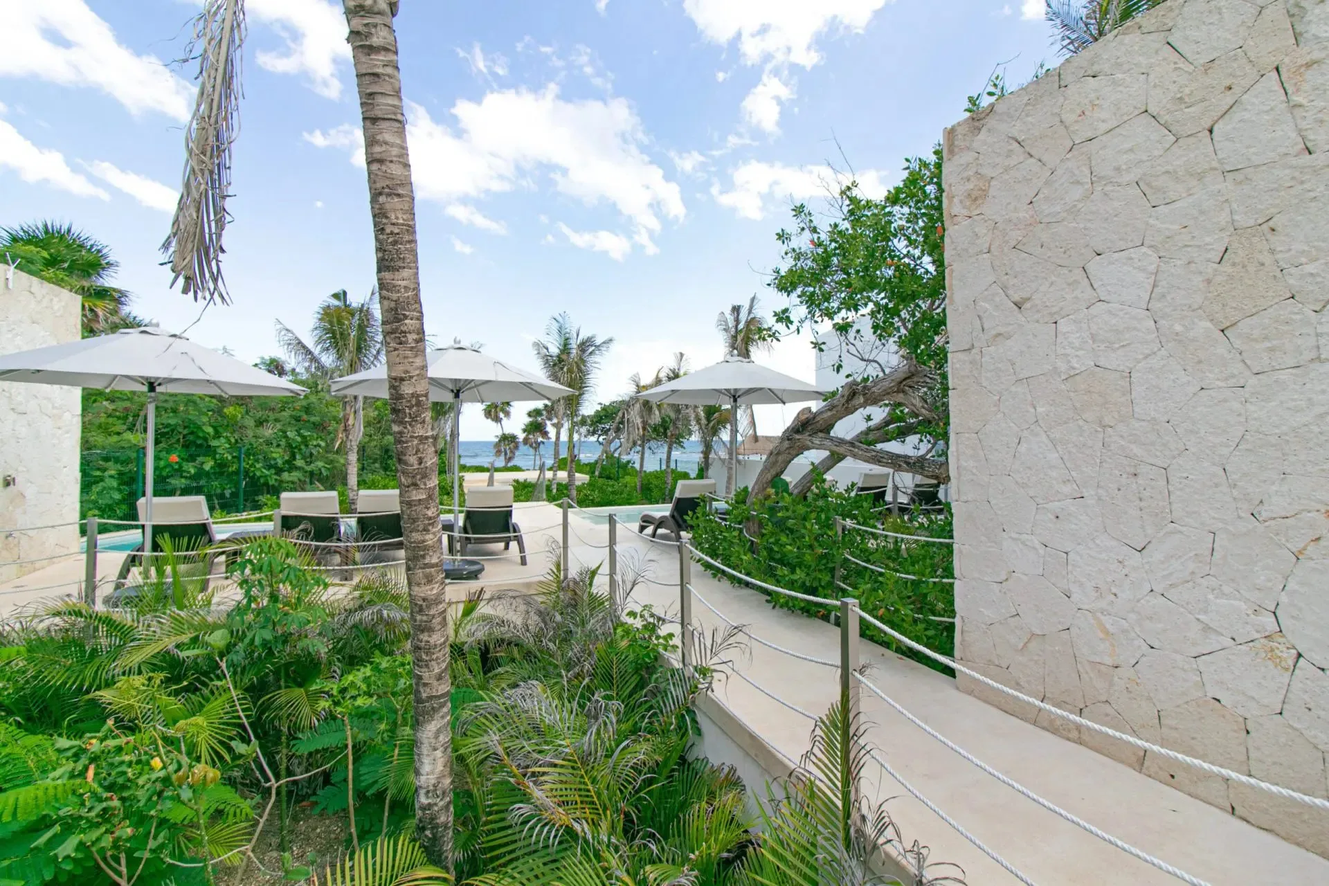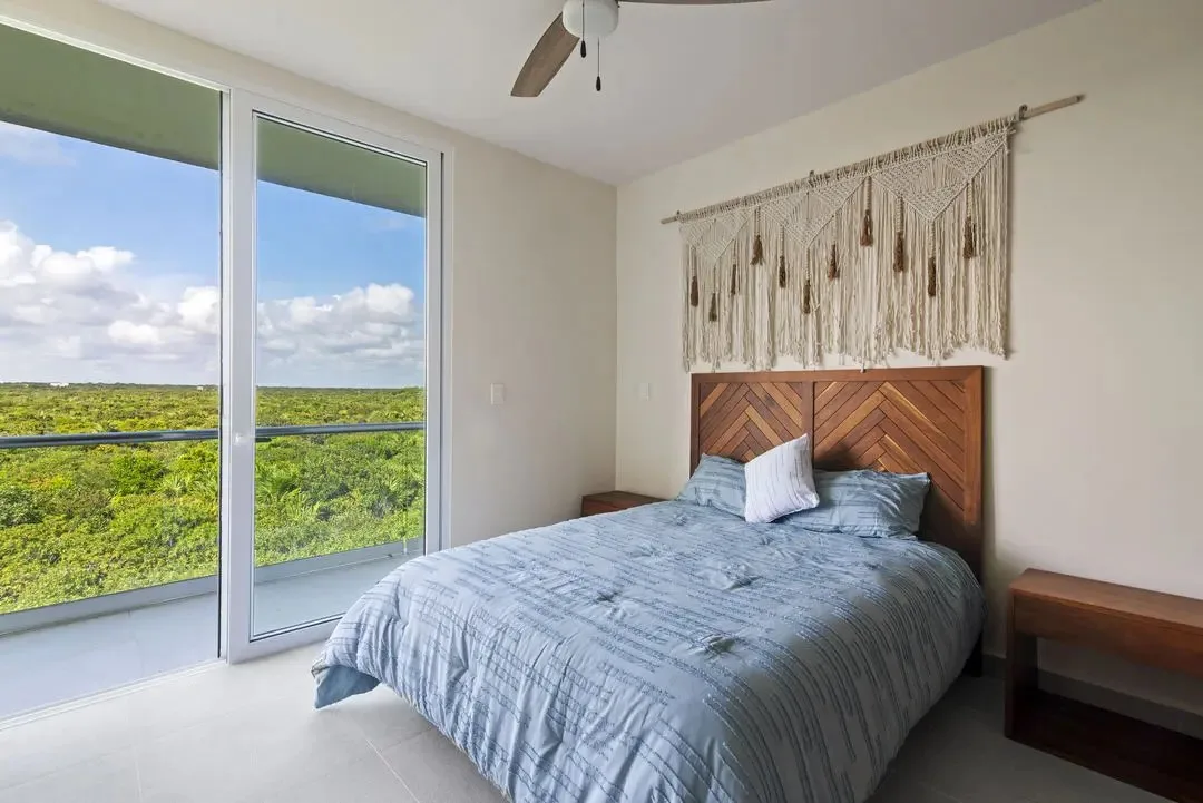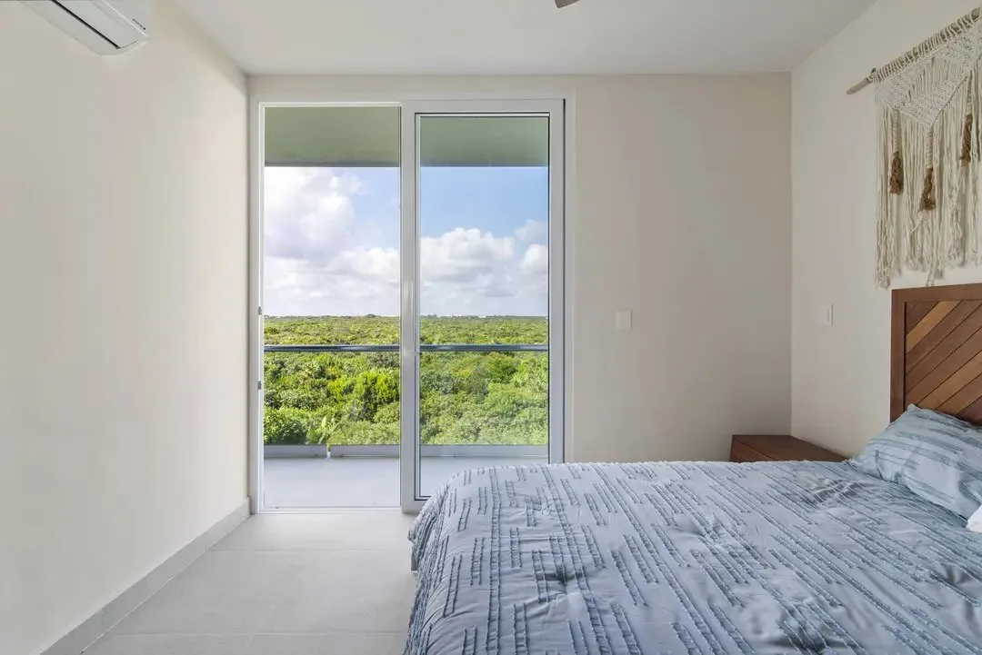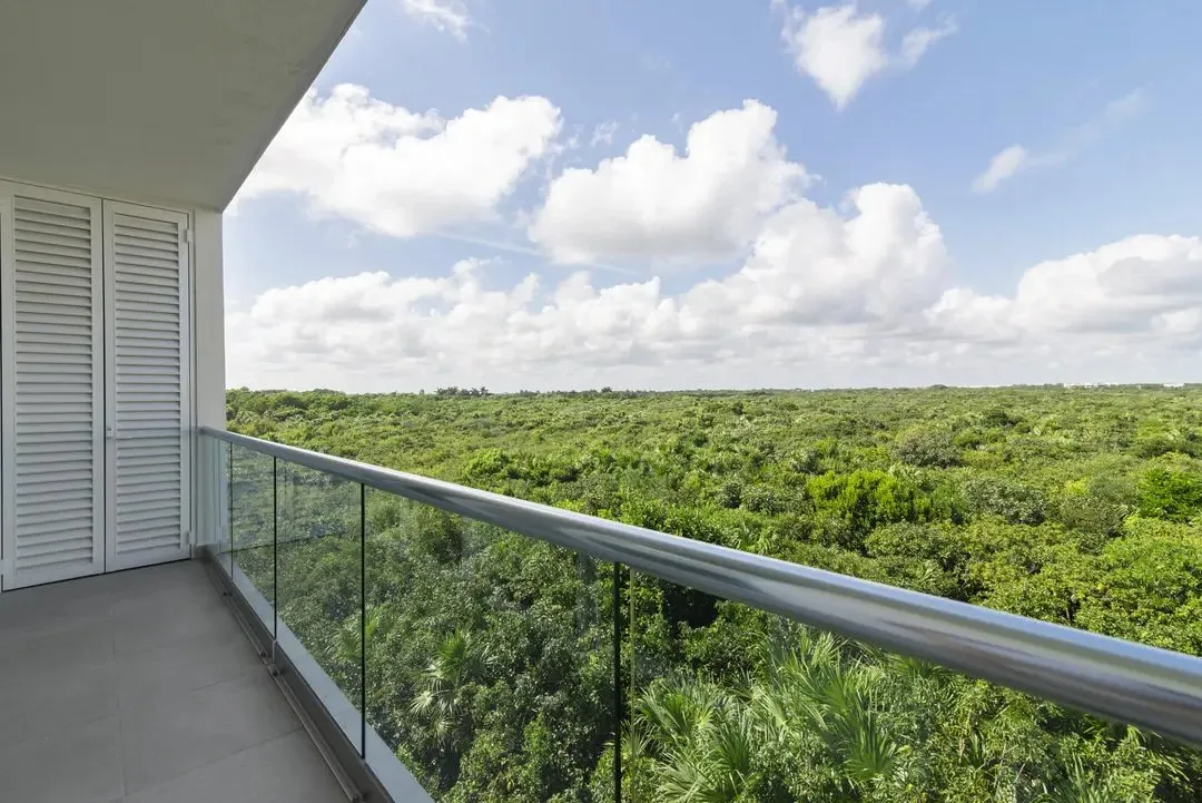 Building amenities include two swimming pools, seven common rooftops with ocean views, a BBQ area, a lounge area, a gym, and a yoga area. A wellness center and a jungle beach club are located nearby.
