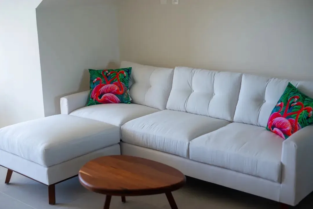 The building is situated just one row back from the sea, providing direct access to a sandy beach and a private beach club. The location is minutes from a country club with a PGA golf course, a supermarket, several restaurants, and a modern gym.