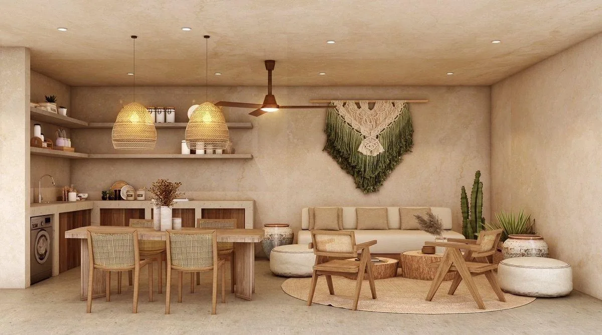 These sustainably designed villas feature 3 bedrooms and 3 bathrooms. They have a spacious open-plan layout with a fully equipped kitchen including an island and premium appliances, and a bright living and dining area. The decor is bohemian-style with locally sourced materials such as chukum and Tzalam woods. The master bedroom includes a small sitting area and a luxurious master bath with a double vanity, a hot tub, and a separate walk-in shower. Floors are polished cement, and finishes are high-quality natural materials that are durable and easy to maintain. The villas are unfurnished but equipped with ceiling fans and air conditioning.