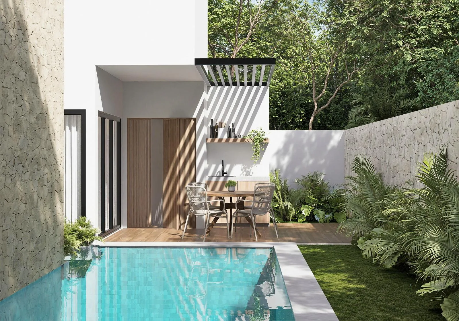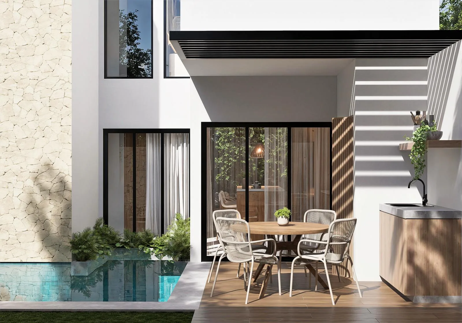 Private amenities include a personal swimming pool, three terraces ideal for relaxing or entertaining, an outdoor BBQ area, an entrance lobby, and two exclusive parking spaces.