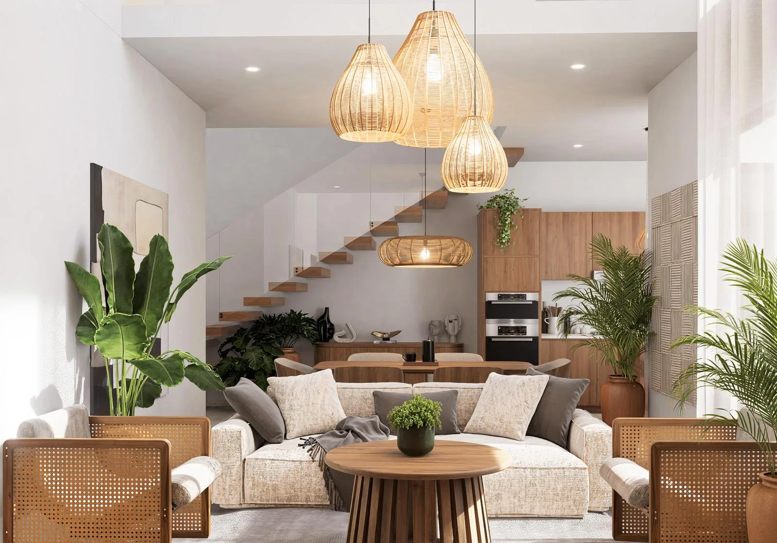 The villa's layout features three spacious and well-lit bedrooms and three full bathrooms plus one half bathroom. The living room offers views of the garden. The home includes a functional open-concept kitchen and a separate laundry area.