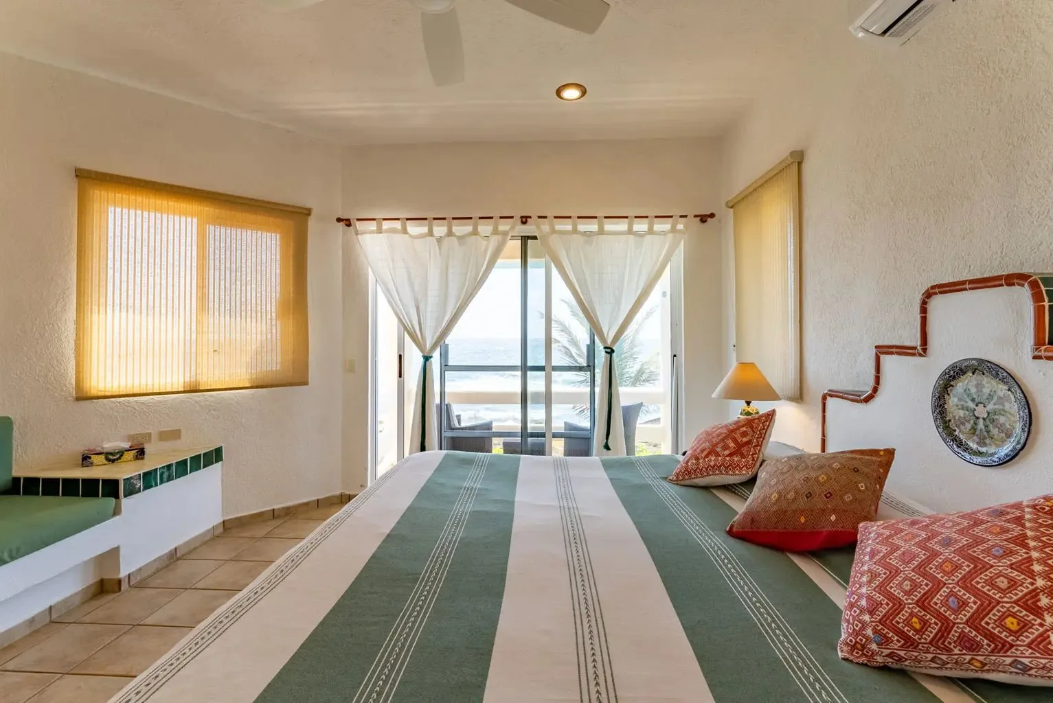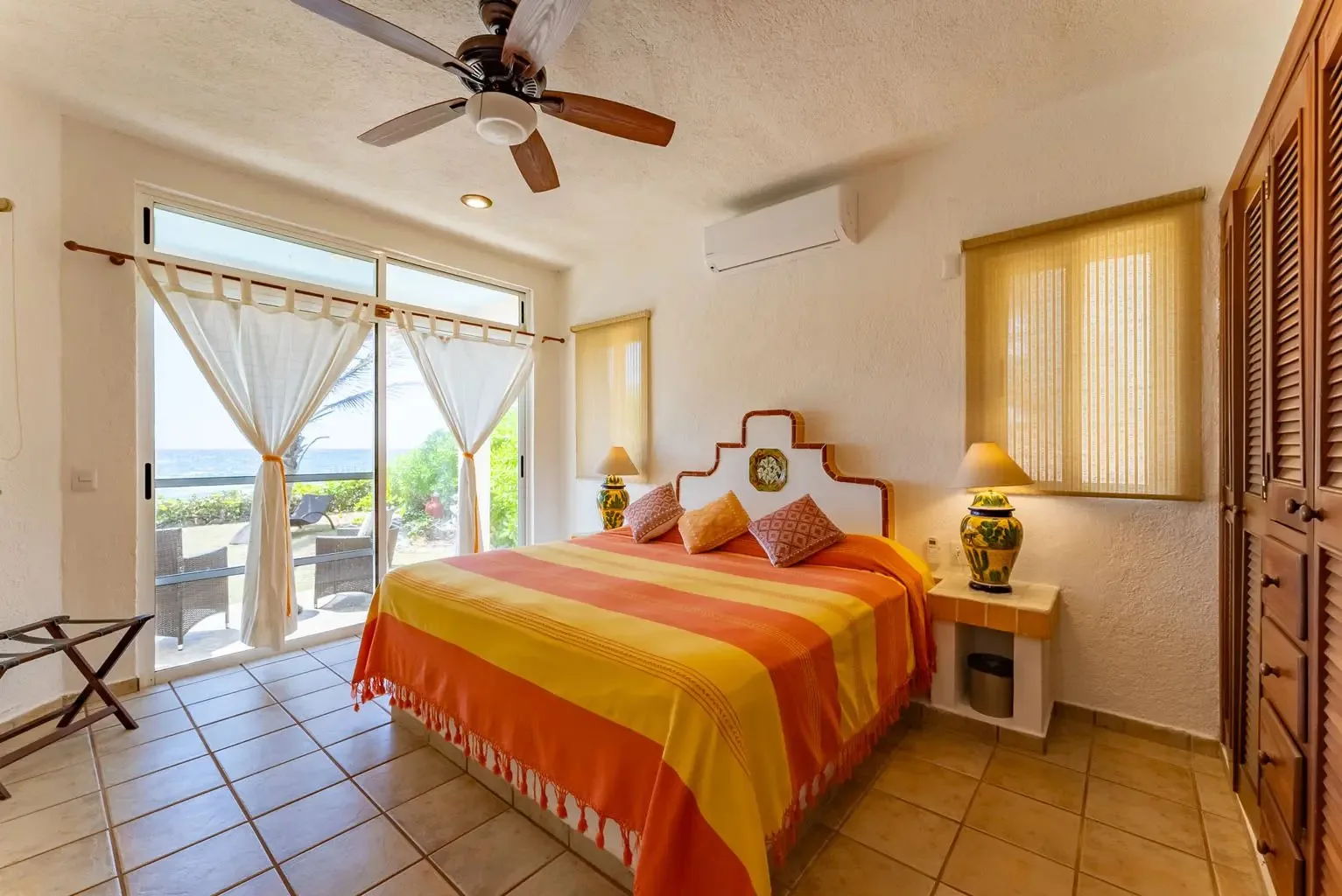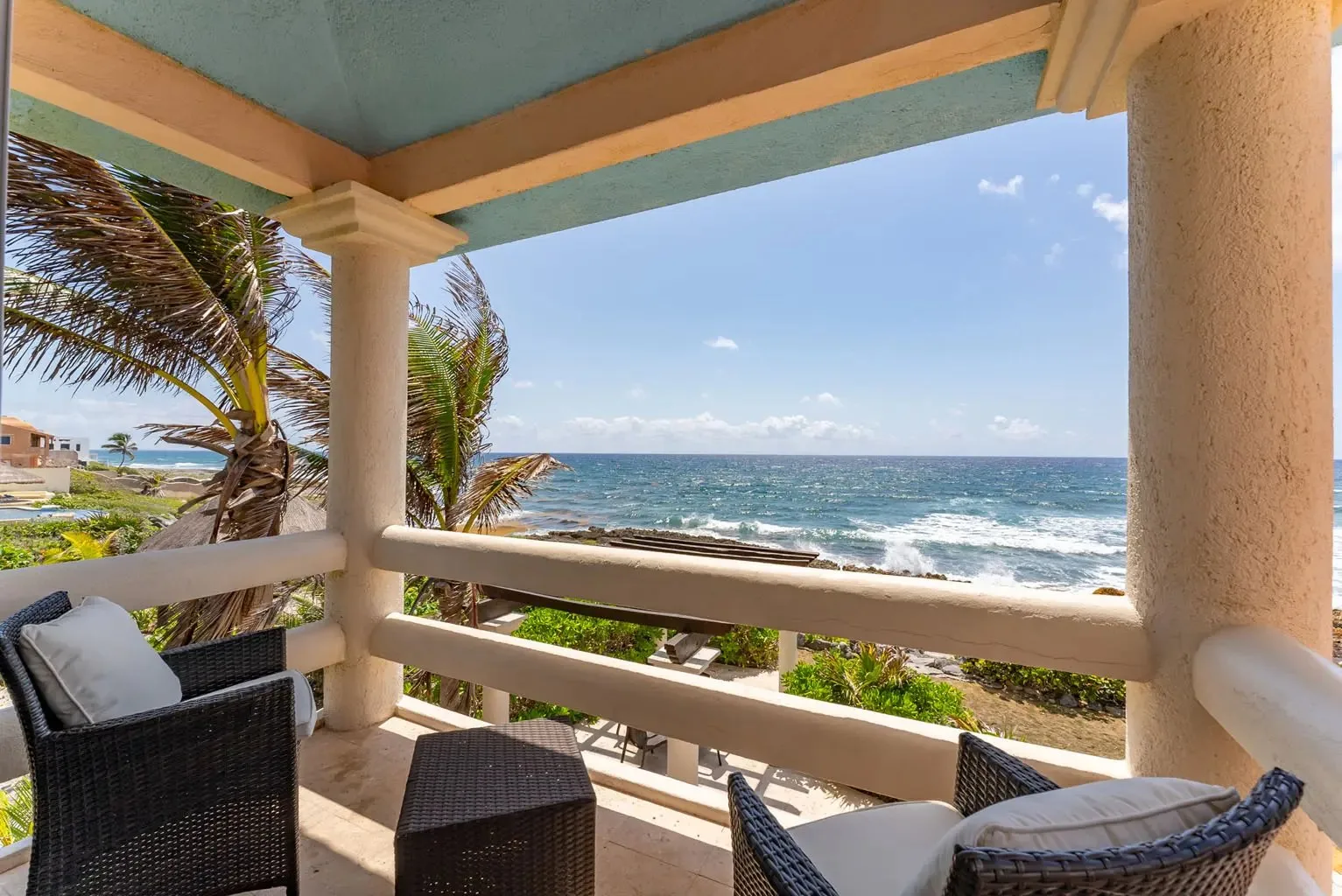 This property offers guests stunning views of the Caribbean Sea from its large oceanfront living areas. Tastefully decorated with vibrant Mexican textile details, the villa is filled with natural sunlight. The poolside terrace and garden provide a perfect spot for a refreshing swim, shaded under a covered terrace that leads to the home's kitchen. Four main bedrooms offer beautiful ocean views, while a fifth bedroom facing the jungle also serves as a closed entertainment room.