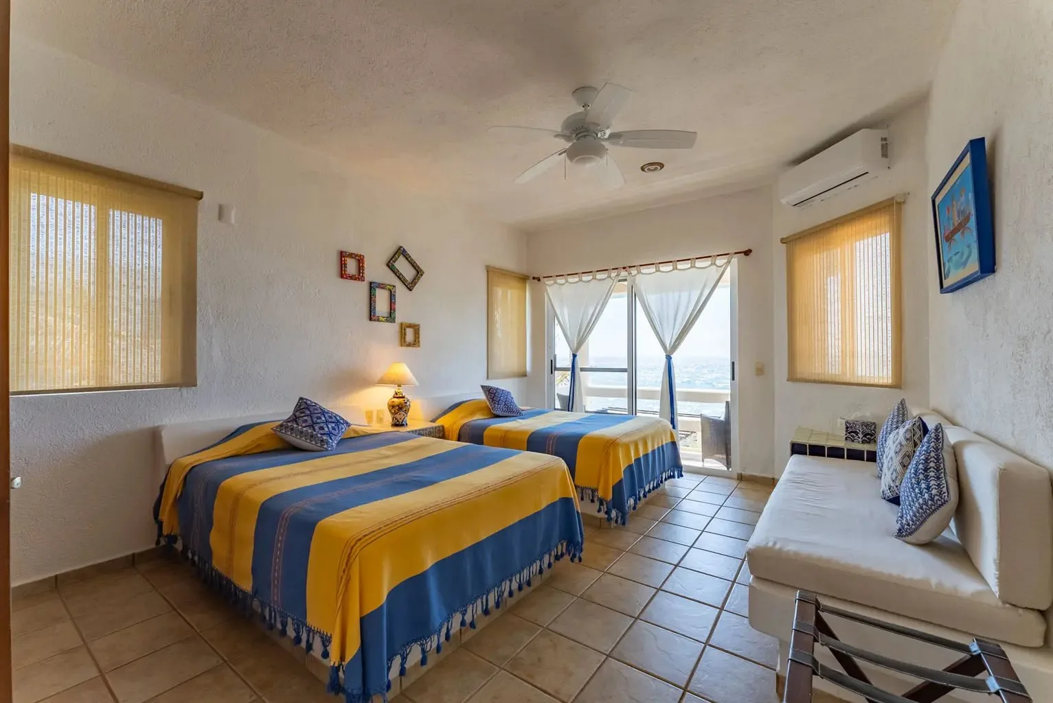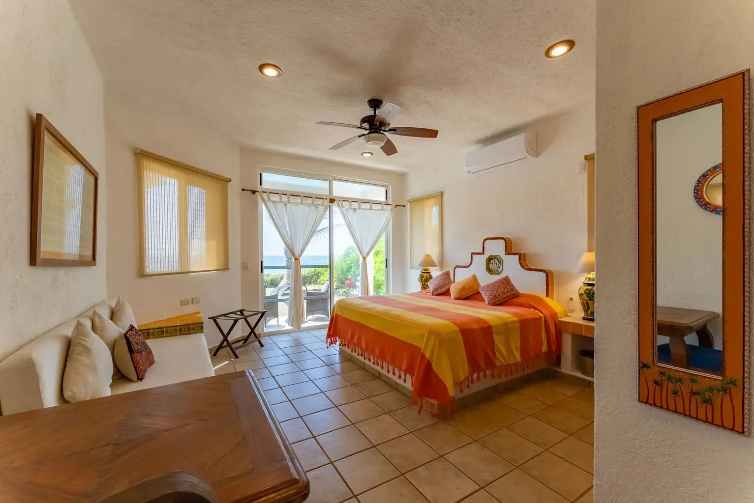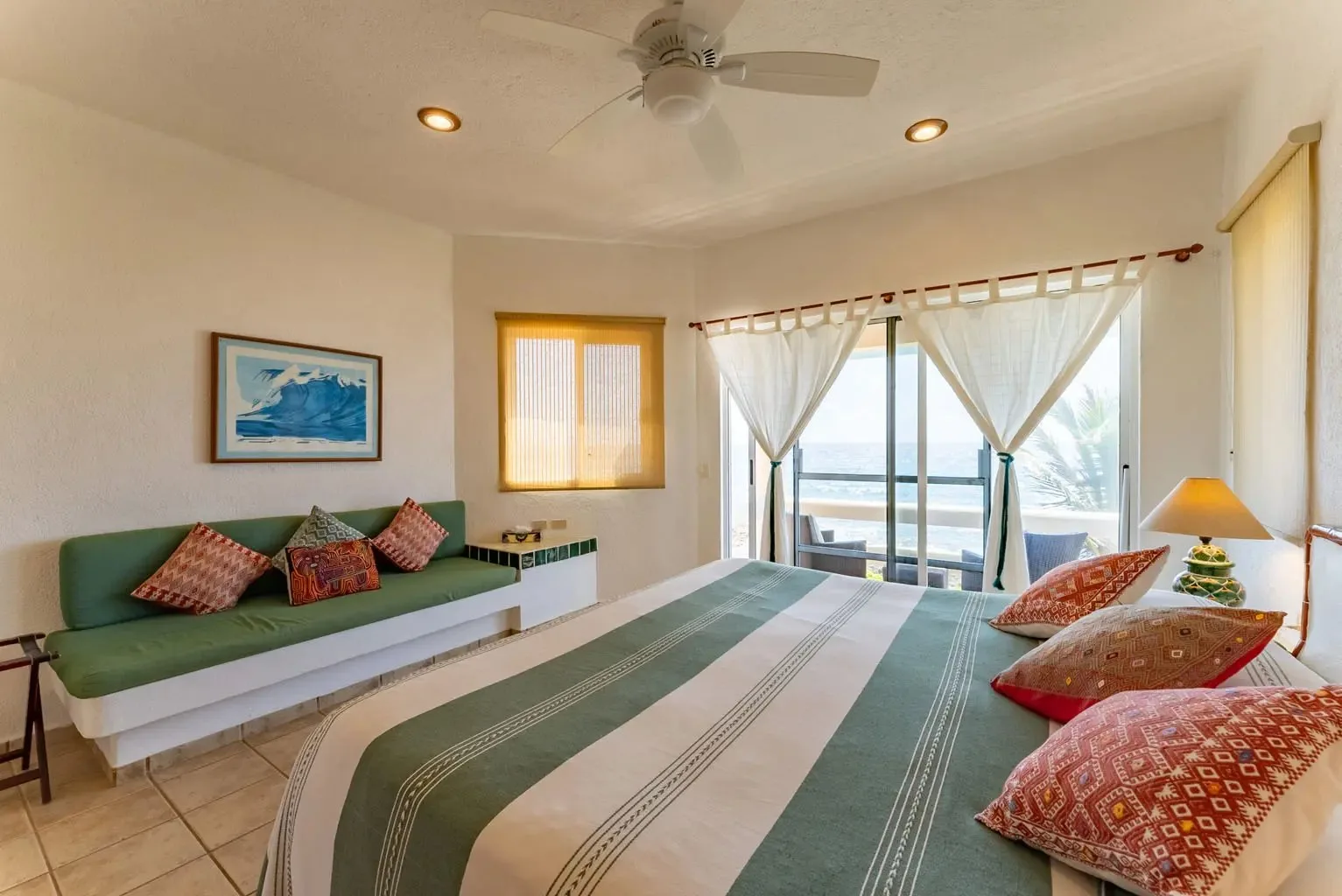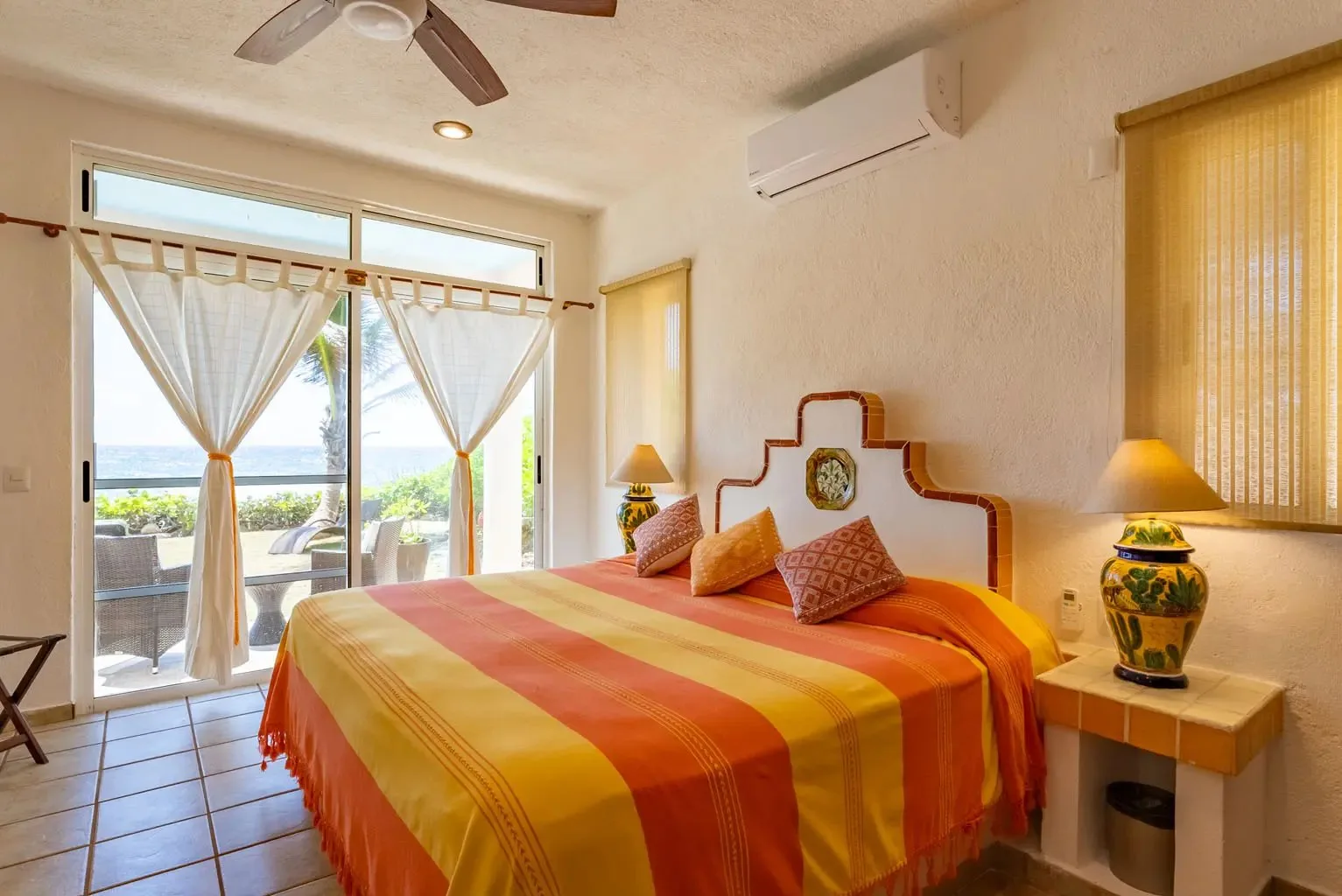This property offers guests stunning views of the Caribbean Sea from its large oceanfront living areas. Tastefully decorated with vibrant Mexican textile details, the villa is filled with natural sunlight. The poolside terrace and garden provide a perfect spot for a refreshing swim, shaded under a covered terrace that leads to the home's kitchen. Four main bedrooms offer beautiful ocean views, while a fifth bedroom facing the jungle also serves as a closed entertainment room.