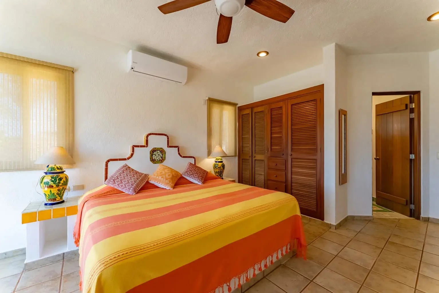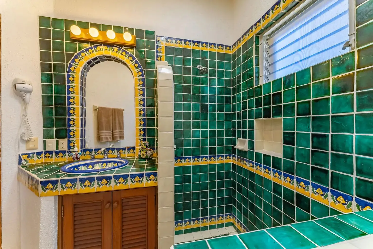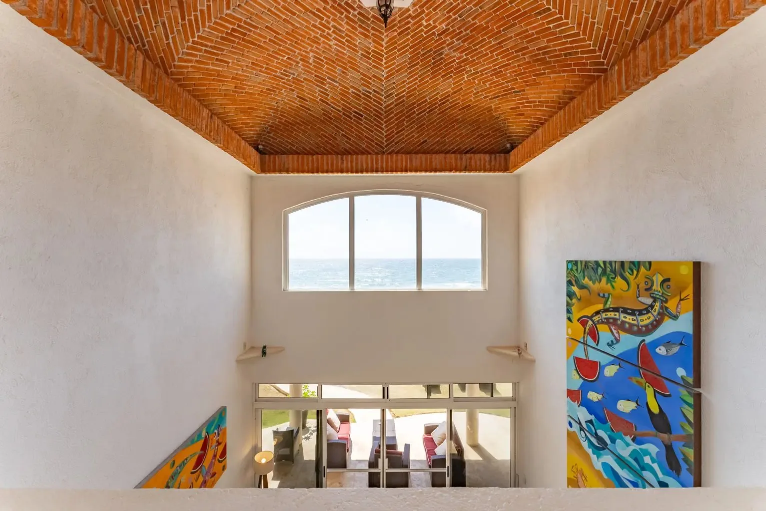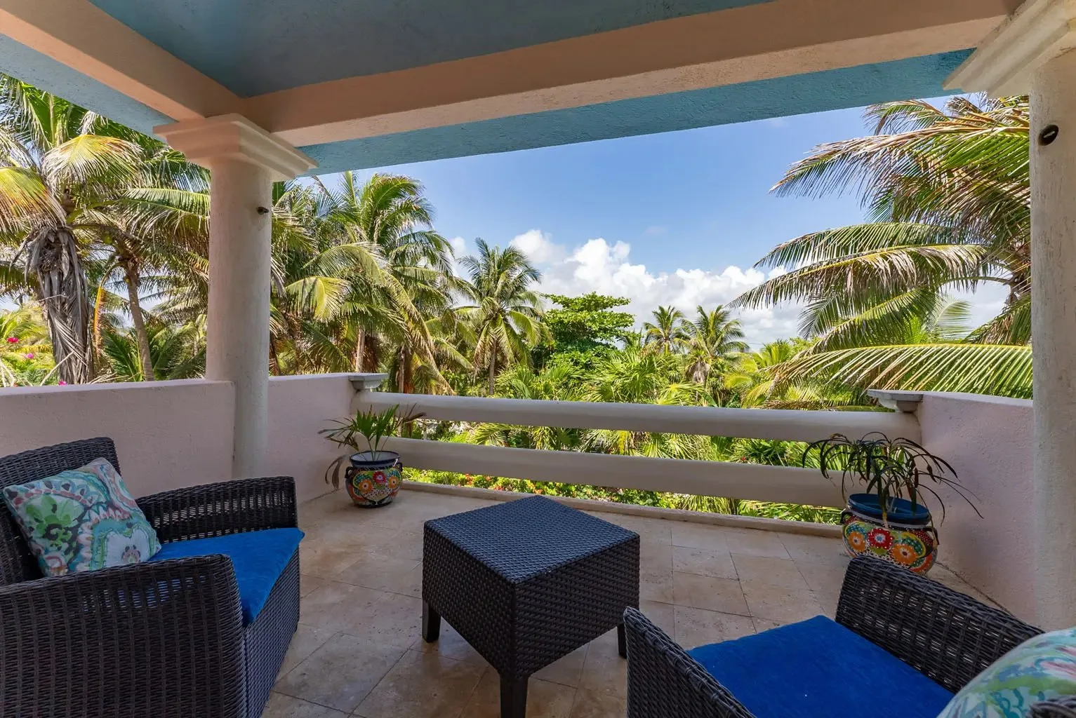 The villa is a unique creation designed and built by a noted Mexican-Yucatecan architect and visual artist. Casa Dos Palmas is an exceptional combination of Mayan architecture, featuring a three-story, handcrafted Mayan dome (a brick cupula) and original Talavera tiles in an authentic hacienda style. The furniture is handcrafted, and there are mahogany closets. Original art and murals are another highlight, as the house retains its two original commissioned murals. The property offers unparalleled 180-degree ocean and sunrise views with jungle surroundings by the pool. A locked owner's cabinet serves as a snack and liquor cabinet. Bedrooms include safes for securing personal items.