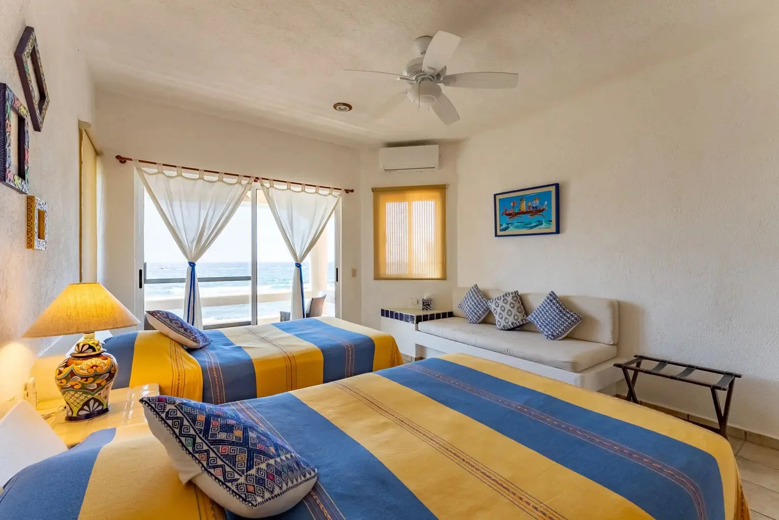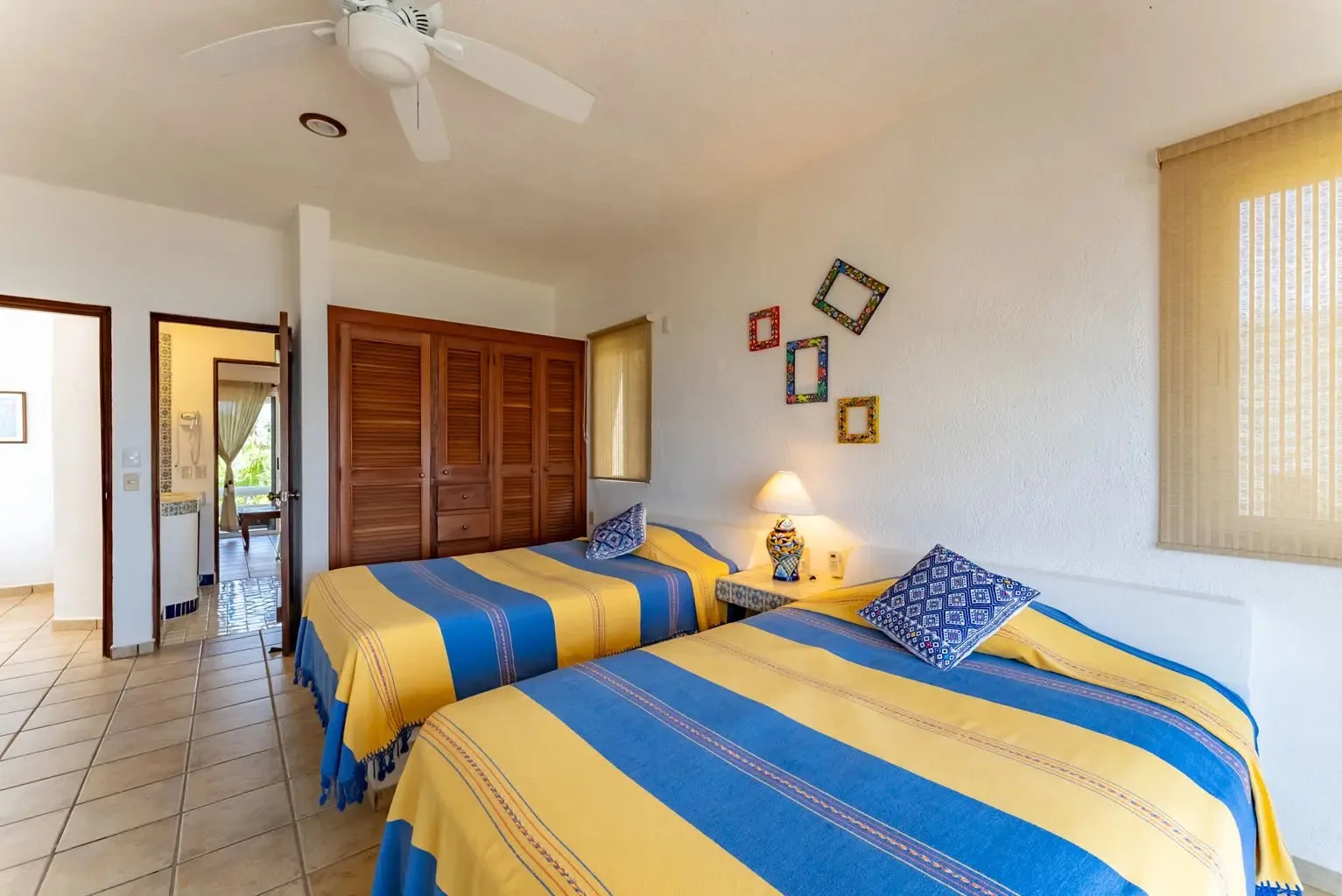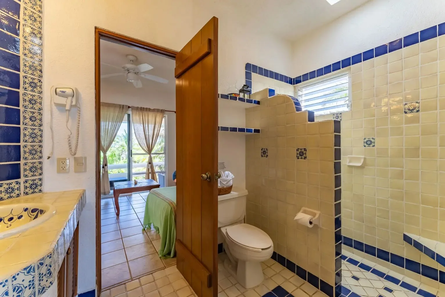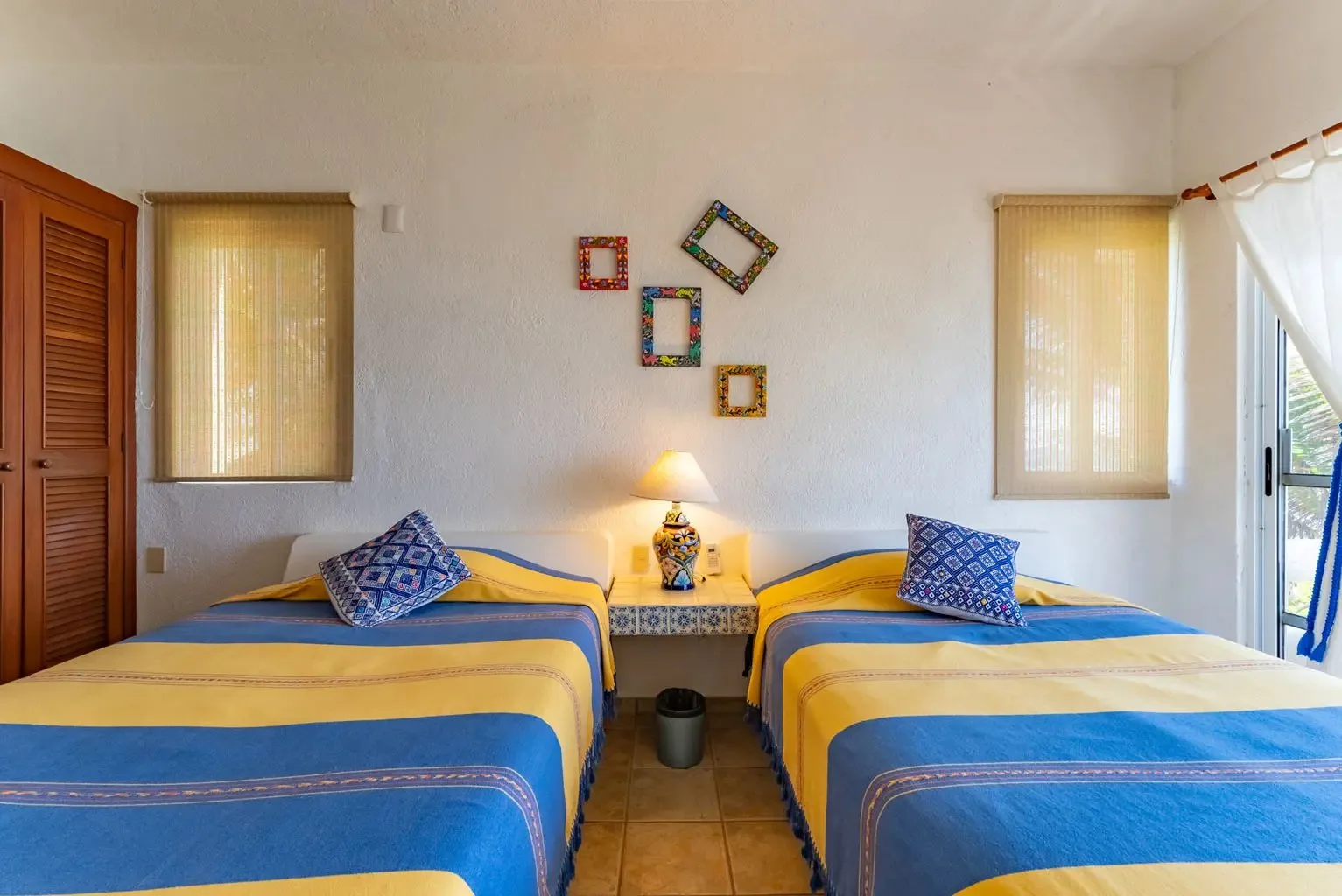 The villa is a unique creation designed and built by a noted Mexican-Yucatecan architect and visual artist. Casa Dos Palmas is an exceptional combination of Mayan architecture, featuring a three-story, handcrafted Mayan dome (a brick cupula) and original Talavera tiles in an authentic hacienda style. The furniture is handcrafted, and there are mahogany closets. Original art and murals are another highlight, as the house retains its two original commissioned murals. The property offers unparalleled 180-degree ocean and sunrise views with jungle surroundings by the pool. A locked owner's cabinet serves as a snack and liquor cabinet. Bedrooms include safes for securing personal items.