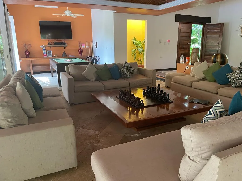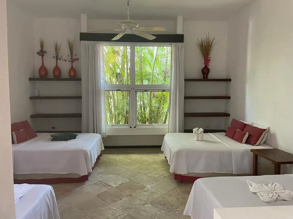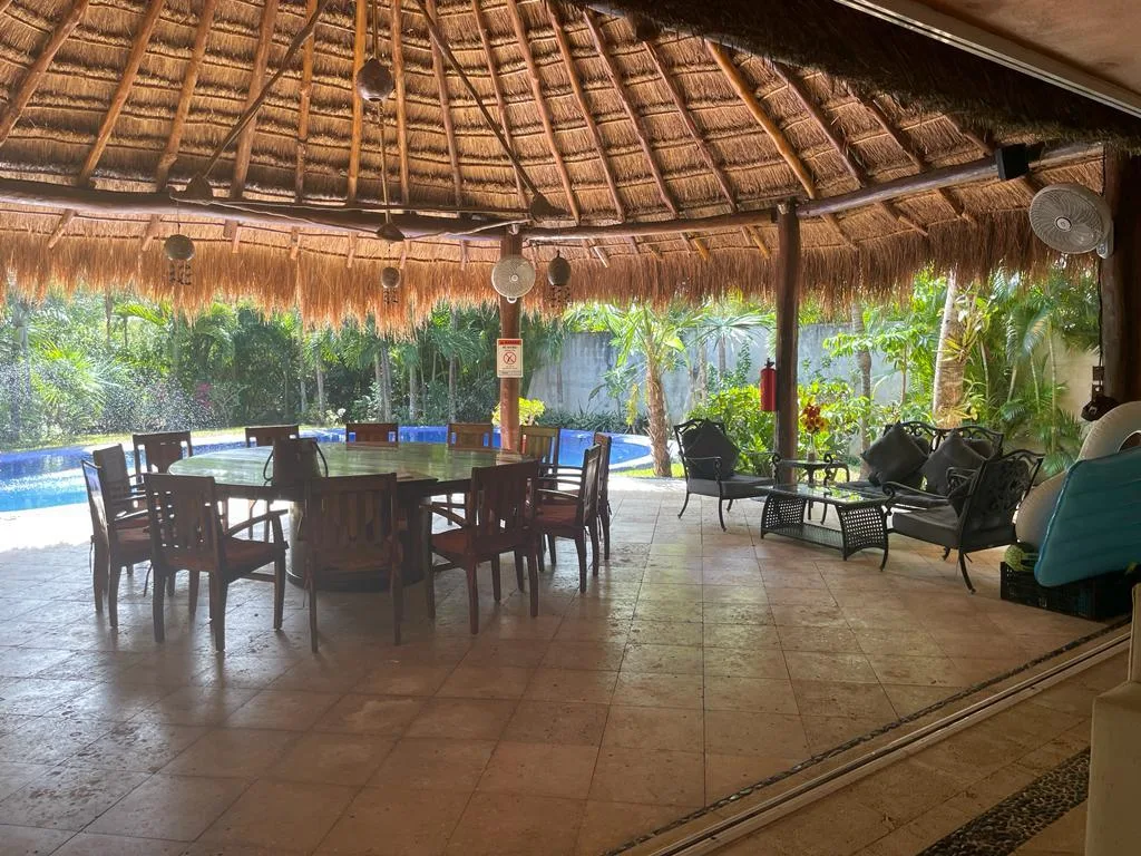 The interior provides over 400 square meters of space, featuring spacious social areas, a gourmet kitchen, a double-height living room, four en-suite bedrooms, a service bathroom, and a sauna. Outdoor amenities include a pool with a terrace and an open palapa for events or relaxation.