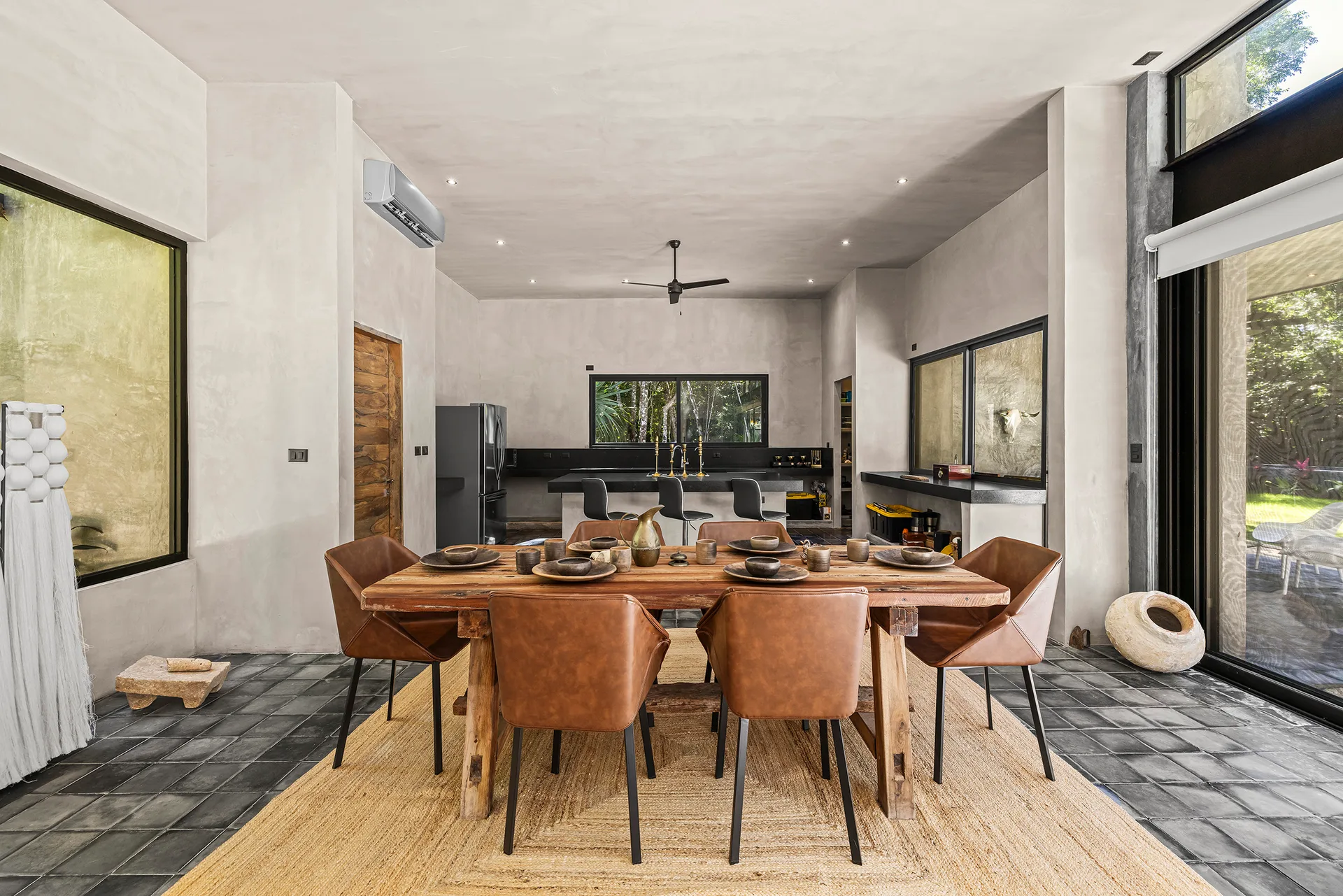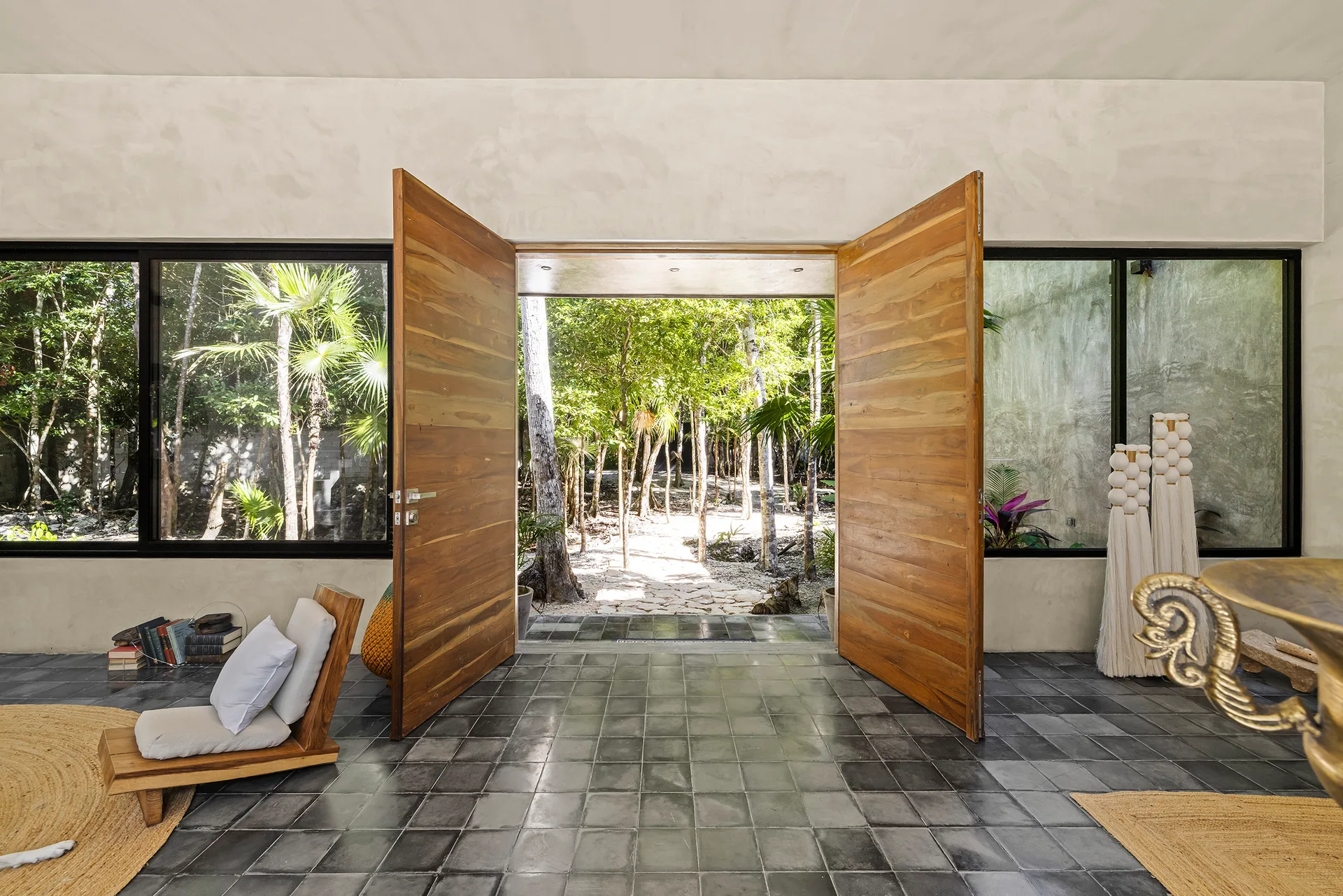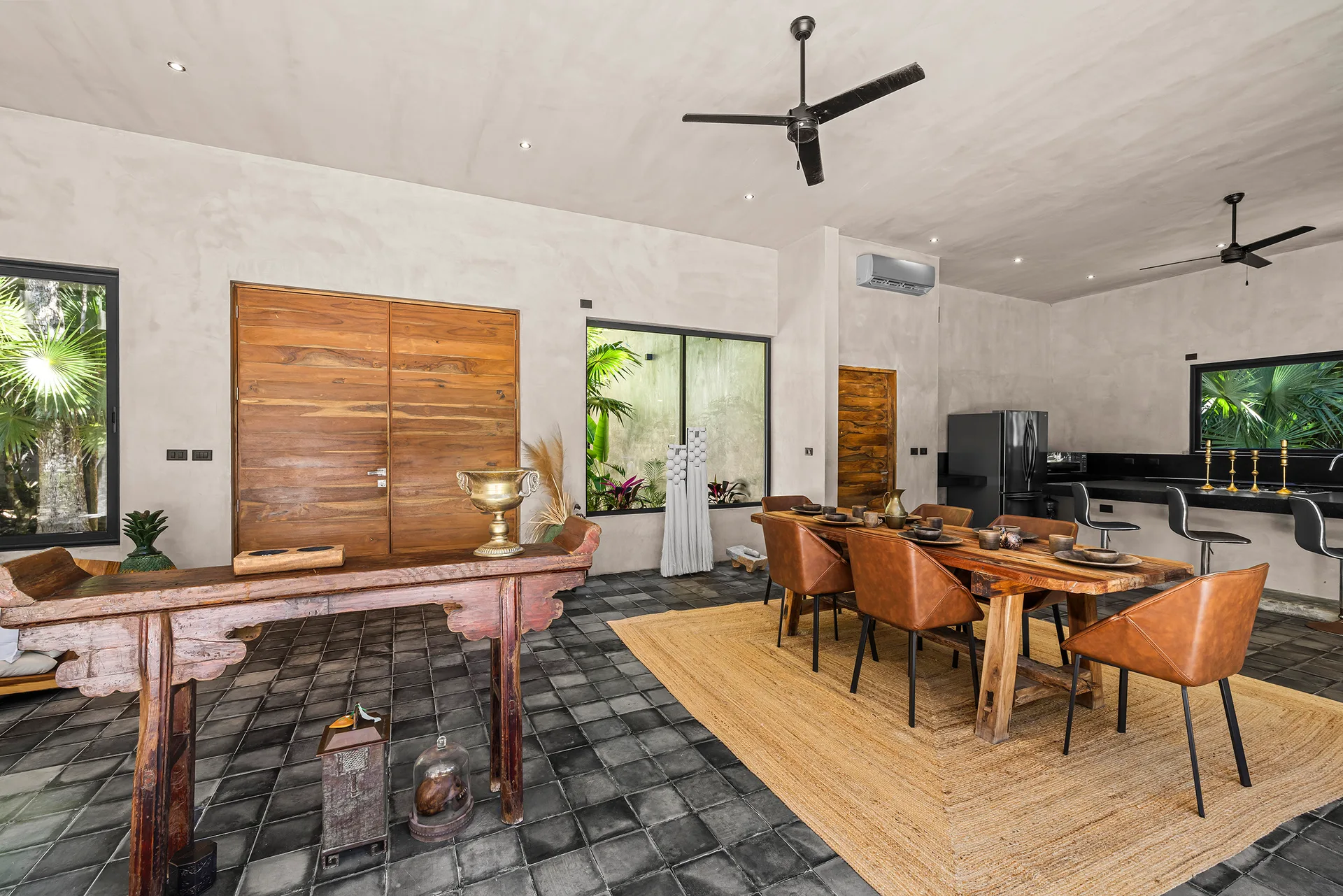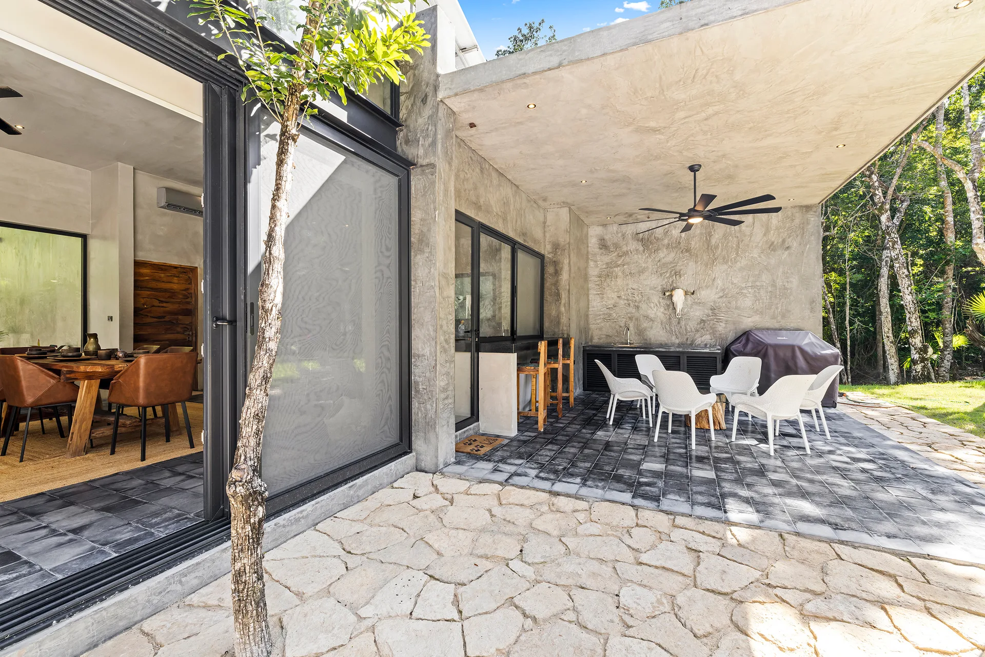 Upon entering through the massive wooden front doors, an open-concept living and dining area with cathedral ceilings serves as a central hub. The main living room seamlessly integrates with the outdoor living space via floor-to-ceiling sliding windows. The exterior patio features a covered outdoor living area with a pass-through bar to the kitchen and an outdoor sink beneath a large ceiling fan, overlooking a conversation area. This space can be screened in or enclosed with flowing outdoor curtains.
