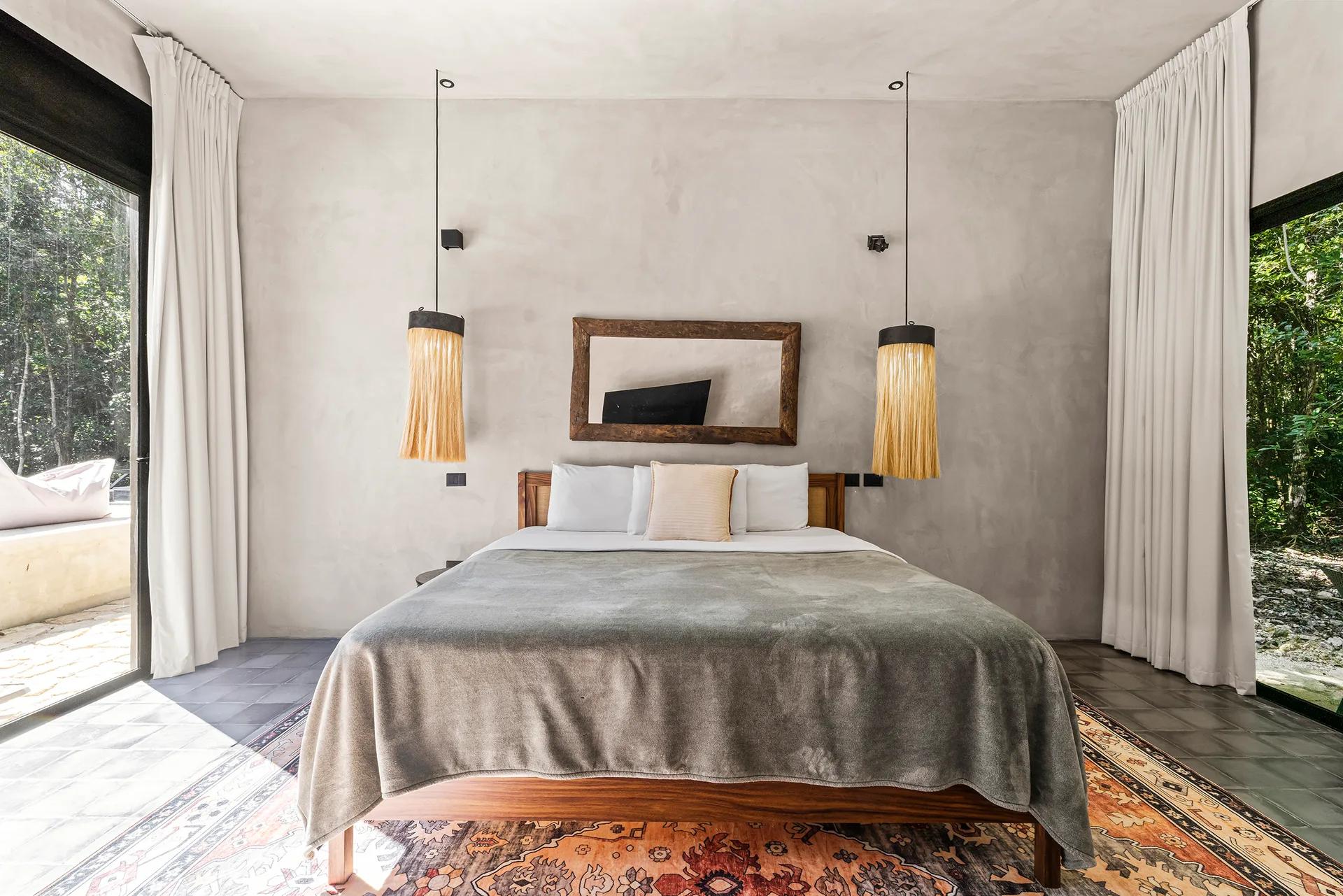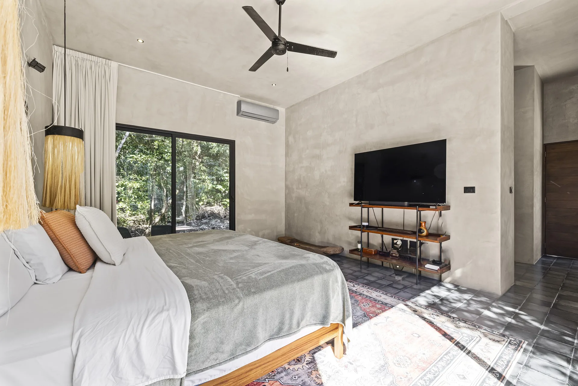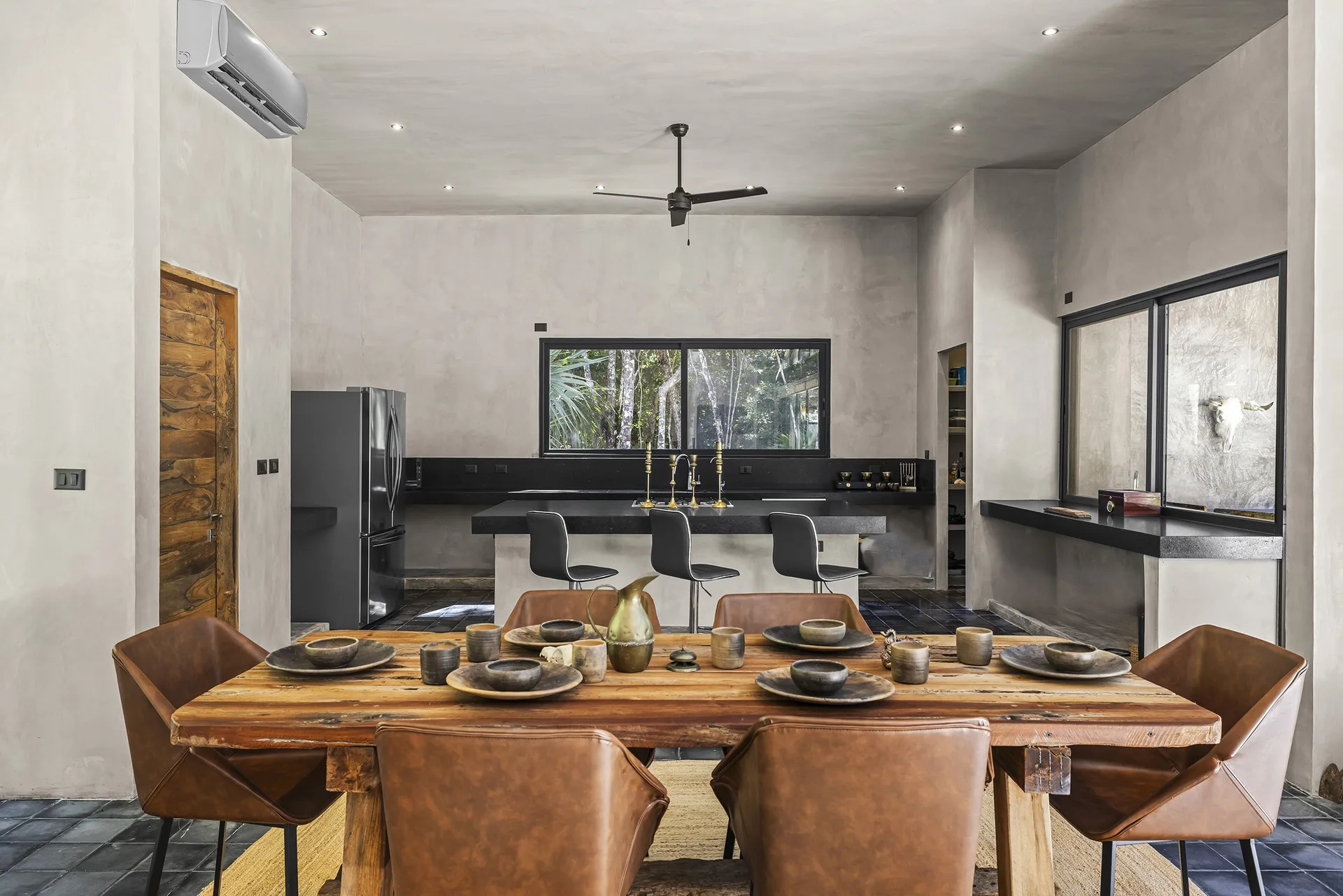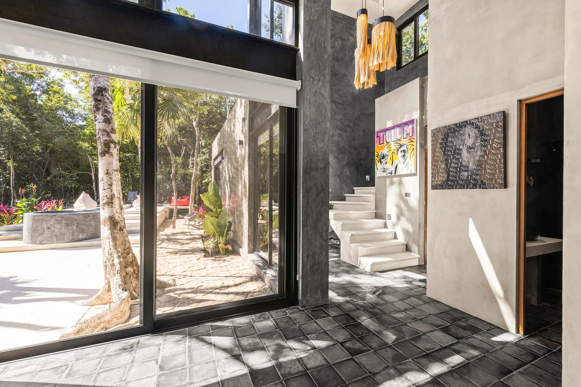 Upon entering through the massive wooden front doors, an open-concept living and dining area with cathedral ceilings serves as a central hub. The main living room seamlessly integrates with the outdoor living space via floor-to-ceiling sliding windows. The exterior patio features a covered outdoor living area with a pass-through bar to the kitchen and an outdoor sink beneath a large ceiling fan, overlooking a conversation area. This space can be screened in or enclosed with flowing outdoor curtains.