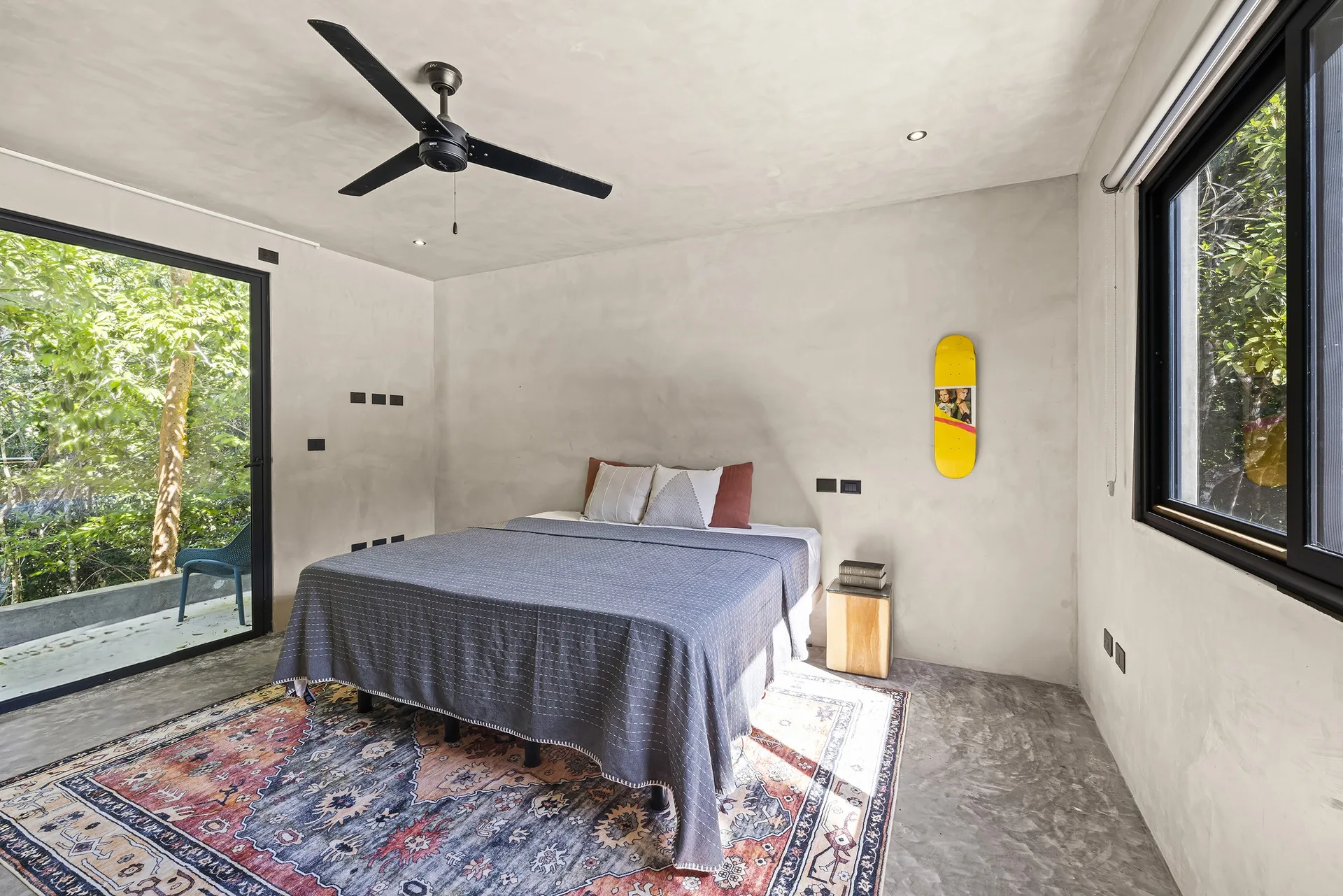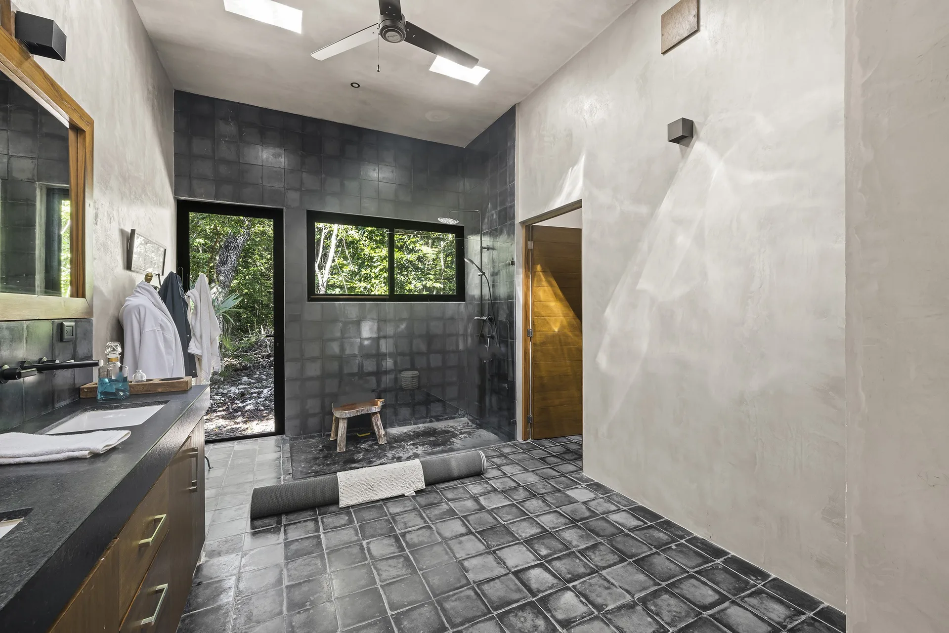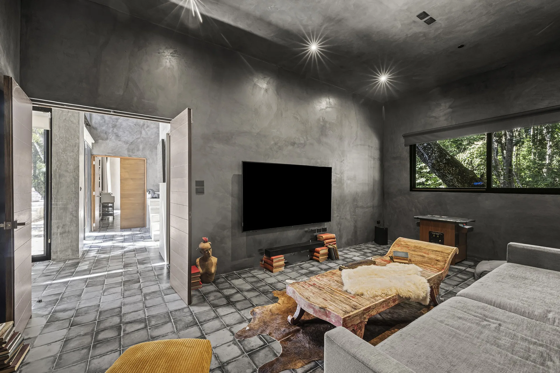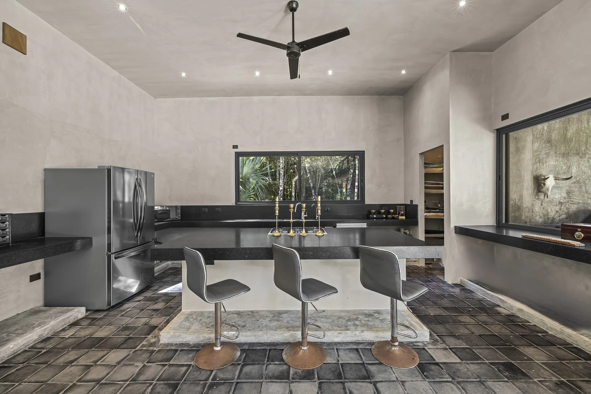 The home is entirely off-grid, powered by a sophisticated 17, 400W solar panel system with a 60kWh lithium-ion battery, and includes reverse osmosis filtered water. The property holds potential for a private cenote.