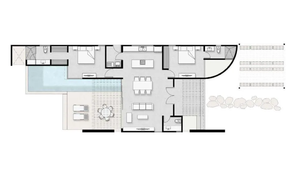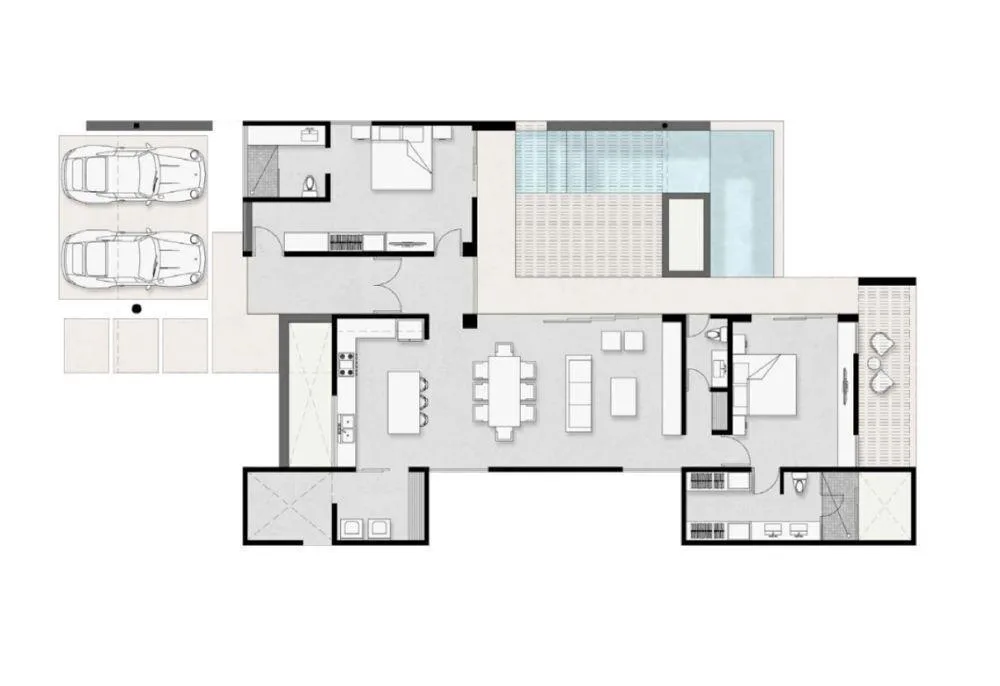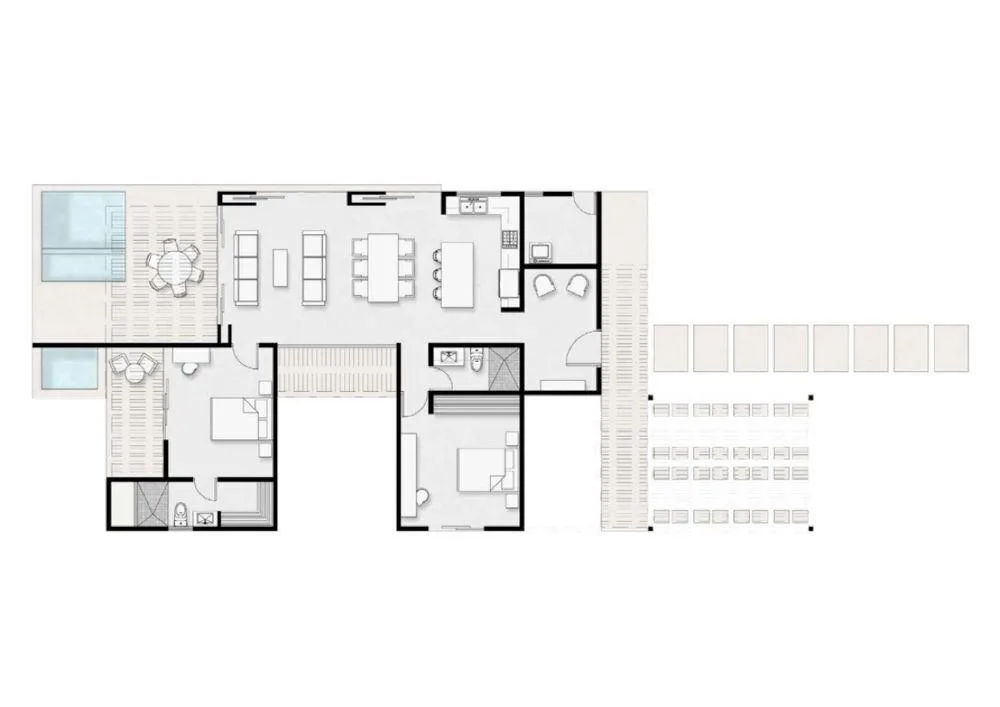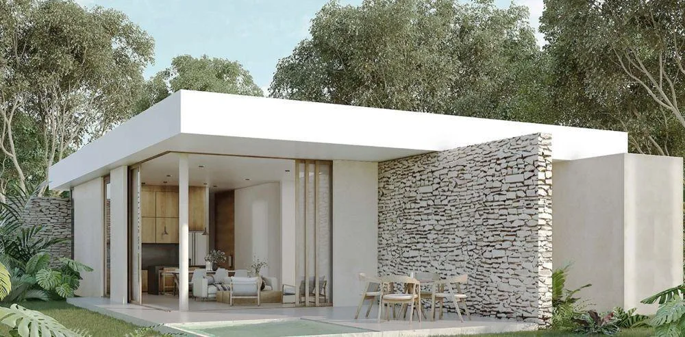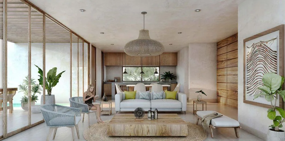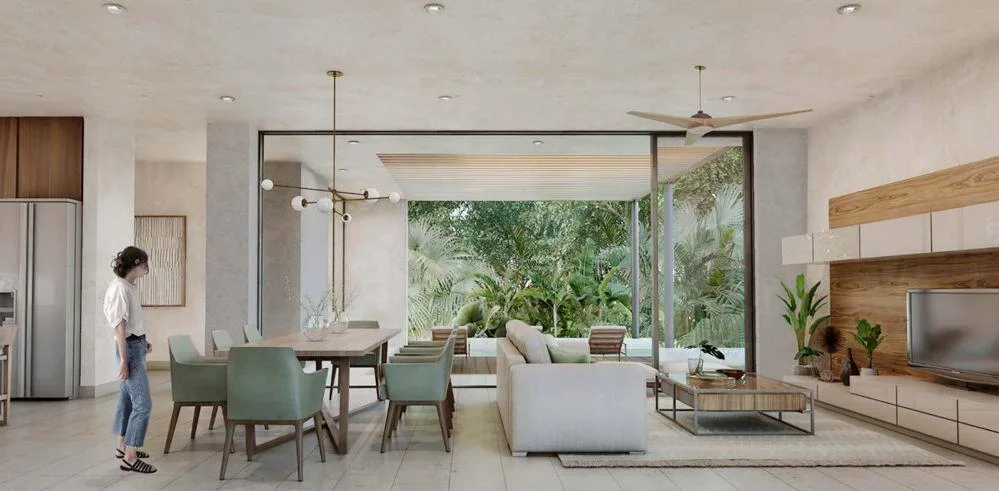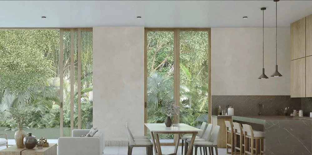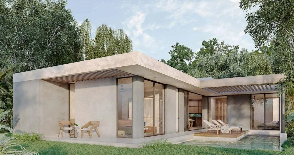 The homes are available in two-, three-, and four-bedroom configurations. They feature a spacious open concept layout with floor-to-ceiling windows. Each residence includes a full kitchen, a living room and dining area, and a back patio with a private pool and garden. Finishes include tile floors, ceiling fans, and air conditioning. The homes are sold unfurnished.