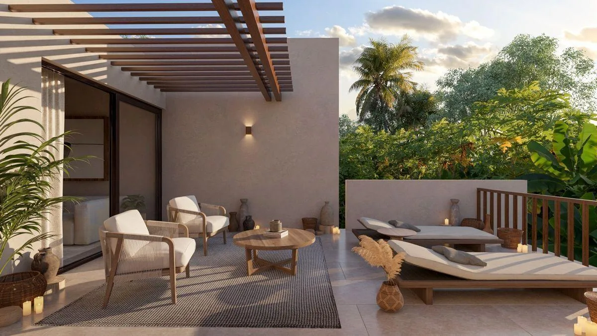 The sustainably designed villas are available in 2- and 3-bedroom configurations. Each features a spacious open floor plan with a kitchen island, a sun-filled living room, and a dining area. All residences open onto a covered terrace with a private pool and garden. The 3-bedroom villas include a large rooftop terrace with a sink and a bar area, providing space for outdoor dining and relaxation. The villas have tile floors and high-quality, durable finishes, and are unfurnished but equipped with air conditioning.