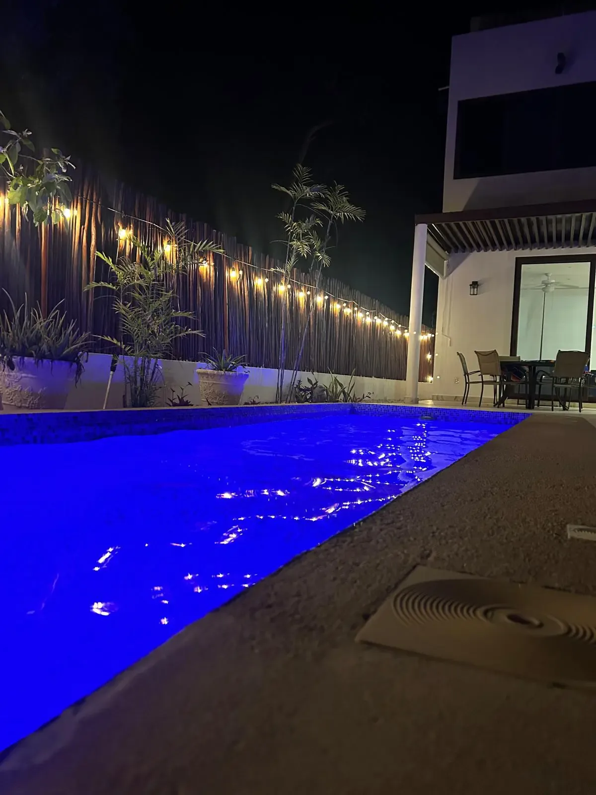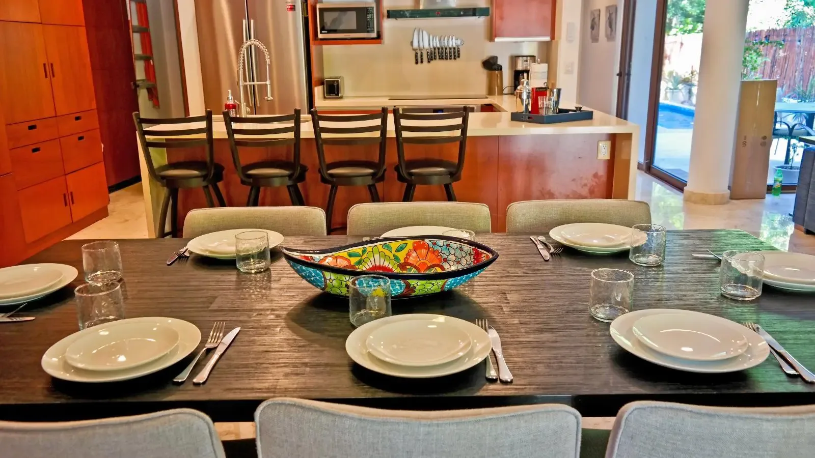 The private backyard features a heated swimming pool and an outdoor dining area. The property is equipped with 32 solar panels for energy efficiency.