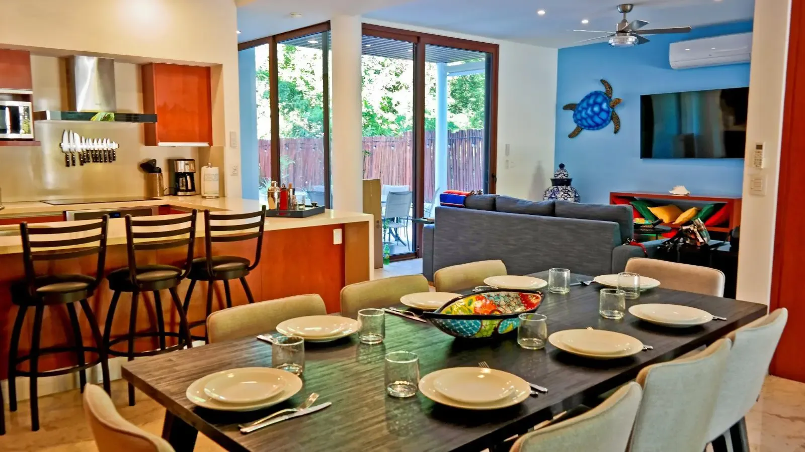 The villa is situated in a prime location between Playa del Carmen and Tulum. It is approximately 5 minutes from Akumal Beach, 10 minutes from Tulum town, 23 minutes from Tulum International Airport, 25 minutes from Playa del Carmen downtown, and about 1 hour and 15 minutes from Cancún International Airport. The Akumal area is known for its turquoise bays, swimmable beaches, and a sea turtle sanctuary.