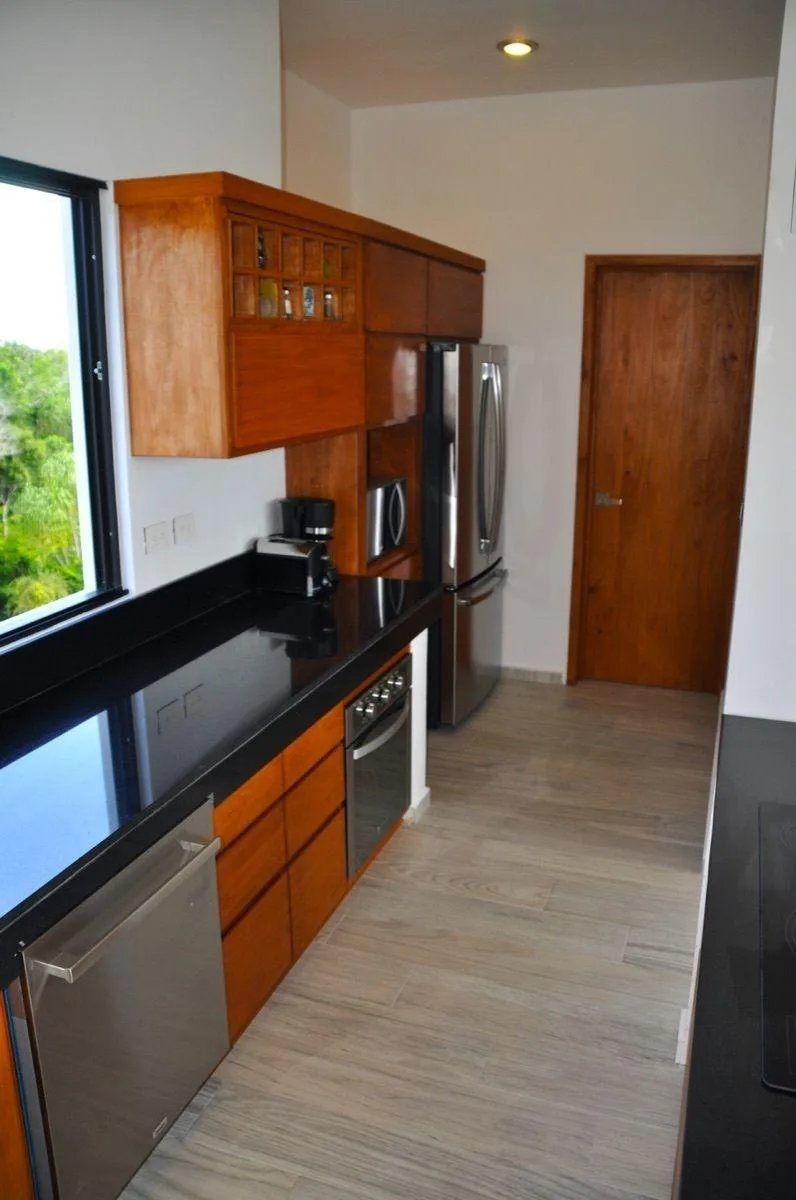 The modern duplex-style residence features 3 bedrooms and 3. 5 bathrooms on each level. An open floor plan includes kitchens and living areas that open to balconies overlooking the private pool. The kitchens are equipped with an island and appliances including a refrigerator, microwave, dishwasher, oven, and stove with hood. Interior features include hardwood floors, a washer and dryer, and parking for three vehicles.