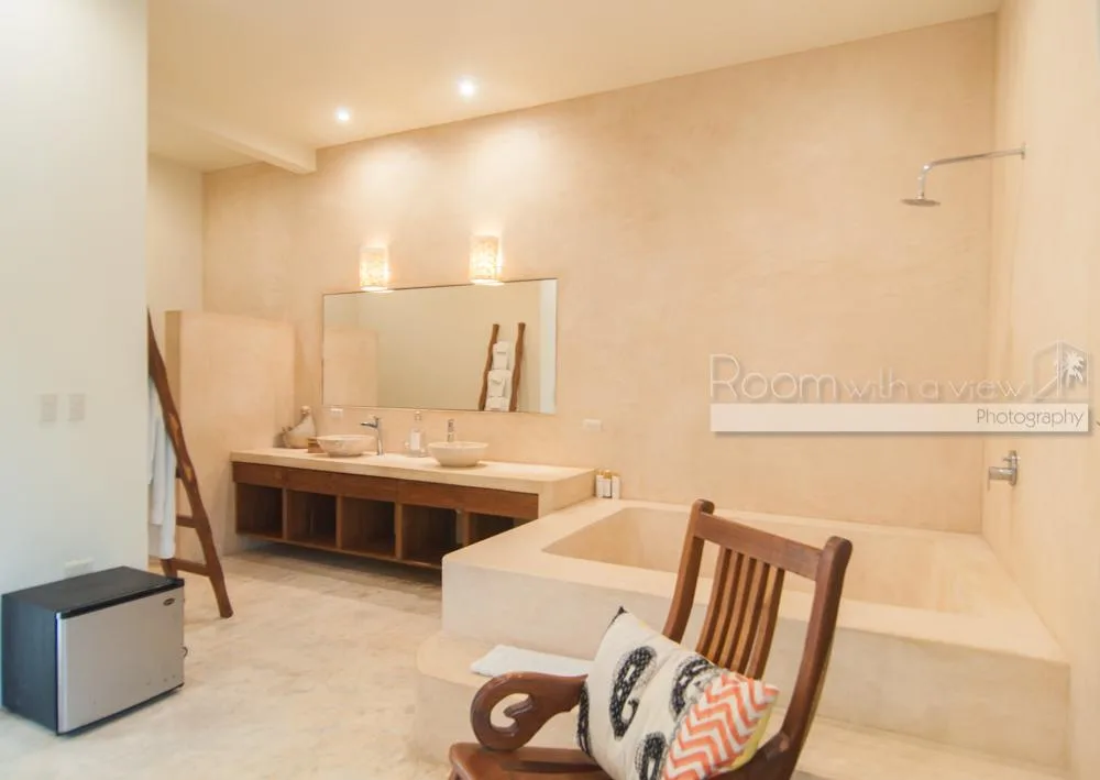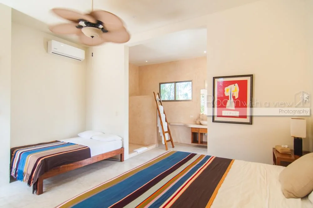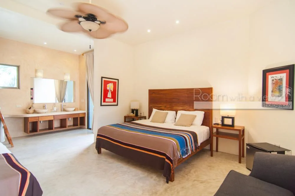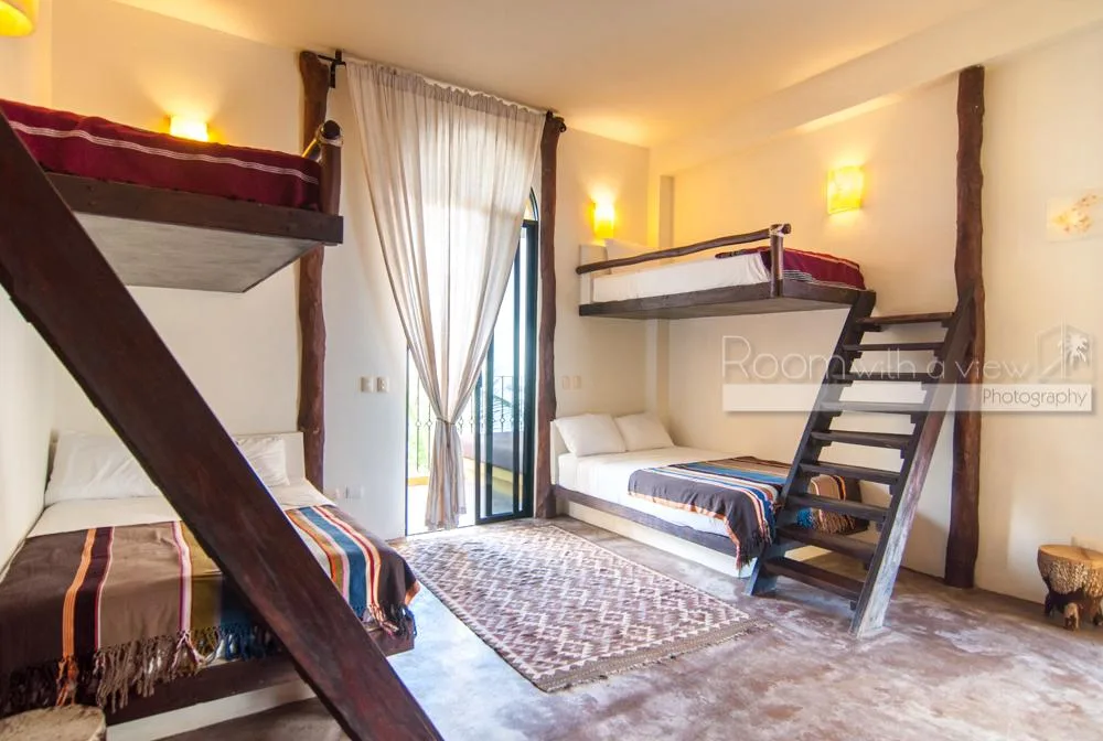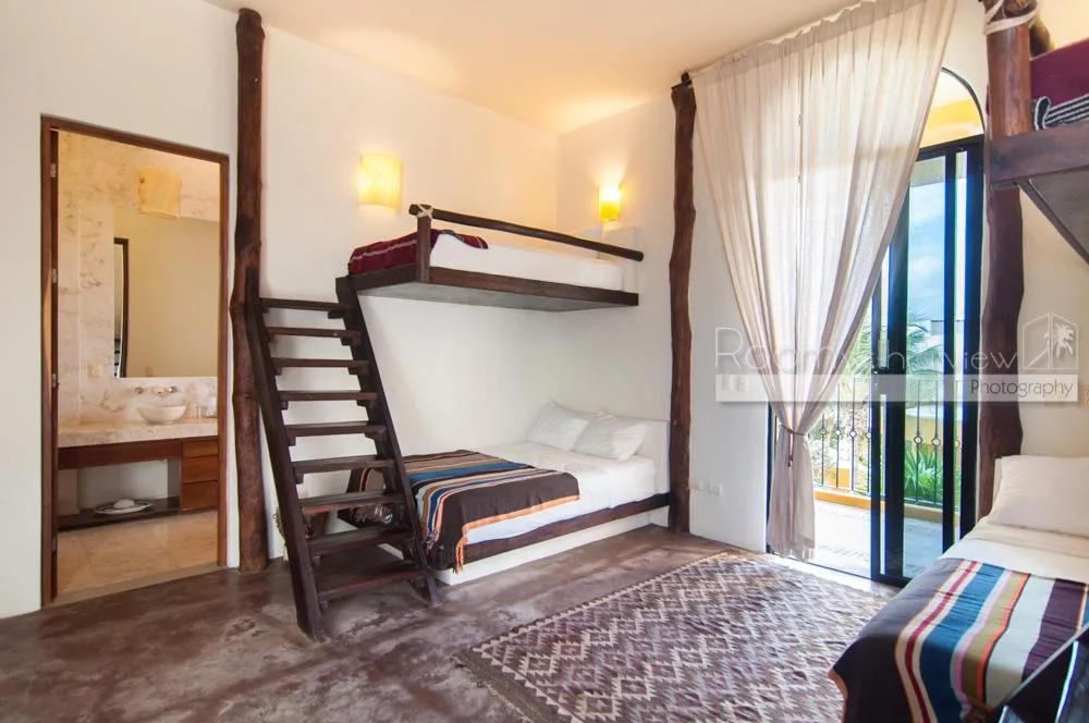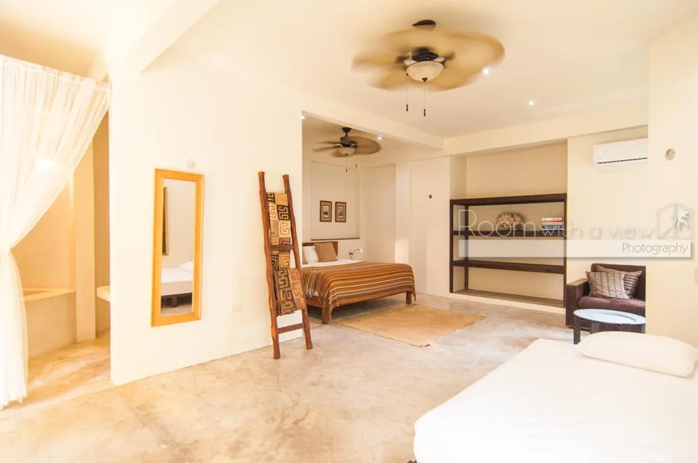 Each suite spans 250 to 300 square feet and includes a plush king-size bed, luxurious linens, and an en-suite bathroom. The 1, 000-square-foot master suite has a private balcony with panoramic ocean views. Five serene garden suites are nestled within lush jungle surroundings and feature hanging hammocks, private balconies, and handcrafted chukum bathrooms. An additional suite offers bunk beds, ocean views, and an outdoor sleeping area overlooking the jungle.