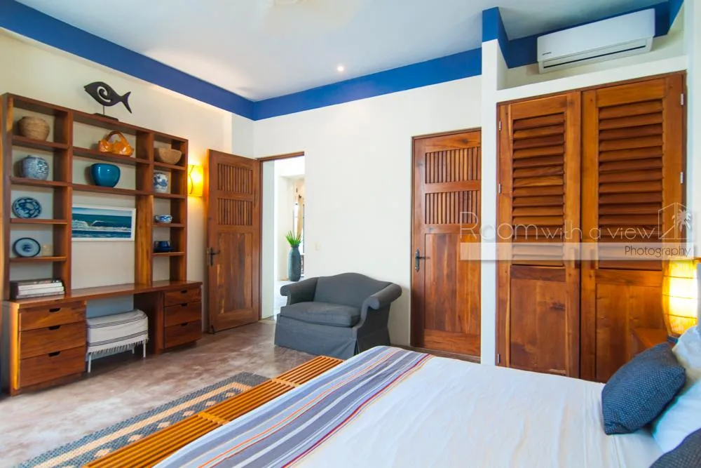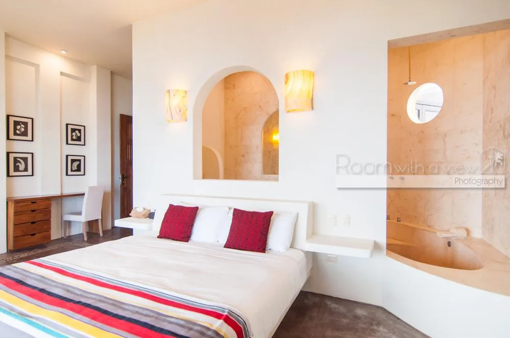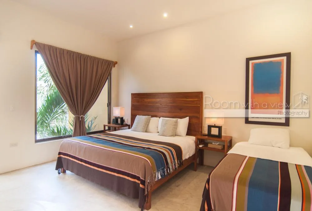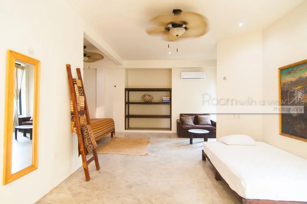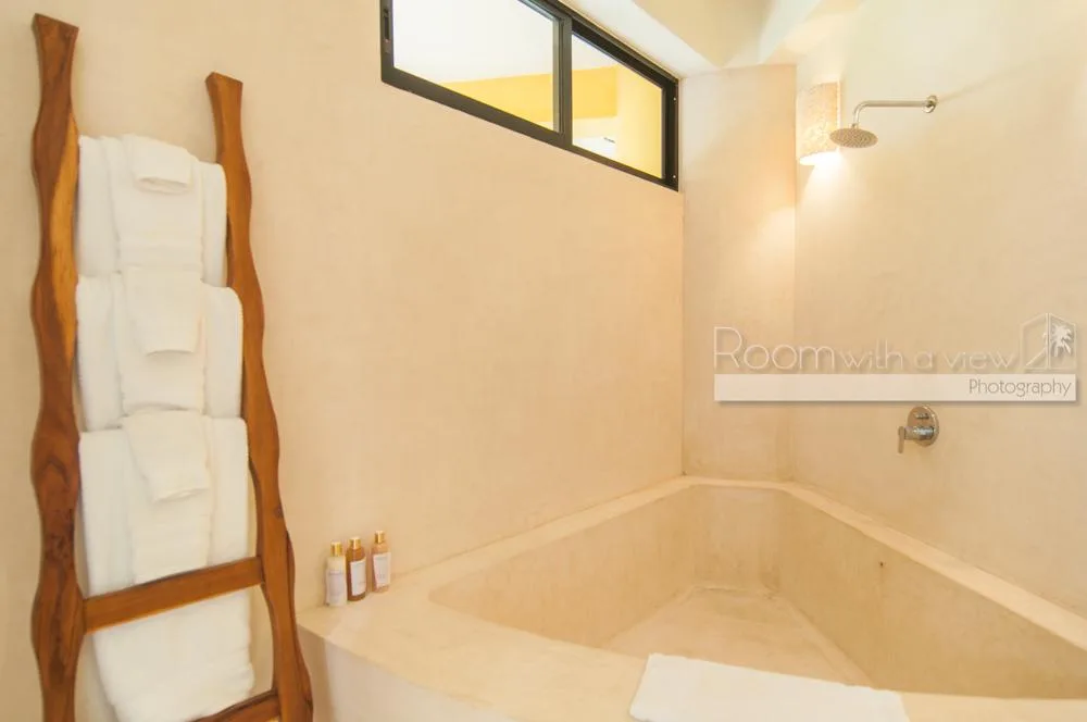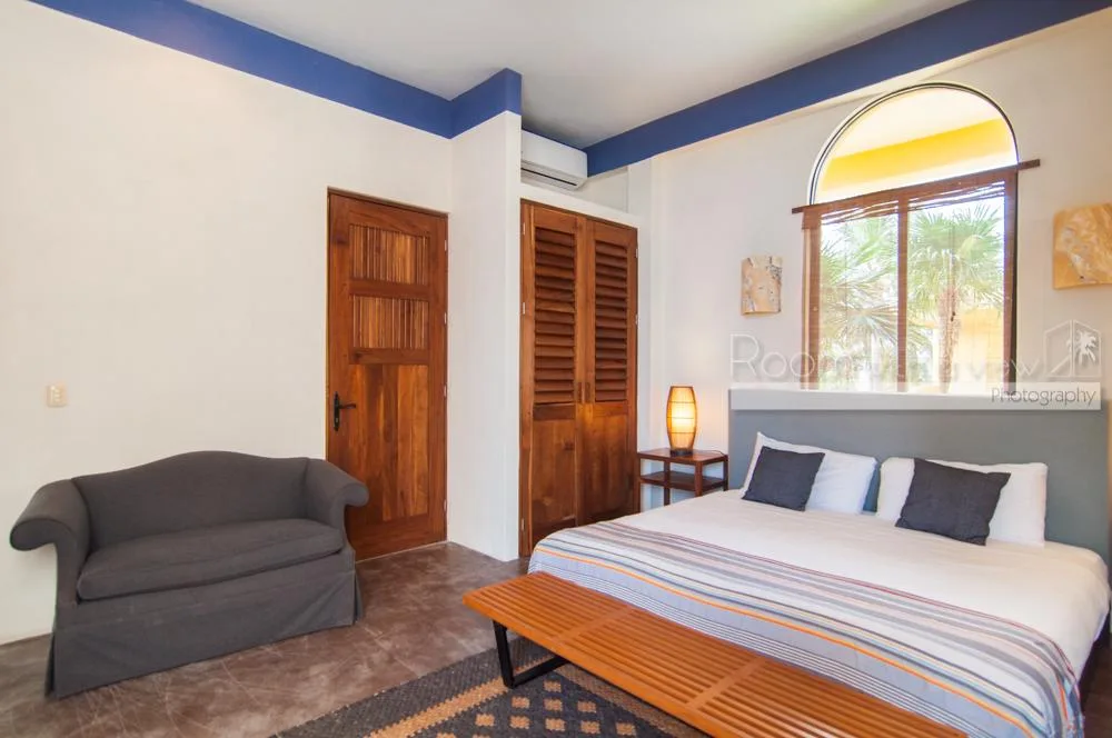 Each suite spans 250 to 300 square feet and includes a plush king-size bed, luxurious linens, and an en-suite bathroom. The 1, 000-square-foot master suite has a private balcony with panoramic ocean views. Five serene garden suites are nestled within lush jungle surroundings and feature hanging hammocks, private balconies, and handcrafted chukum bathrooms. An additional suite offers bunk beds, ocean views, and an outdoor sleeping area overlooking the jungle.