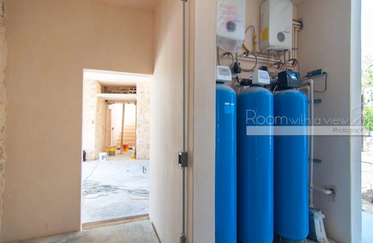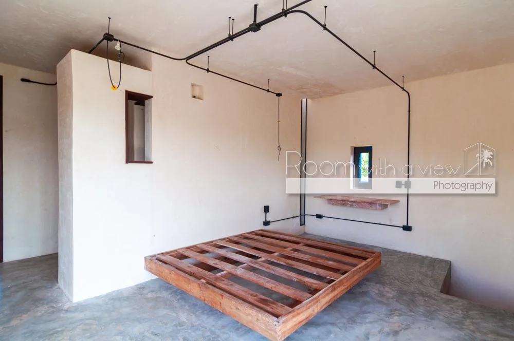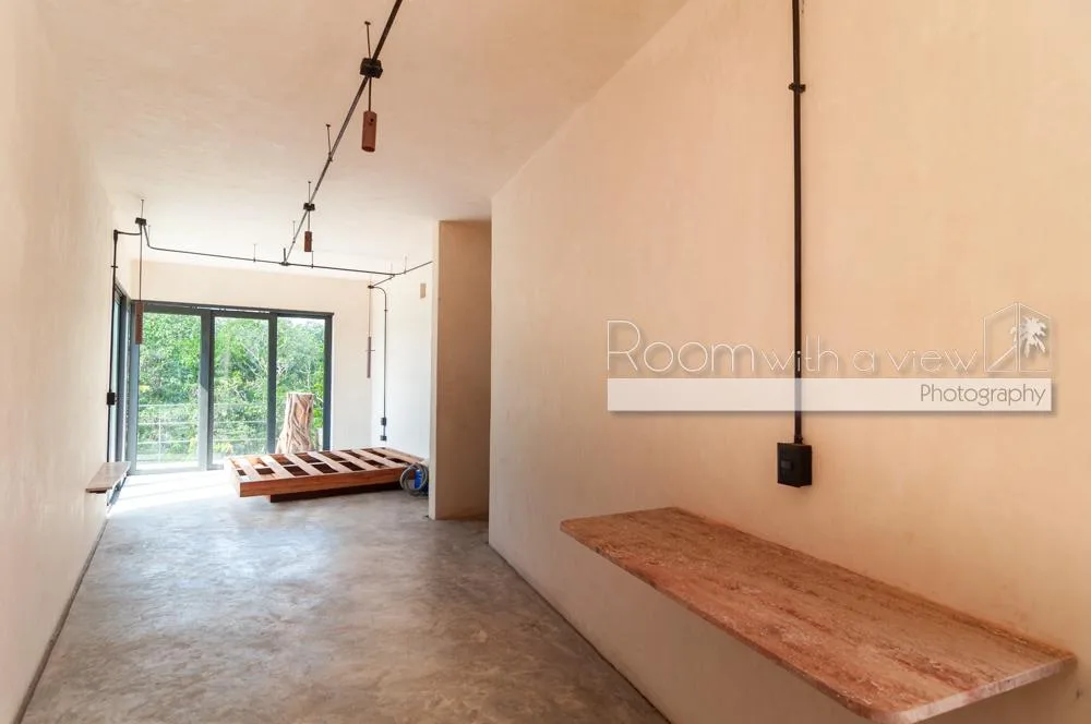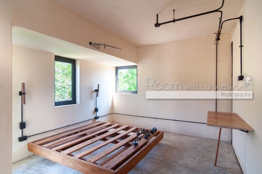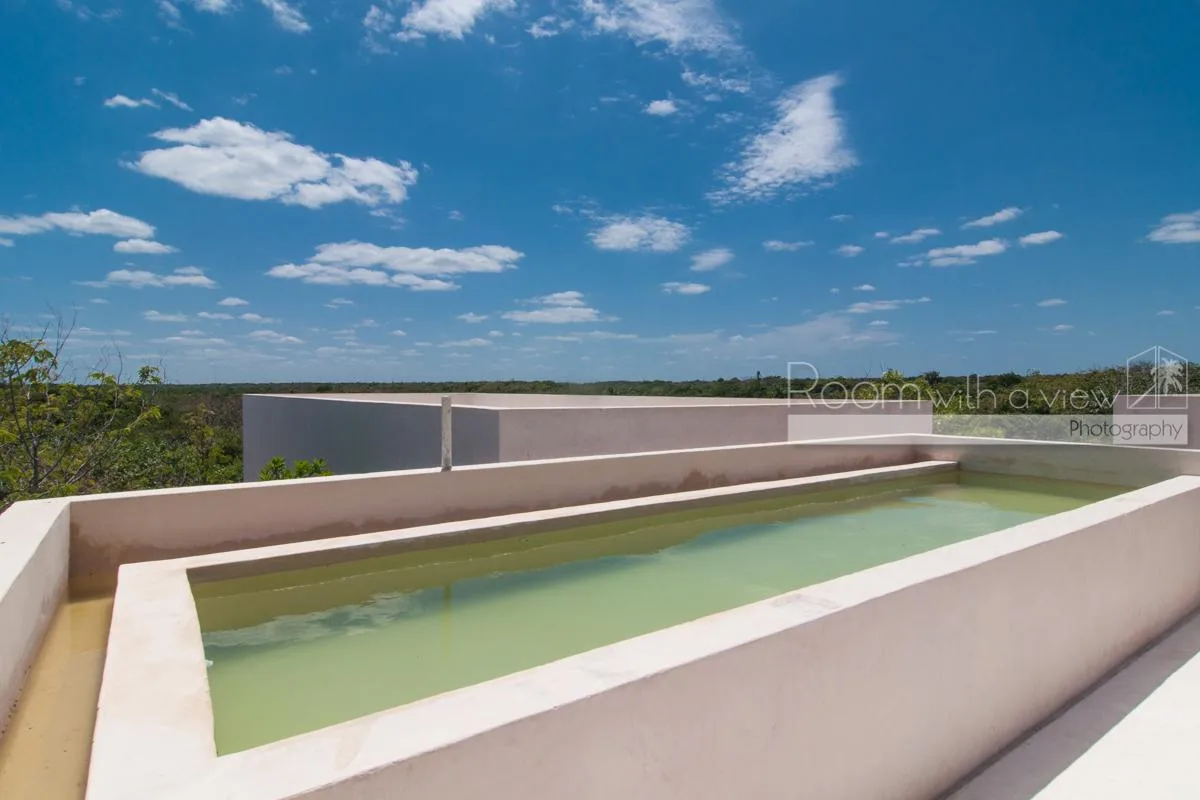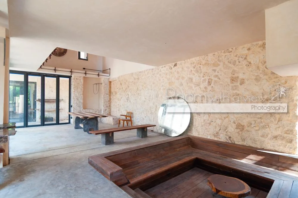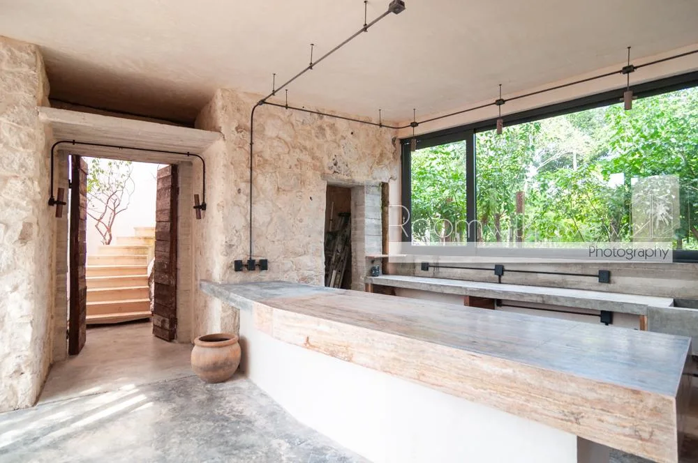 The home includes a balcony, a covered patio, and a private swimming pool. It is furnished and comes with three parking spaces. Thoughtful details include handcrafted hardwood furnishings, natural stone sinks, and copper lighting throughout.